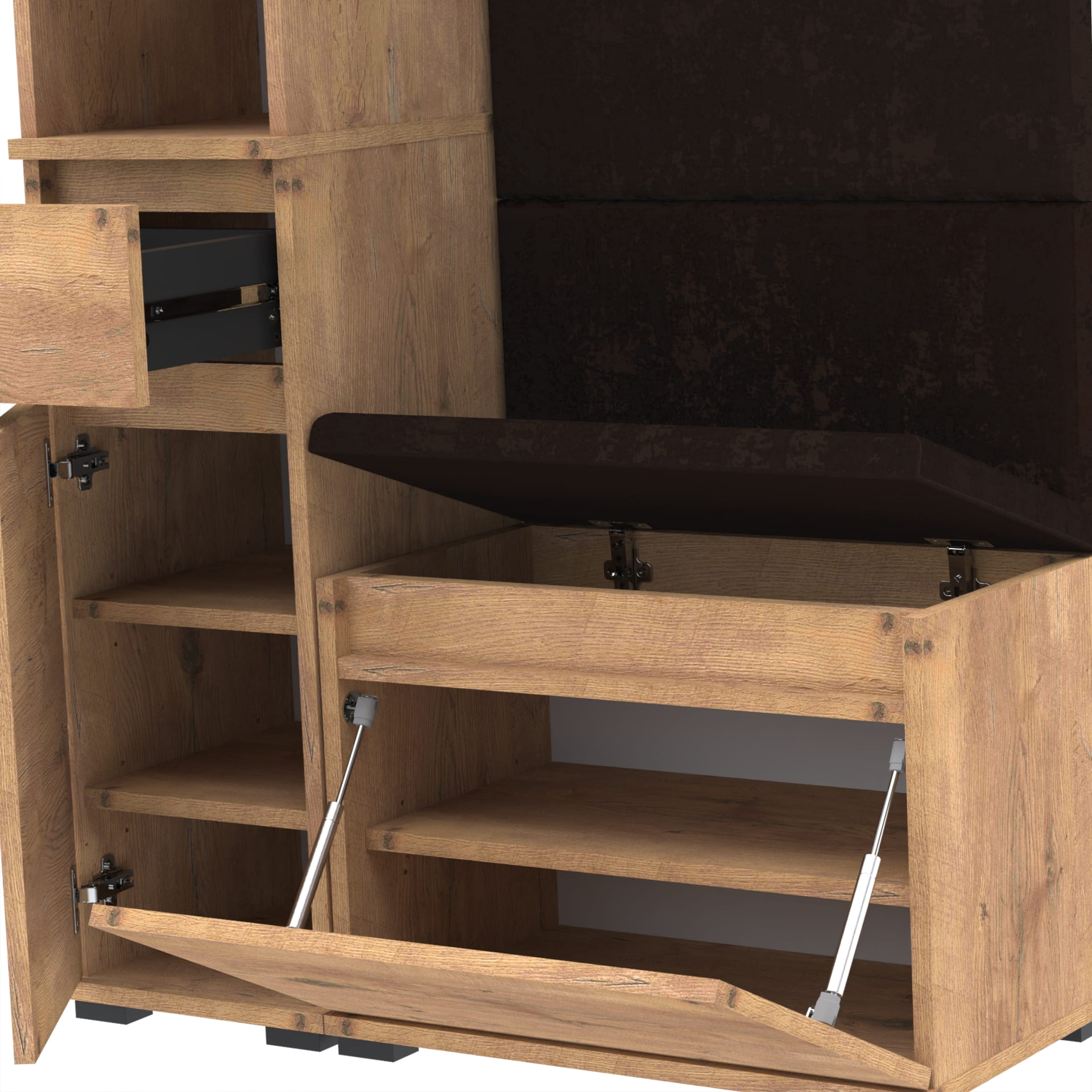 Materiał: Płyta meblowa 18mm, obrzeże ABS, okucia metalowe, nóżki 2cm z plastiku, haki wieszaka metalowe, siłowniki gazowe.