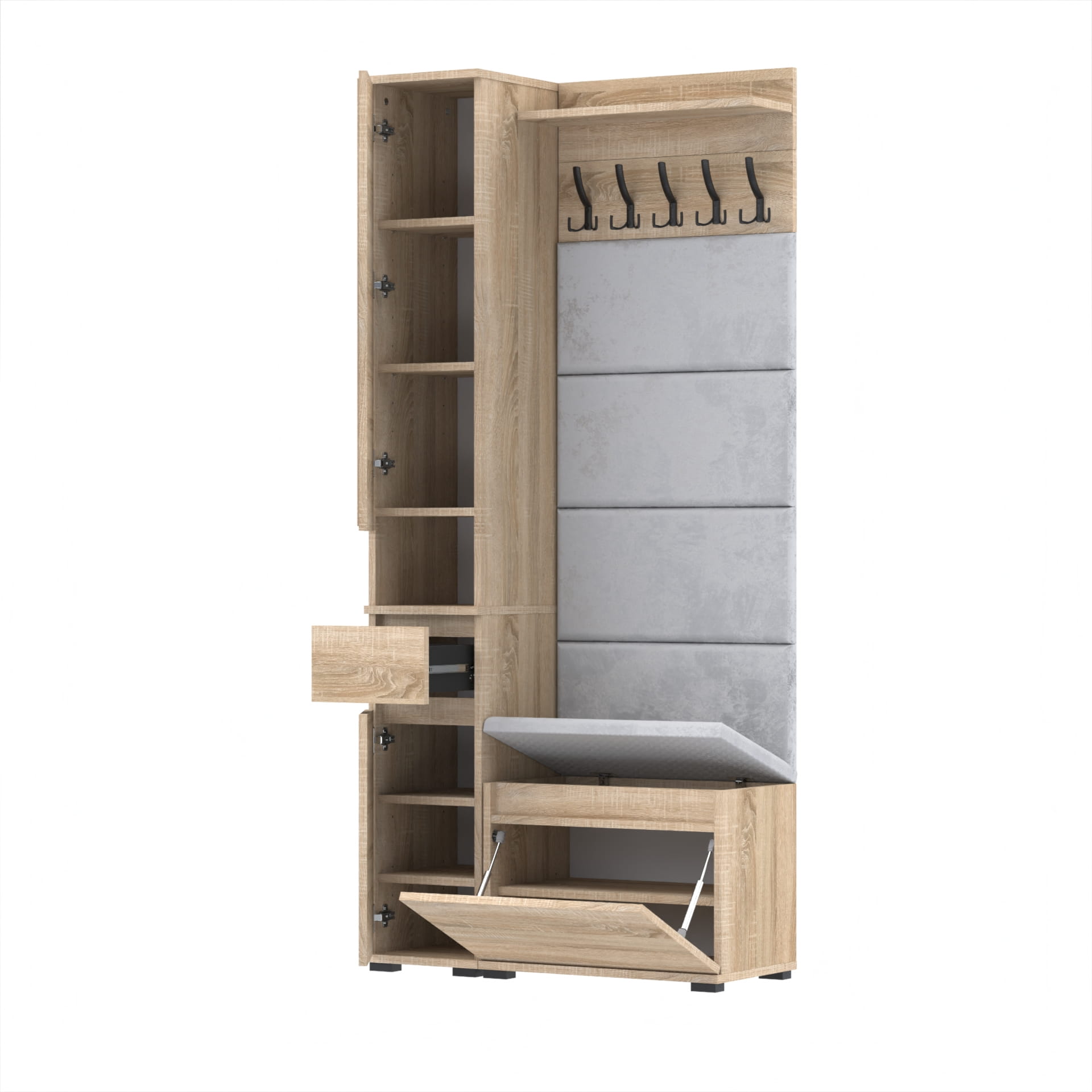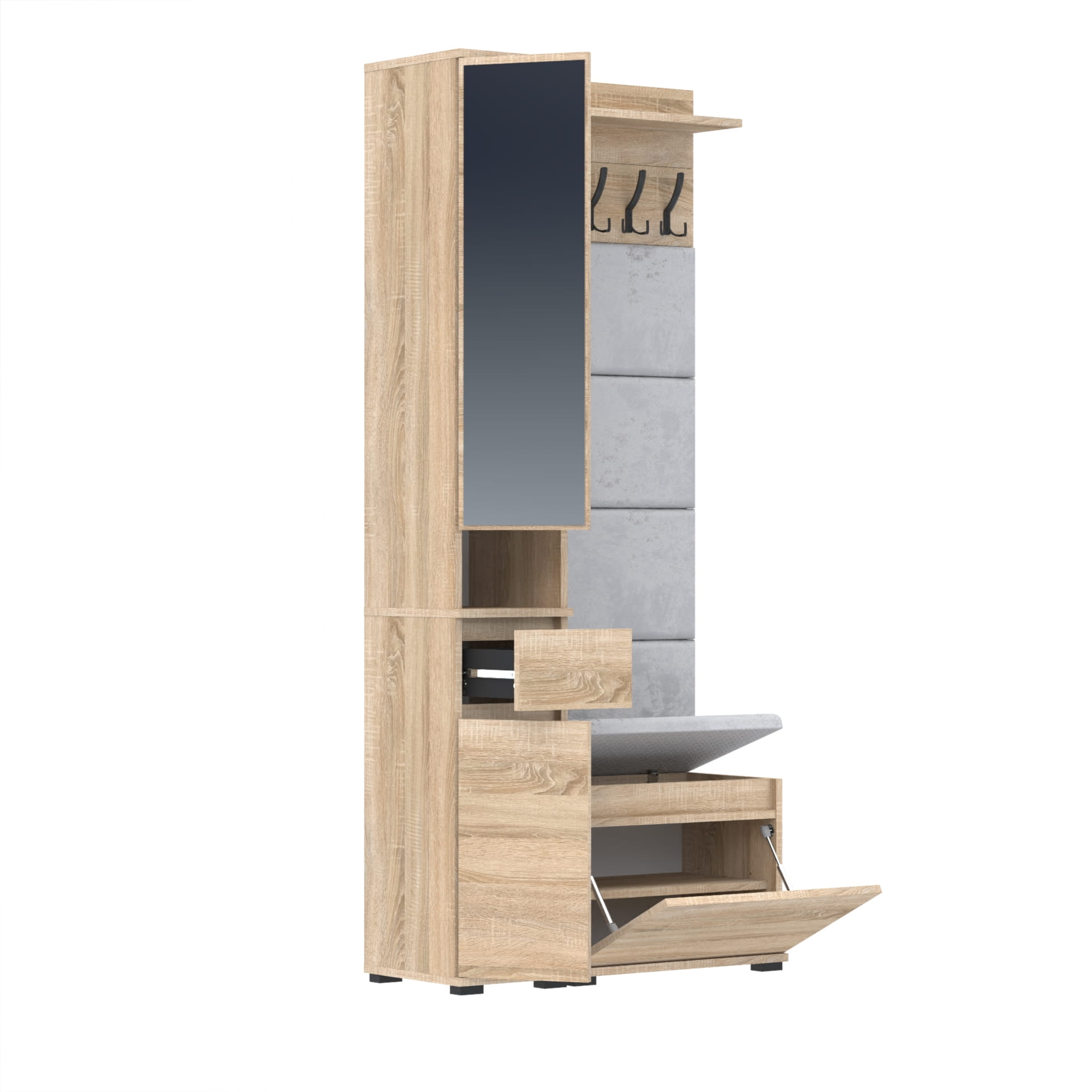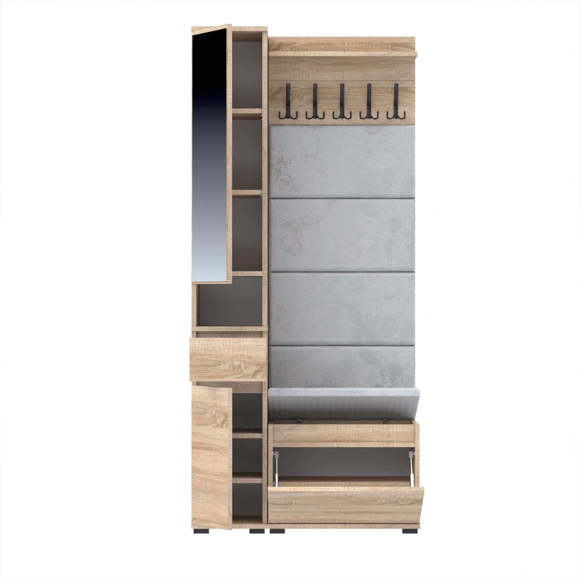 Oferujemy elegancką garderobę do przedpokoju, która łączy w sobie nowoczesny design i funkcjonalność. Nasza garderoba jest idealnym rozwiązaniem do każdego wnętrza, zapewniając nie tylko miejsce na odzież wierzchnią, ale także przestrzeń do przechowywania butów i innych akcesoriów.