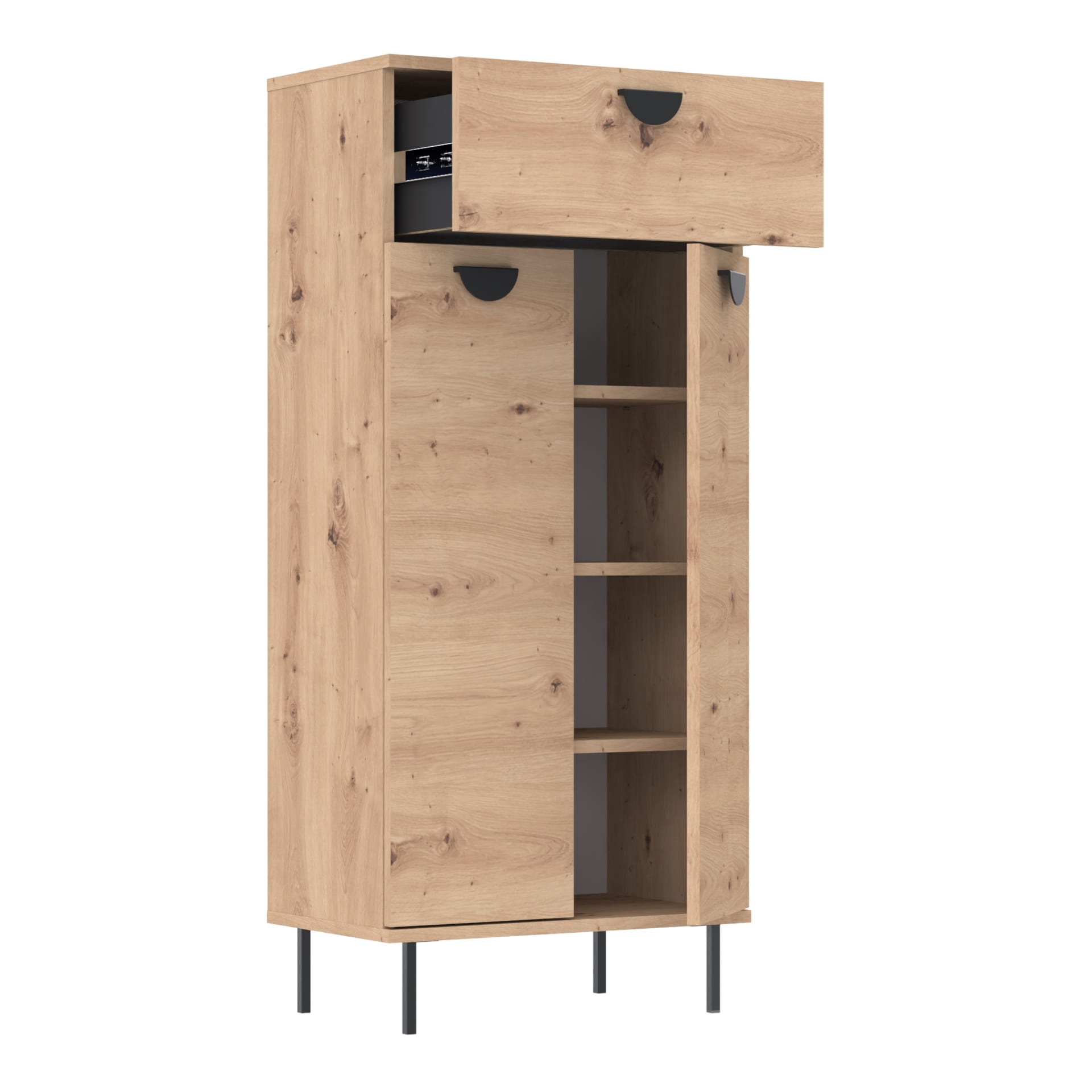 Komoda zawiera szufladę z twardym dnem, który nie ugina się pod ciężarem przedmiotów oraz trzy poziomy z regulowanymi półkami.