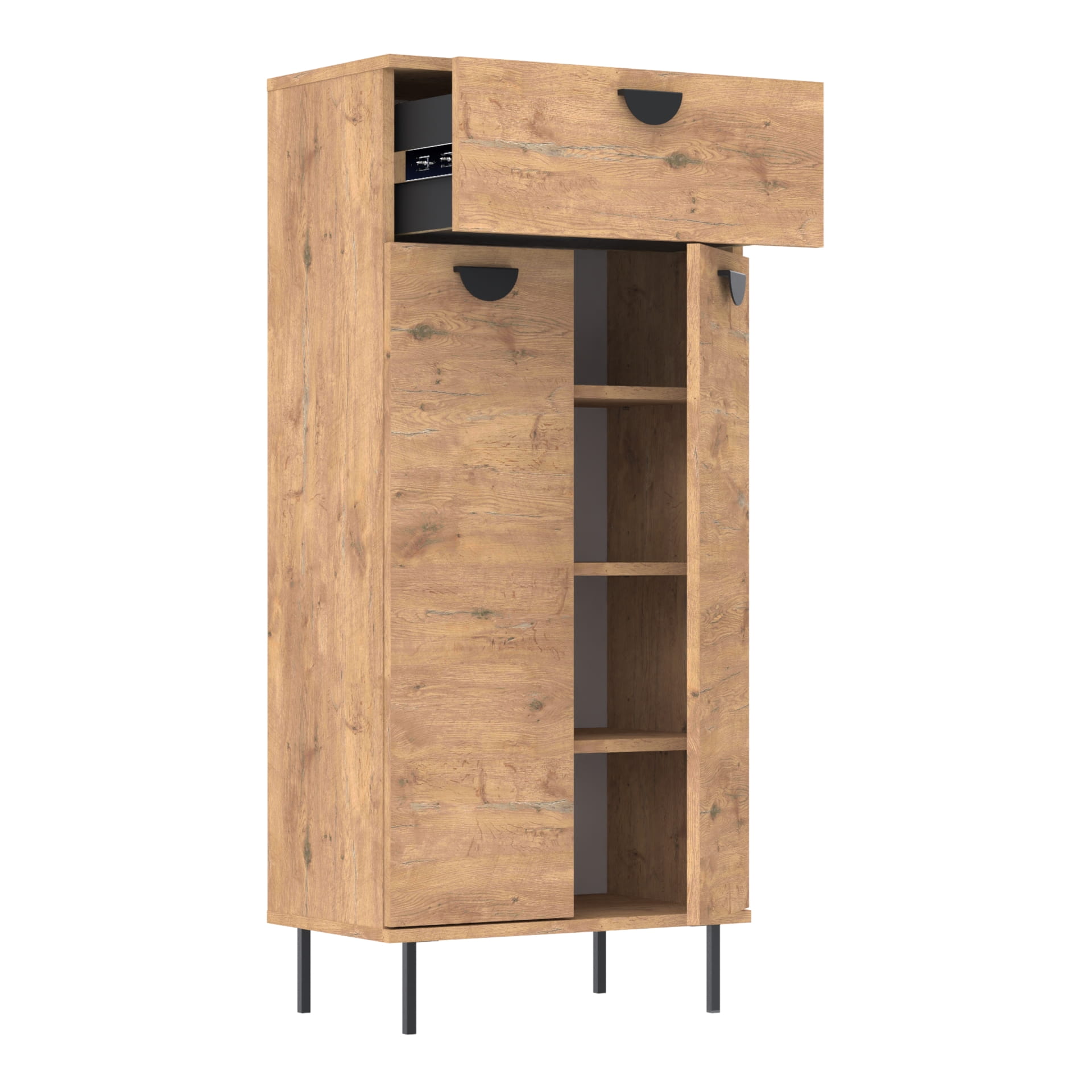 Komoda zawiera szufladę z twardym dnem, który nie ugina się pod ciężarem przedmiotów oraz trzy poziomy z regulowanymi półkami.