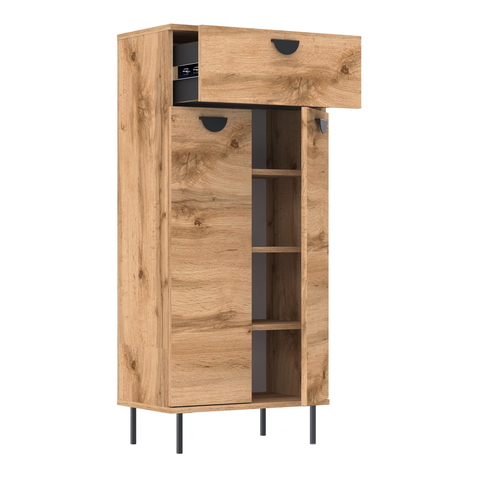 Komoda zawiera szufladę z twardym dnem, który nie ugina się pod ciężarem przedmiotów oraz trzy poziomy z regulowanymi półkami.