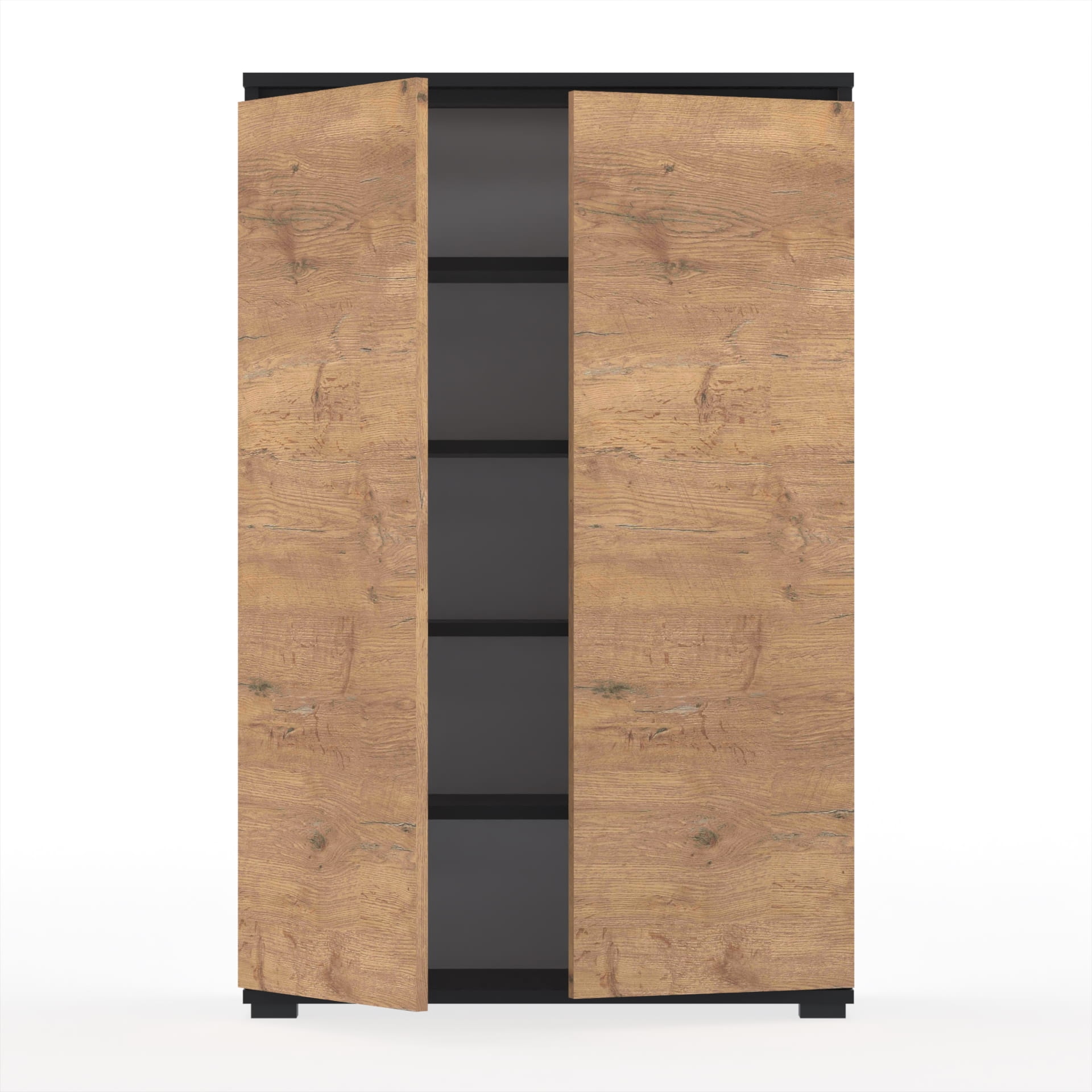 - Szafka wyposażona w dwoje drzwi, które otwierają się na boki, umożliwiając łatwy dostęp do całej zawartości.