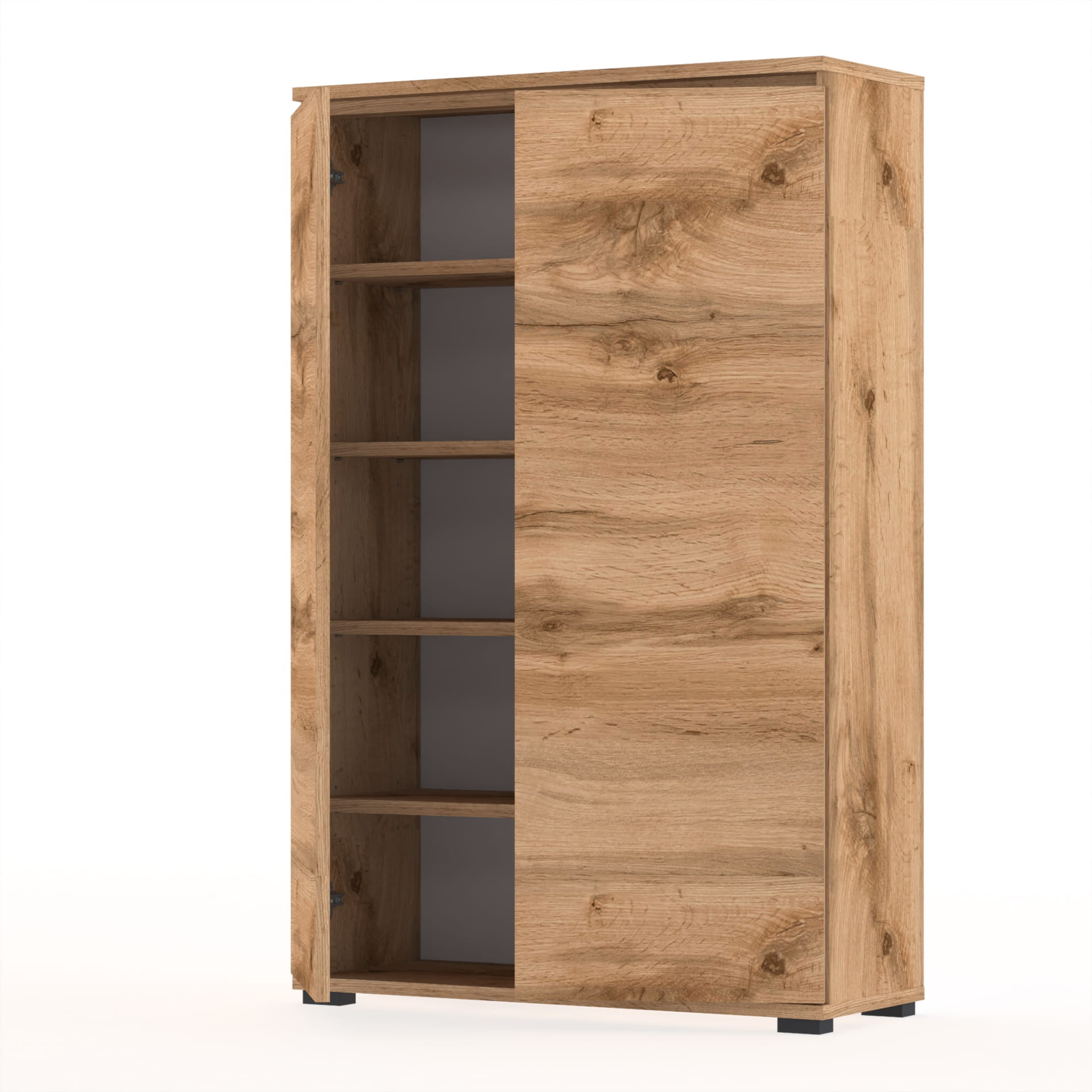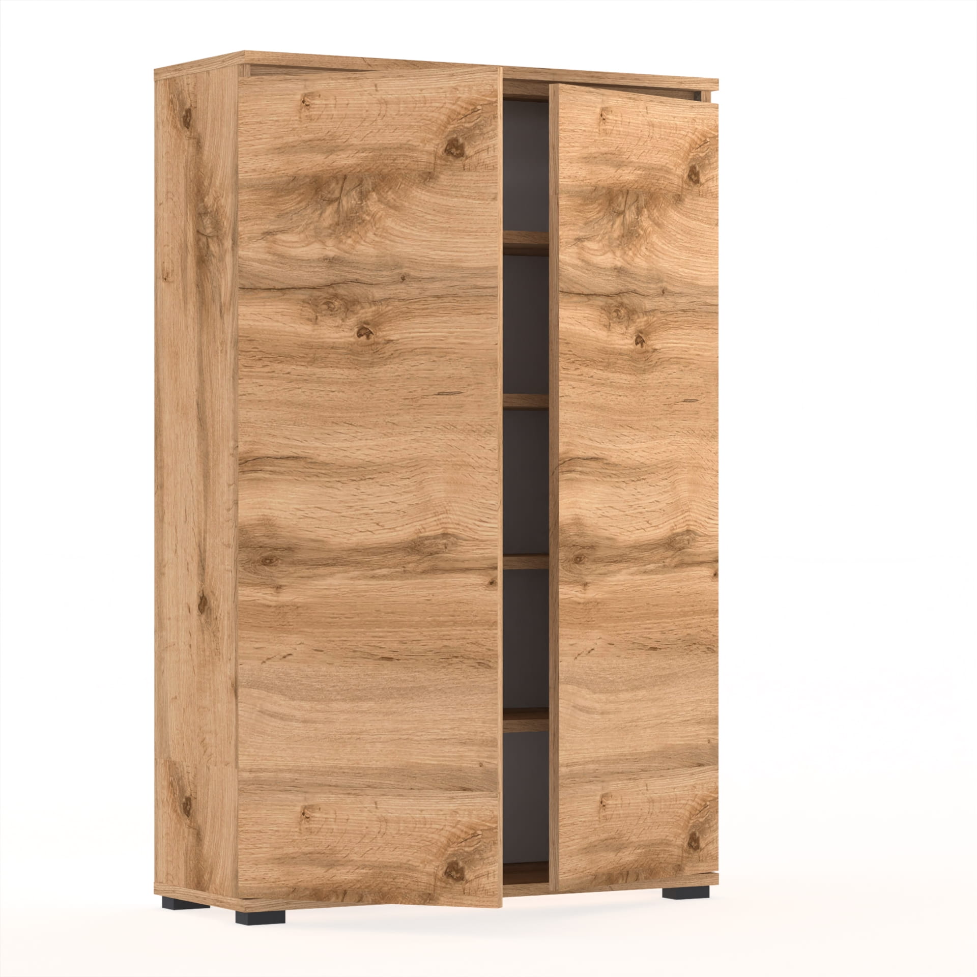 - Szafka wyposażona w dwoje drzwi, które otwierają się na boki, umożliwiając łatwy dostęp do całej zawartości.