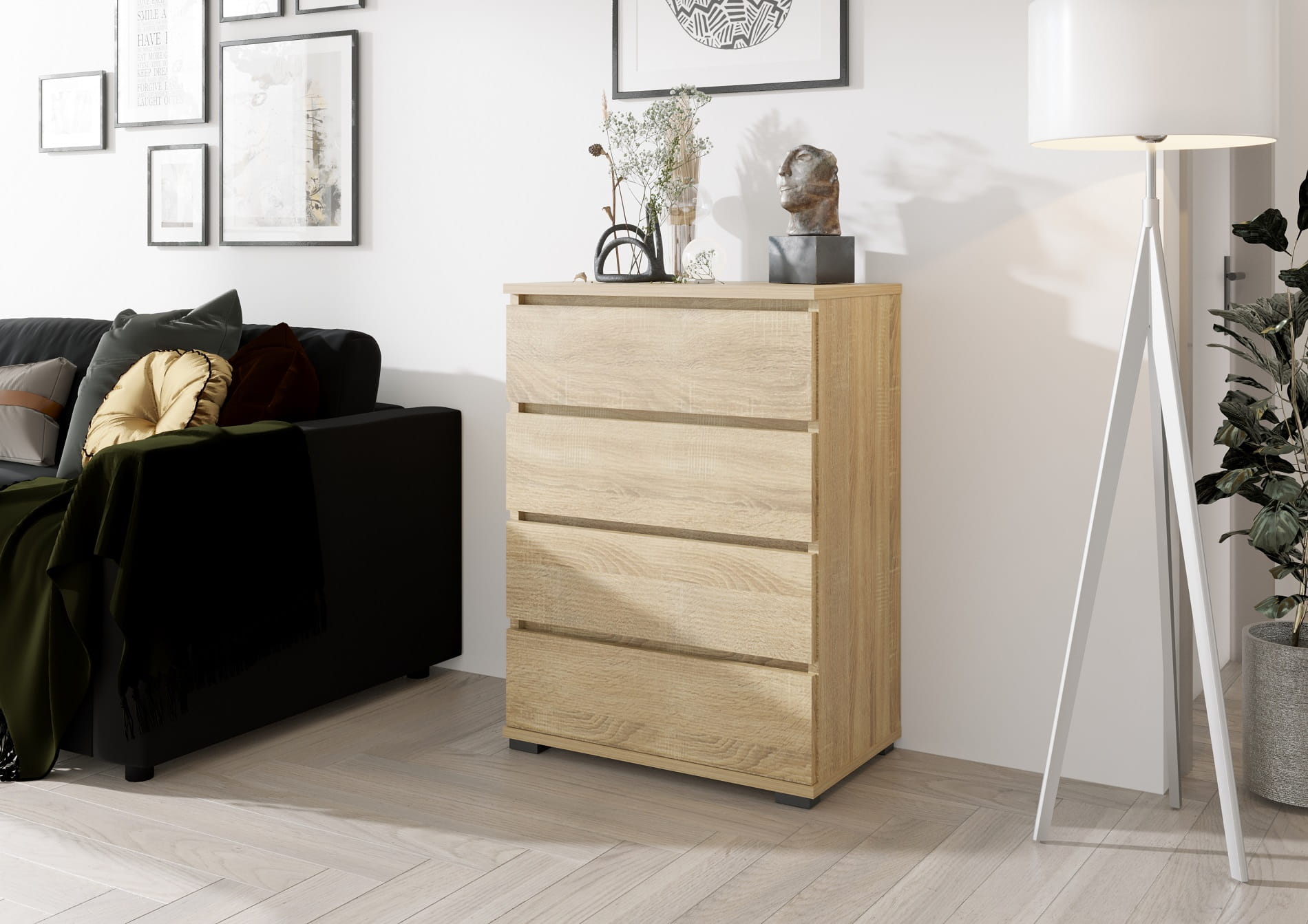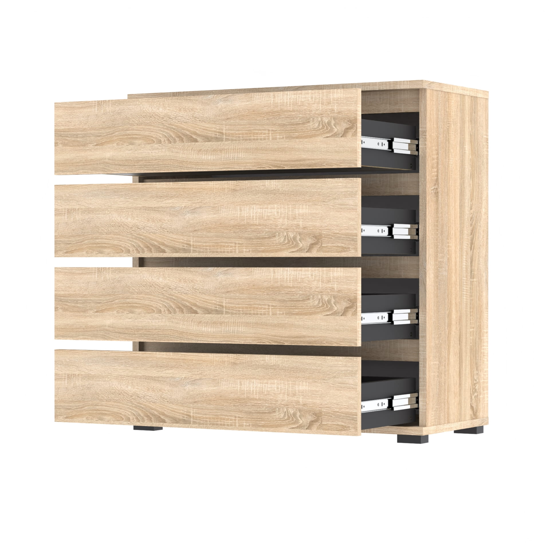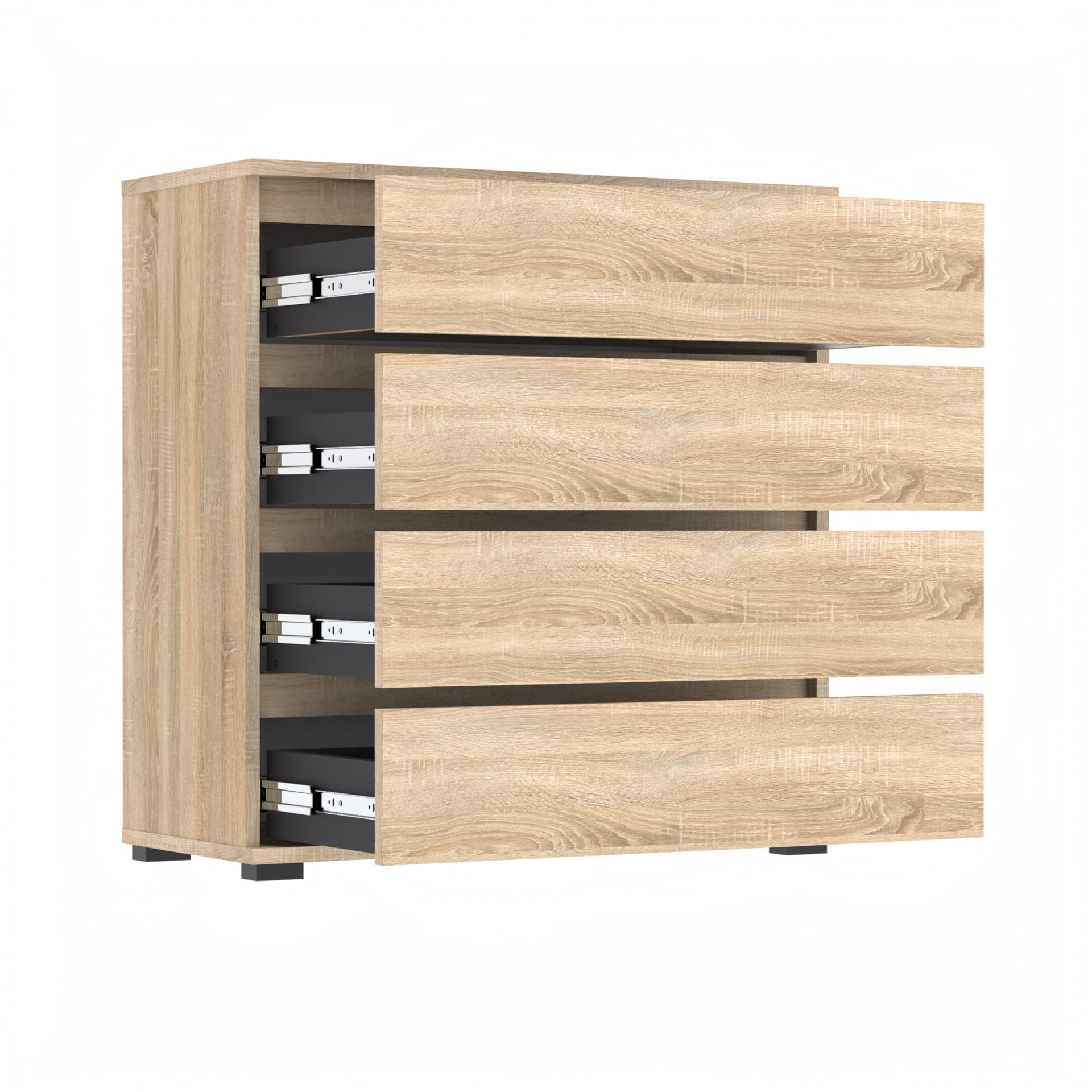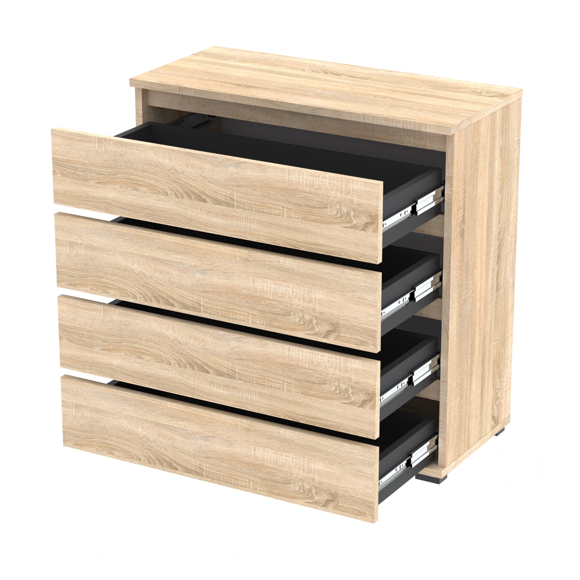 Komoda zawiera 4 szuflady z twardym 18mm dnem który nie ugina się pod ciężarem przedmiotów.