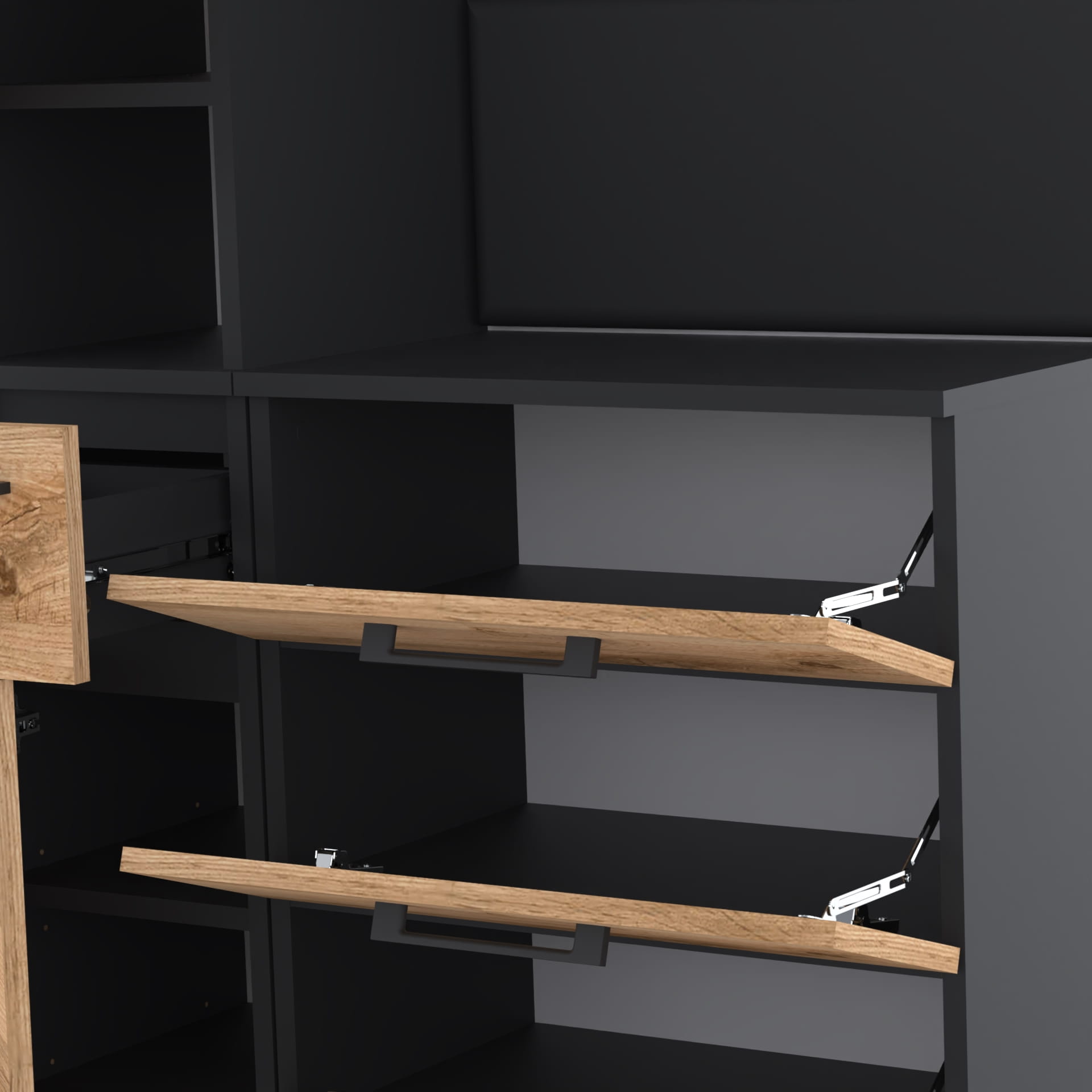 - Solidne Akcesoria Metalowe: Szafka posiada metalowe, solidne uchwyty oraz zawiasy, w tym zawiasy nożycowe, które zapewniają łatwe i ciche otwieranie.
