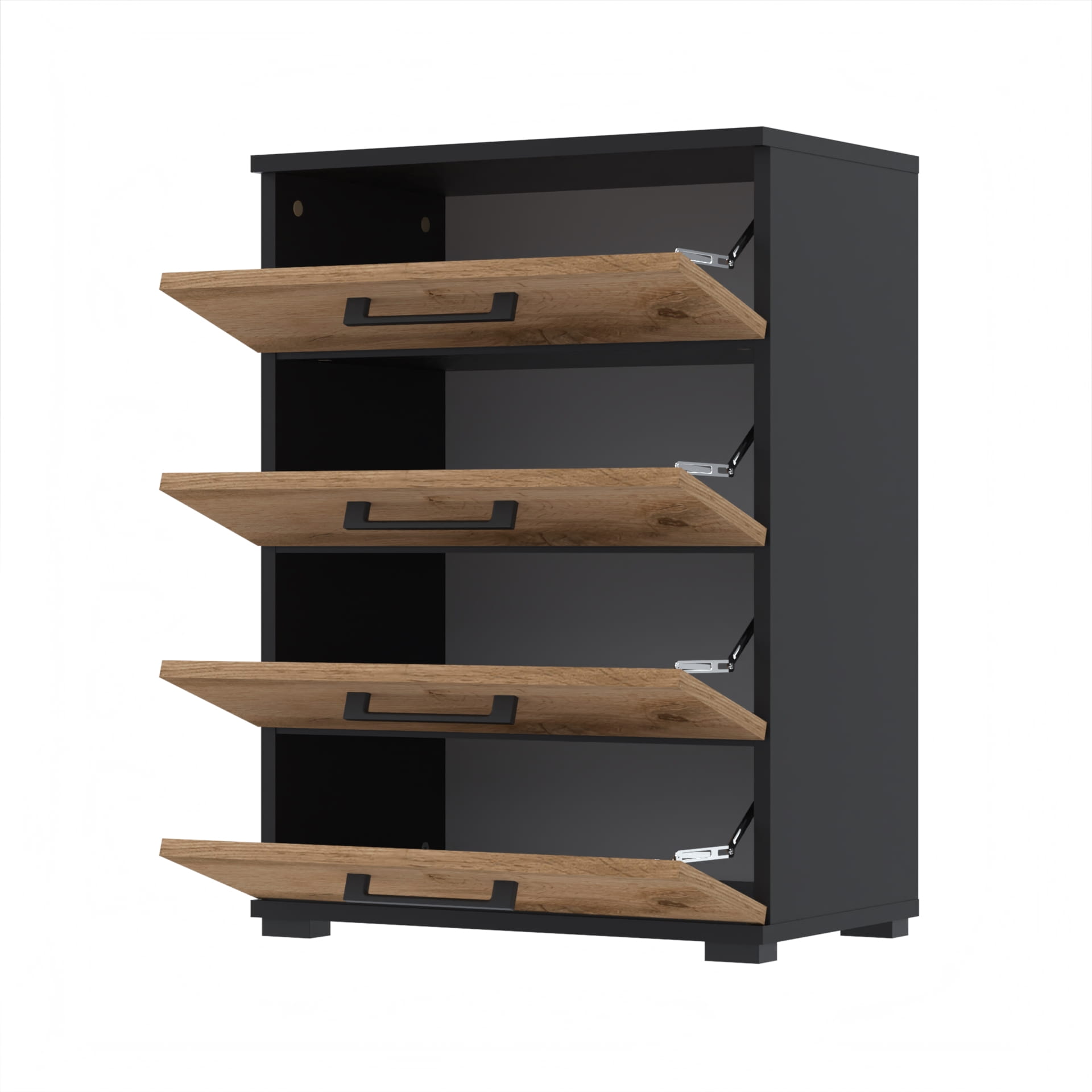 - Pojemność i Praktyczność: Wyposażona w cztery przestronne półki, szafka pomieści dużą liczbę par butów, utrzymując porządek i łatwy dostęp.
