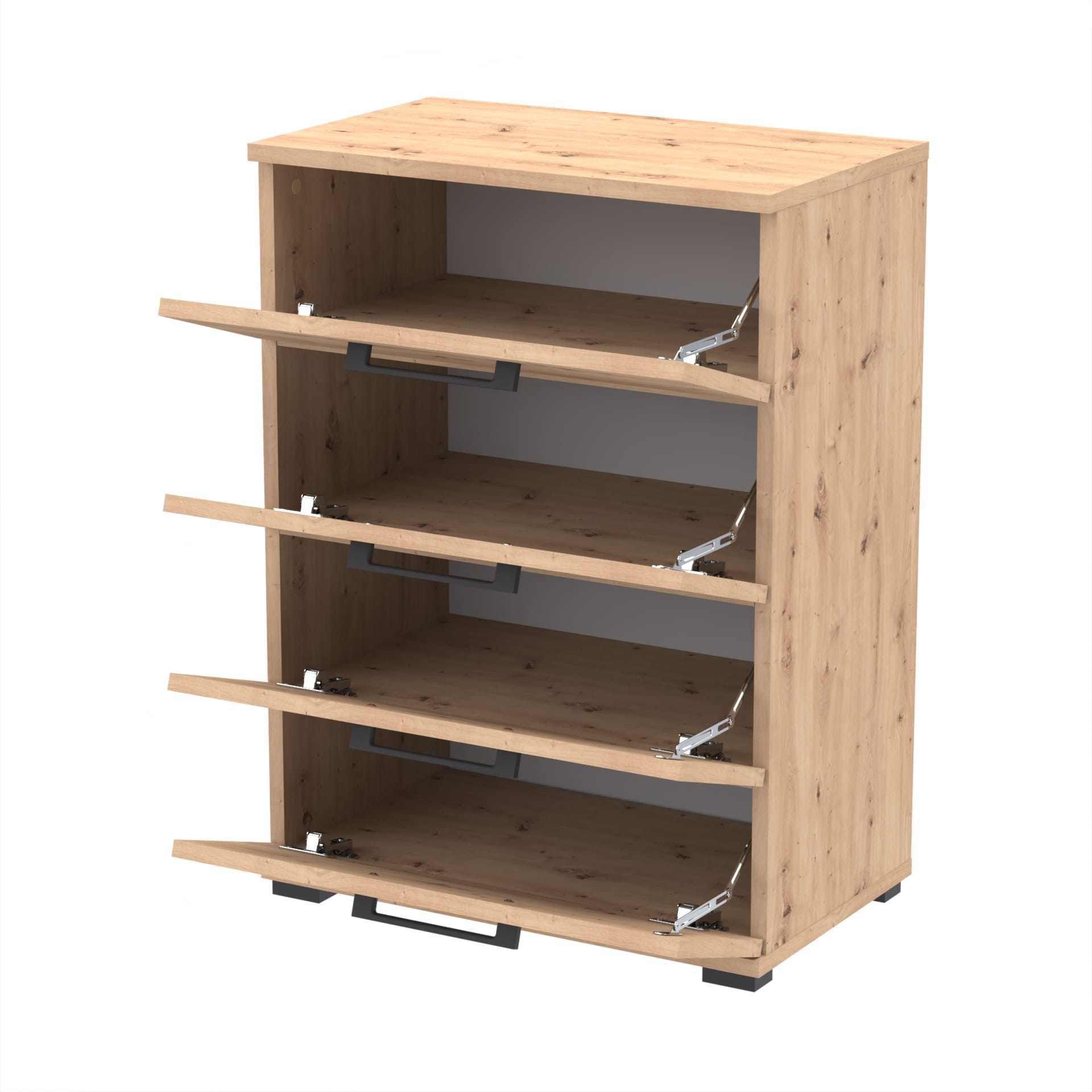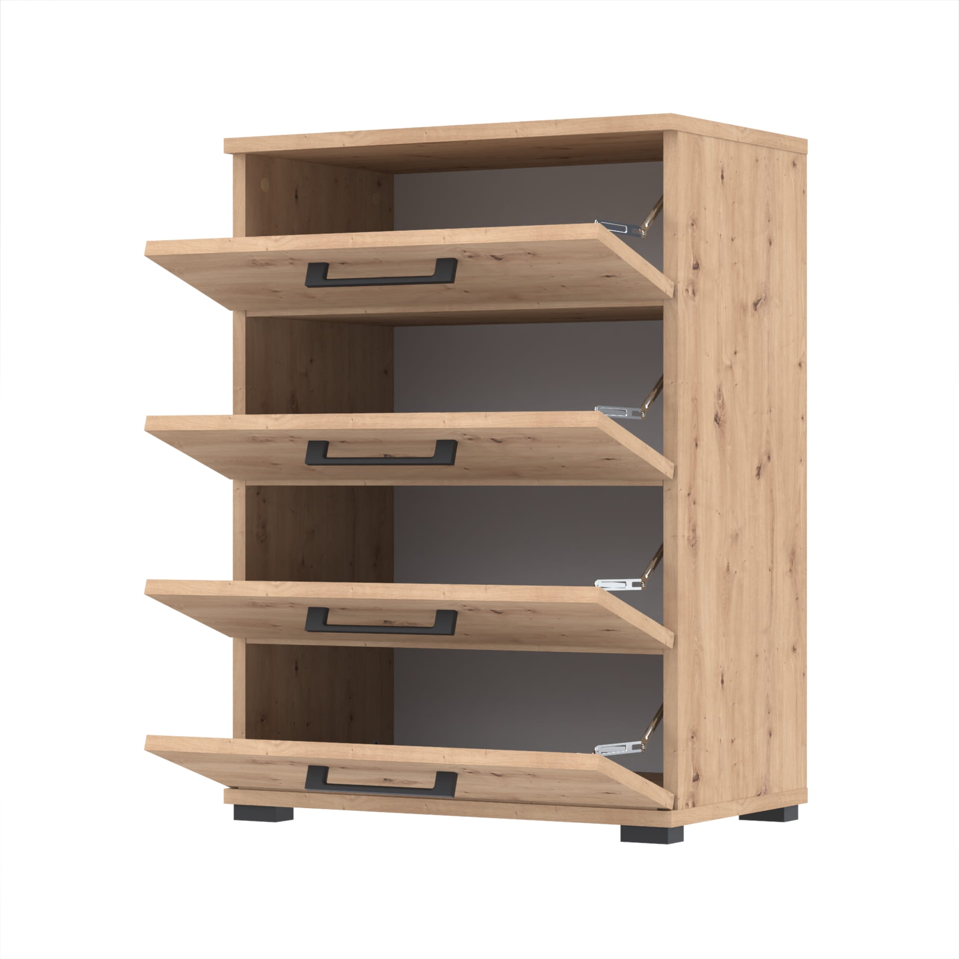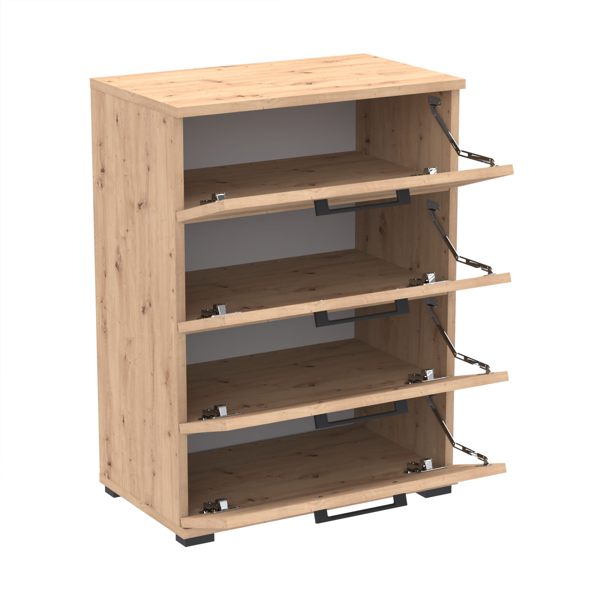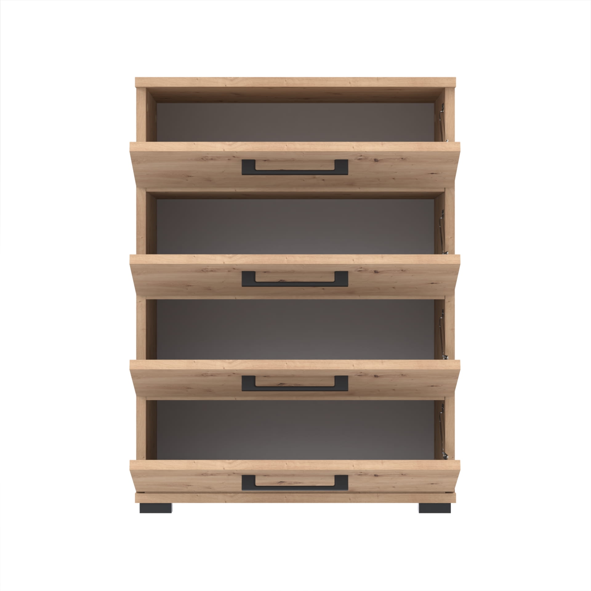 - Pojemność i Praktyczność: Wyposażona w cztery przestronne półki, szafka pomieści dużą liczbę par butów, utrzymując porządek i łatwy dostęp.