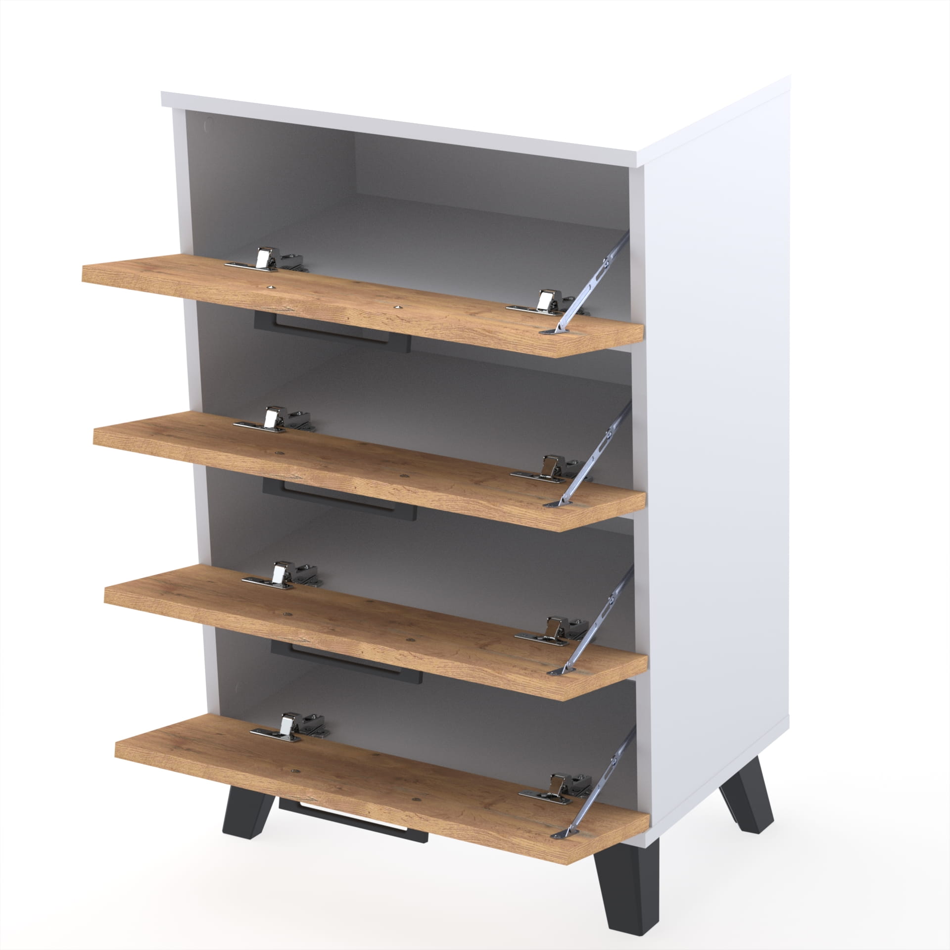 Szafka na buty "Altus" to praktyczny i stylowy element wyposażenia, doskonały do przechowywania obuwia. Wykonana z 18mm płyty meblowej, co zapewnia jej solidność i trwałość. Twarde obrzeże ABS zwiększa odporność na codzienne użytkowanie, a metalowe uchwyty i zawiasy, w tym zawiasy nożycowe, dodają szafce eleganckiego wyglądu, jednocześnie gwarantując jej bezproblemowe działanie.