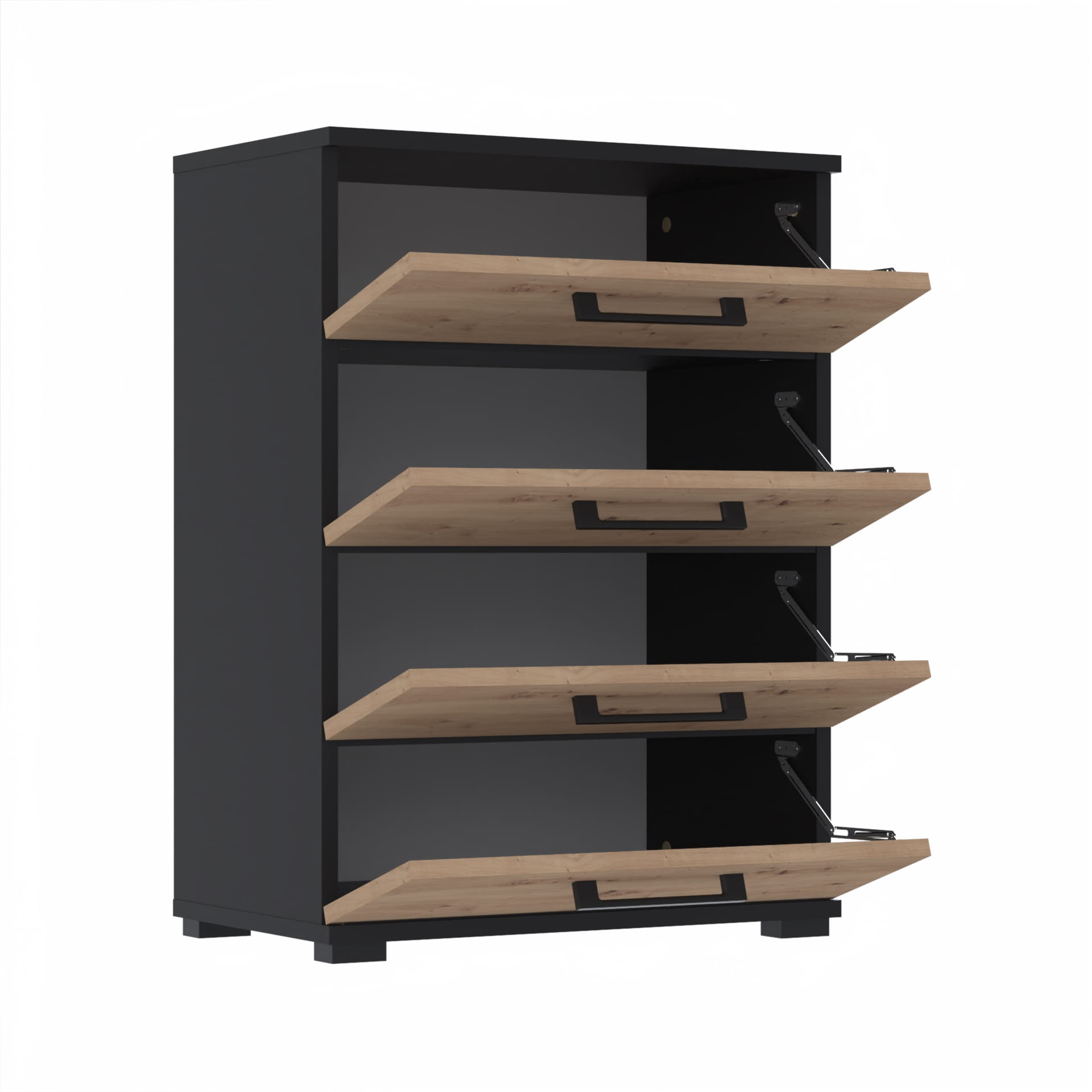 - Pojemność i Praktyczność: Wyposażona w cztery przestronne półki, szafka pomieści dużą liczbę par butów, utrzymując porządek i łatwy dostęp.