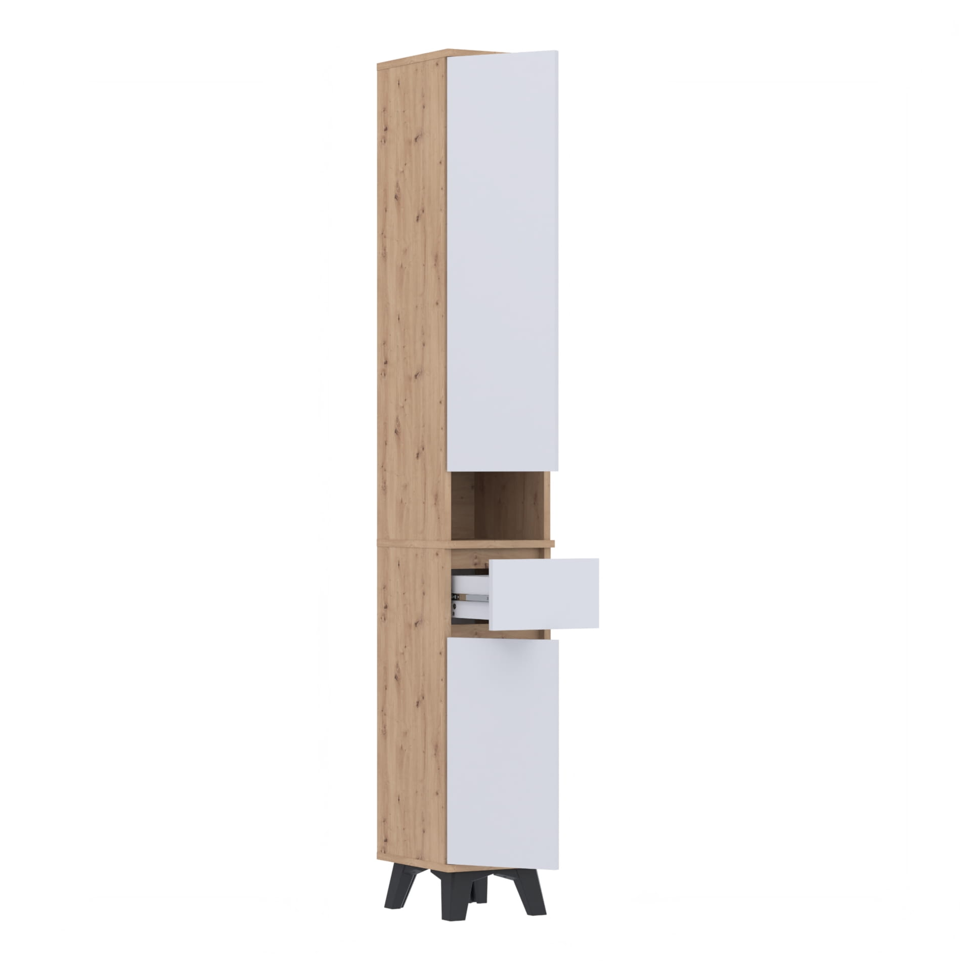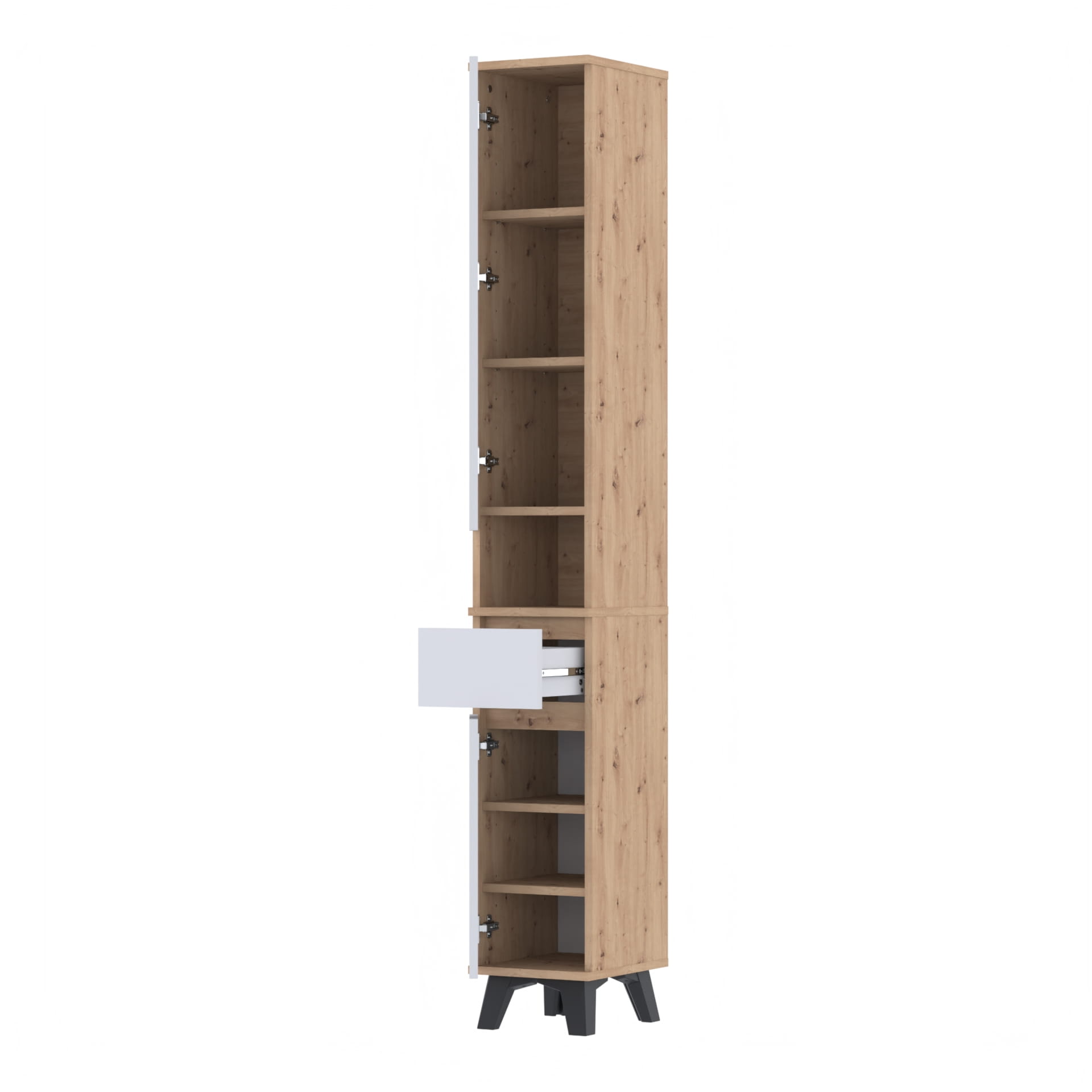 Szafa składa się z dwóch części. W dolnej części znajduje się szafka z 3 poziomami oraz szuflada TRES. Górna część - nadstawka posiada szafkę z czterema poziomami oraz otwartą półkę. Górna część nakłada się na dolną, tak by stanowiły całość.