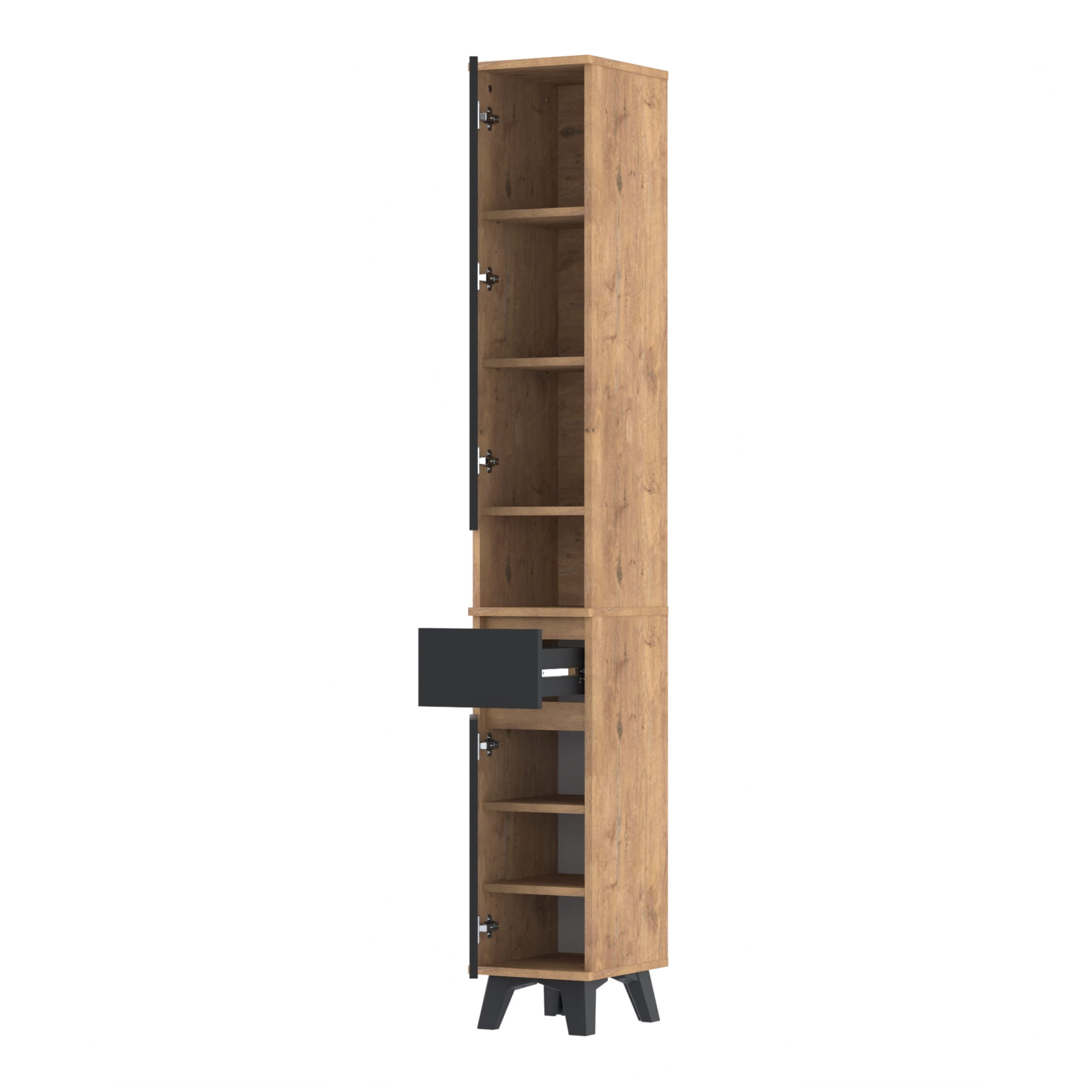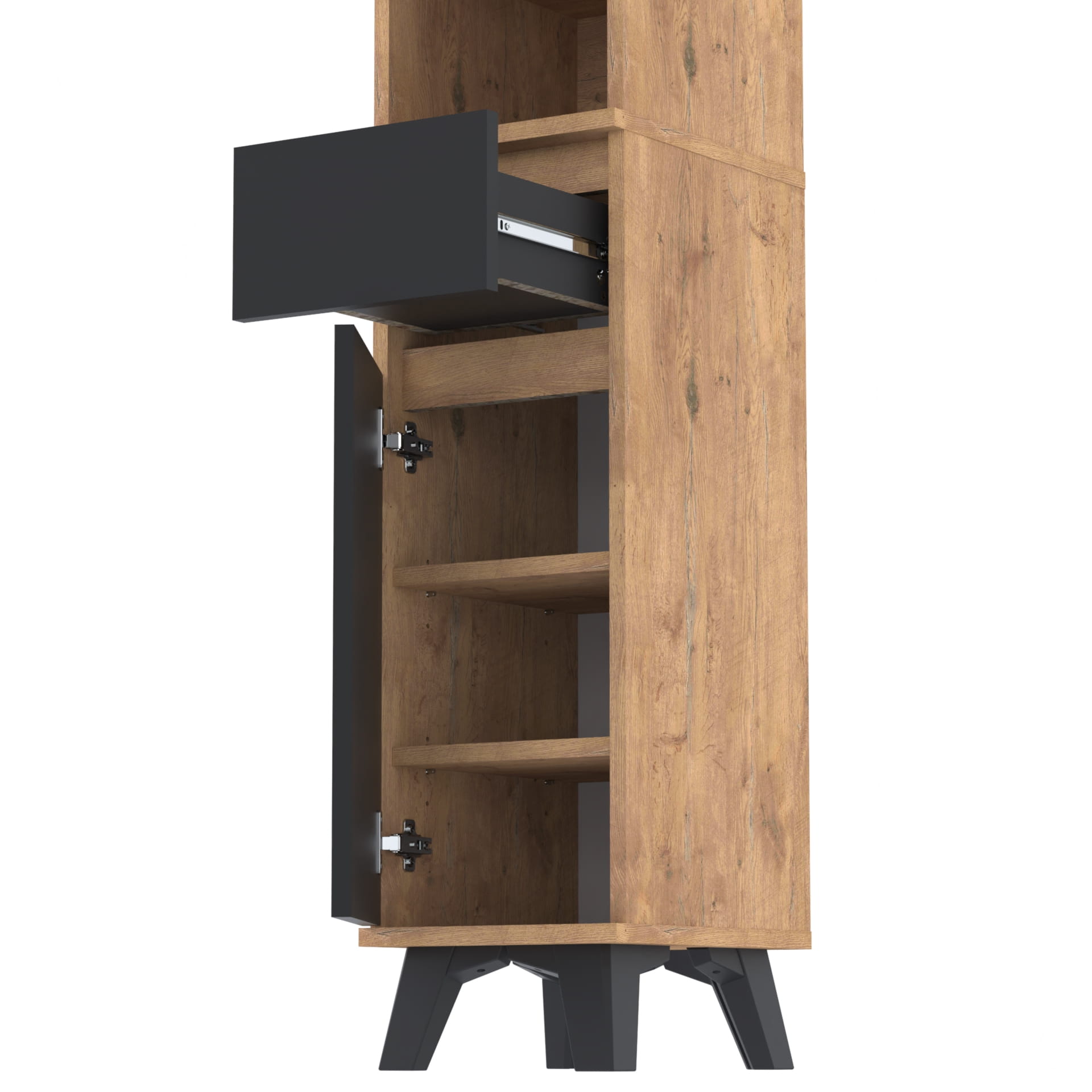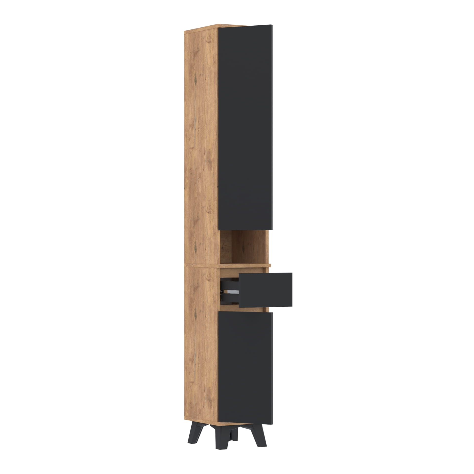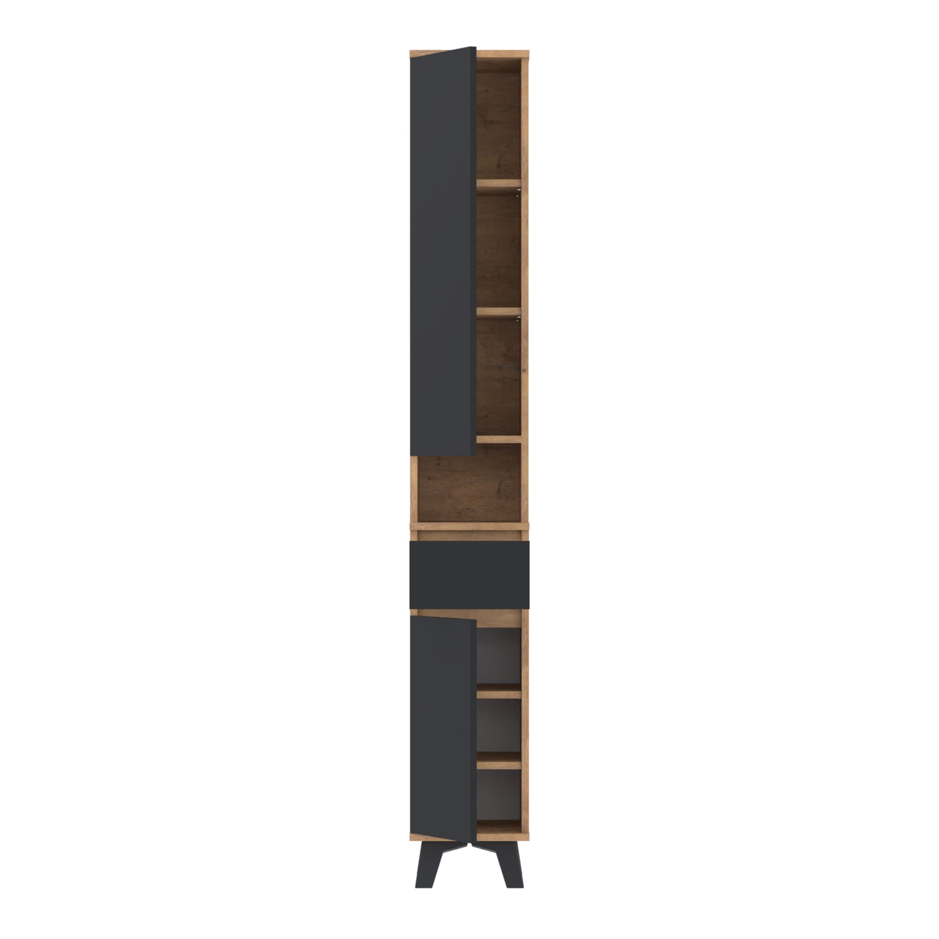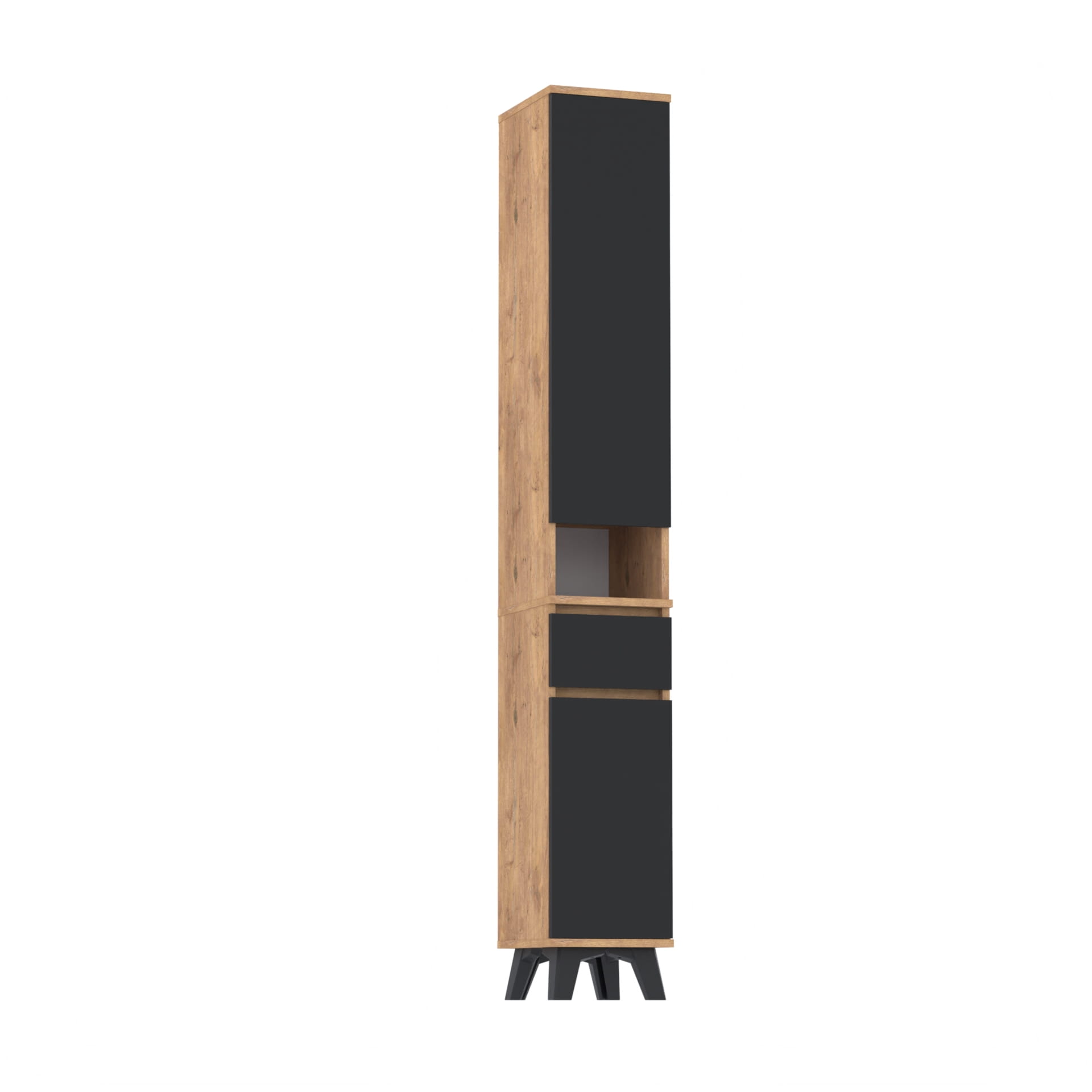 Szafa składa się z dwóch części. W dolnej części znajduje się szafka z 3 poziomami oraz szuflada TRES. Górna część - nadstawka posiada szafkę z czterema poziomami oraz otwartą półkę. Górna część nakłada się na dolną, tak by stanowiły całość.