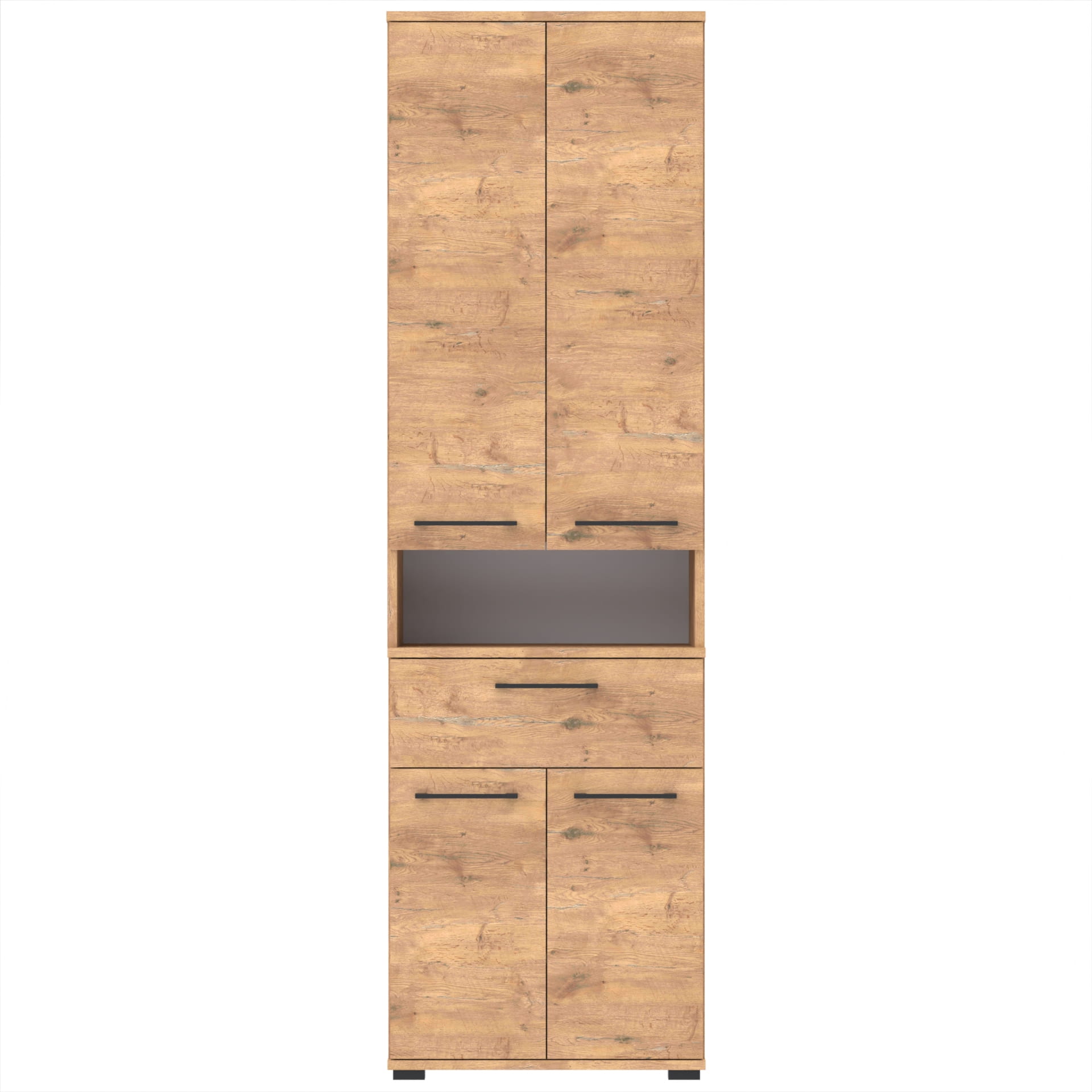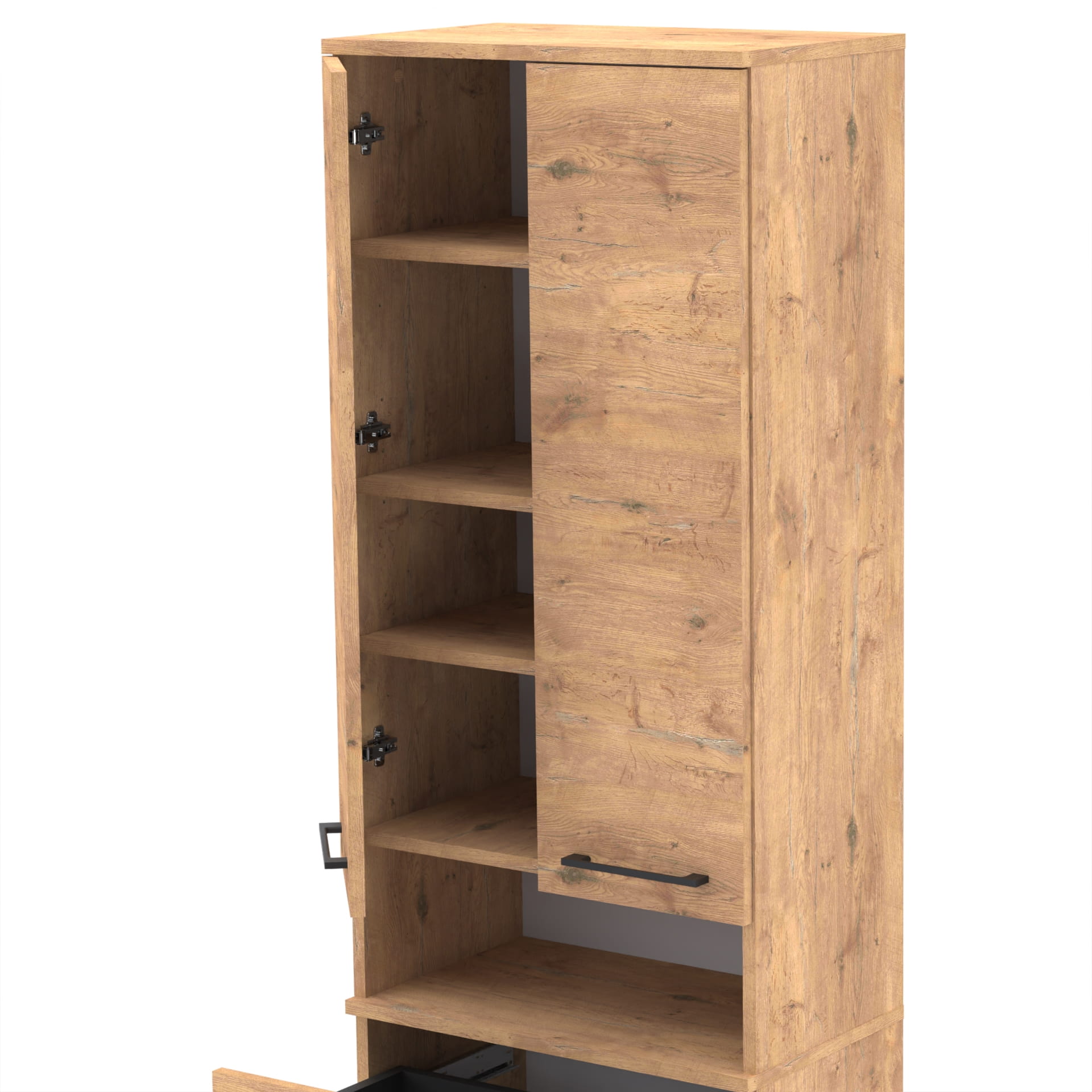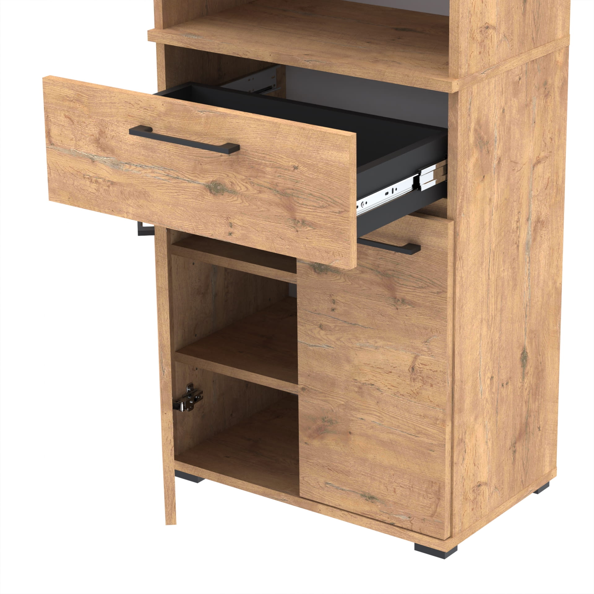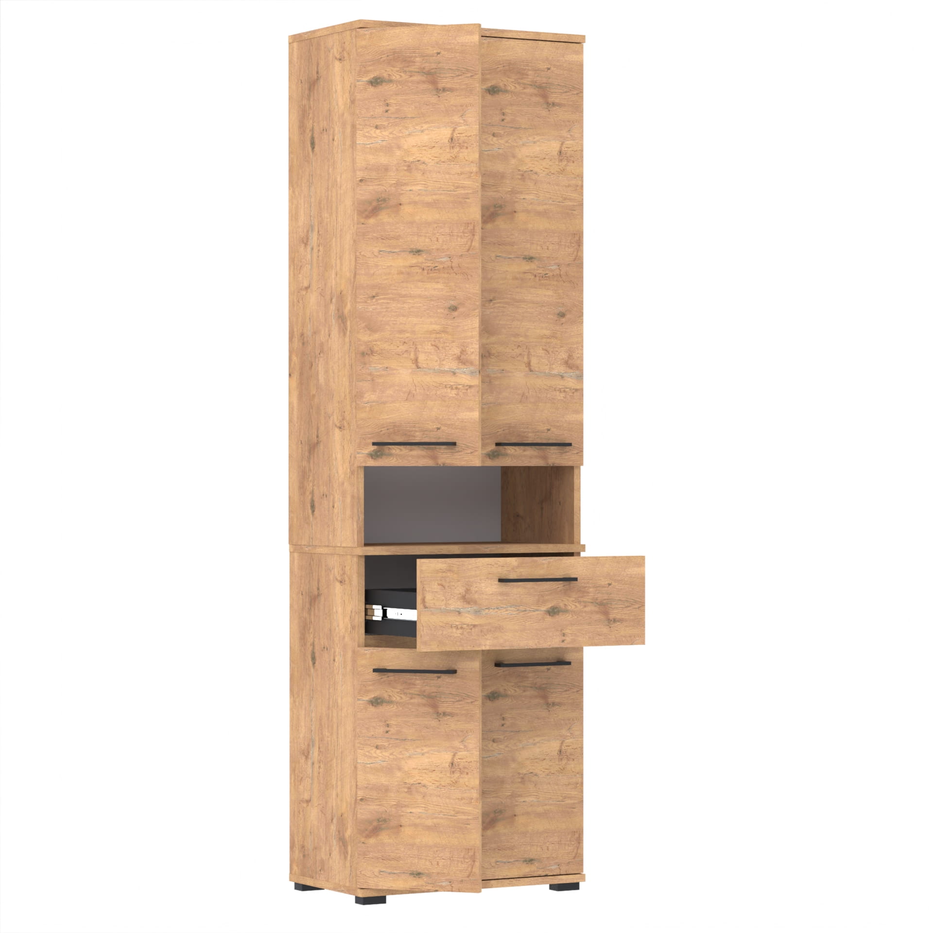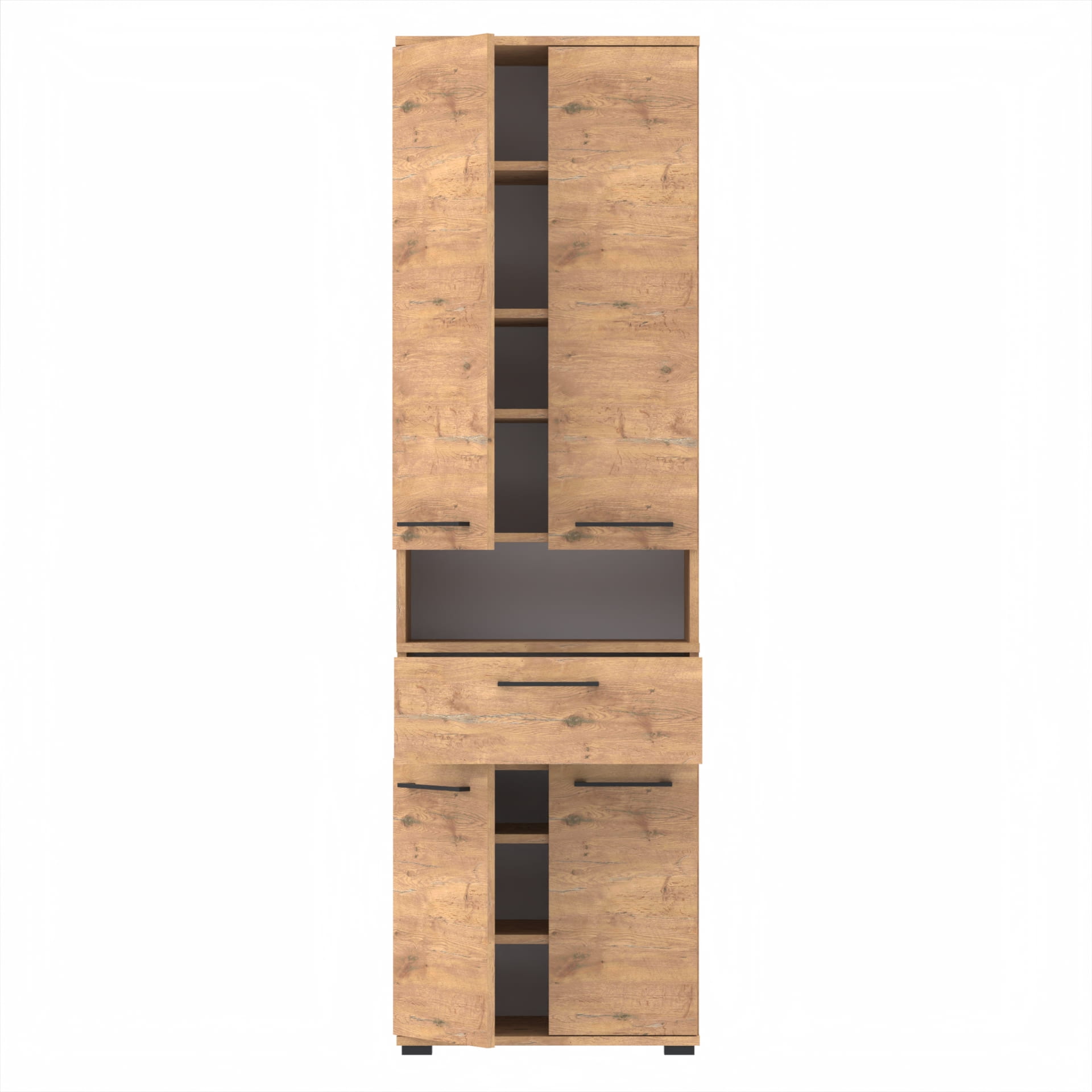 Szafa składa się z dwóch części. W dolnej części znajduje się szafka z 3 poziomami oraz szuflada TRES. Górna część - nadstawka posiada szafkę z czterema poziomami oraz otwartą półkę. Górna część nakłada się na dolną, tak by stanowiły całość.