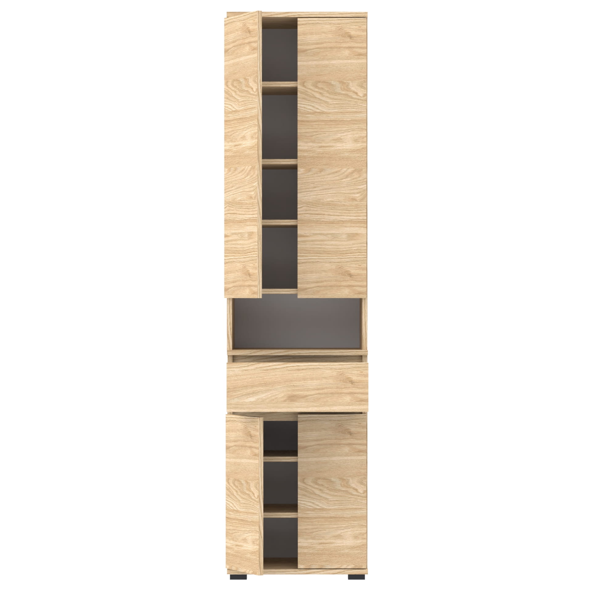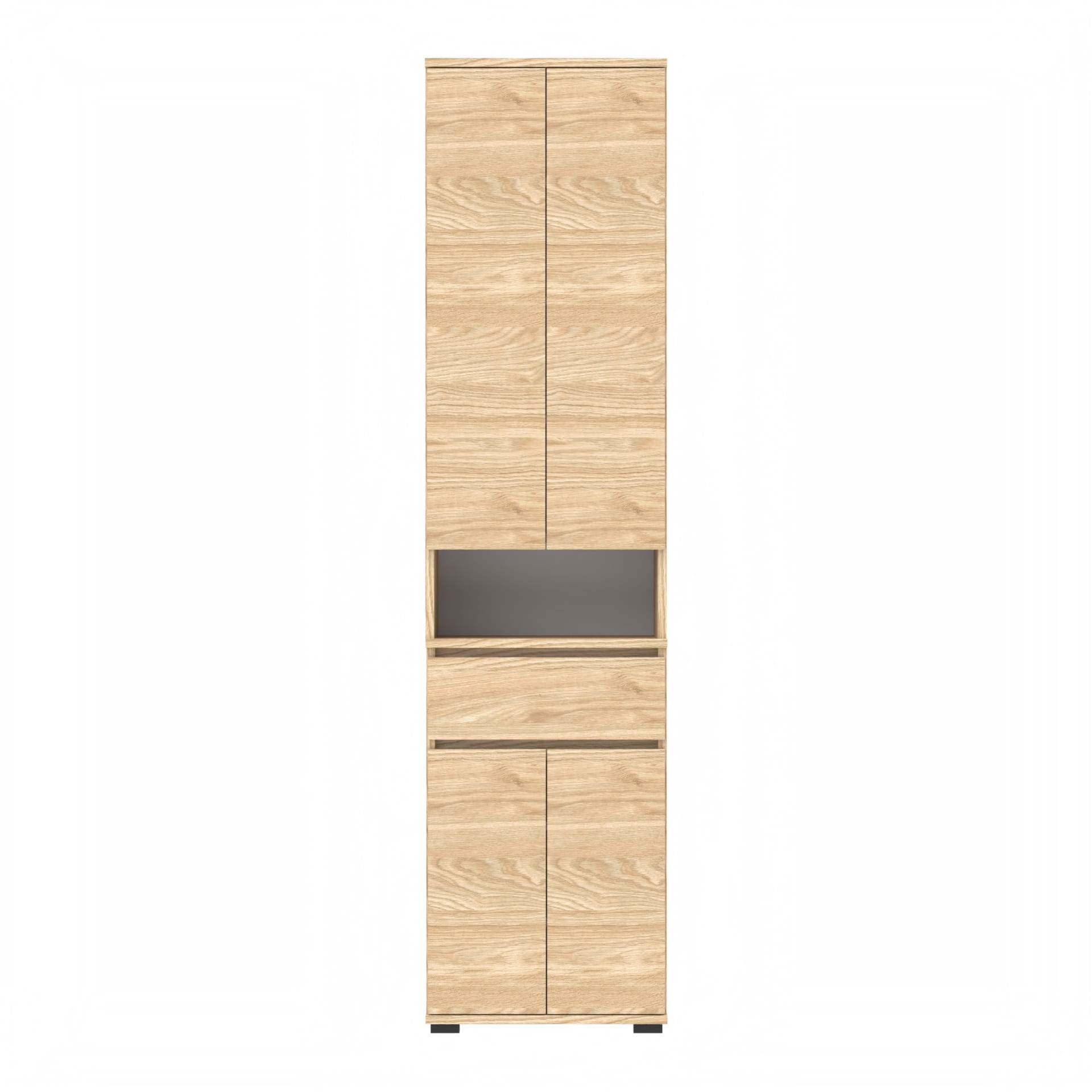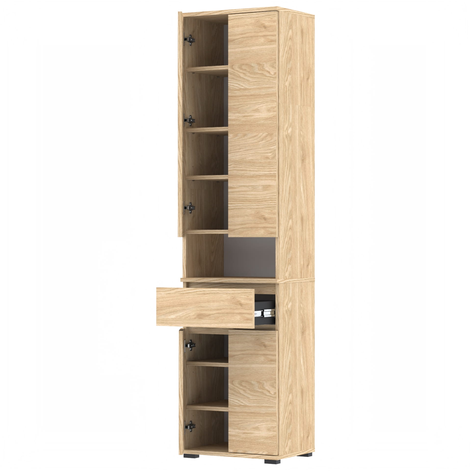 Górna część - nadstawka przynosi jeszcze więcej przestrzeni dzięki szafce z czterema poziomami oraz otwartej półce. Idealna do przechowywania butów lub ubrań. Górna część doskonale komponuje się z dolnym modułem, tworząc spójną i estetyczną całość.