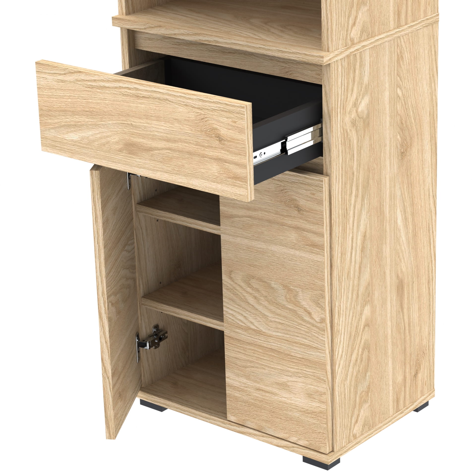Dolna część oferuje praktyczną szafkę z trzema poziomami, zapewniającą mnóstwo miejsca do przechowywania różnorodnych przedmiotów. Dodatkowo, wyposażona jest w szufladę TRES z twardym dnem, która nie ugina się pod ciężarem przechowywanych w niej rzeczy. Szuflada działa na kulkowych prowadnicach, zapewniających płynne i ciche otwieranie.