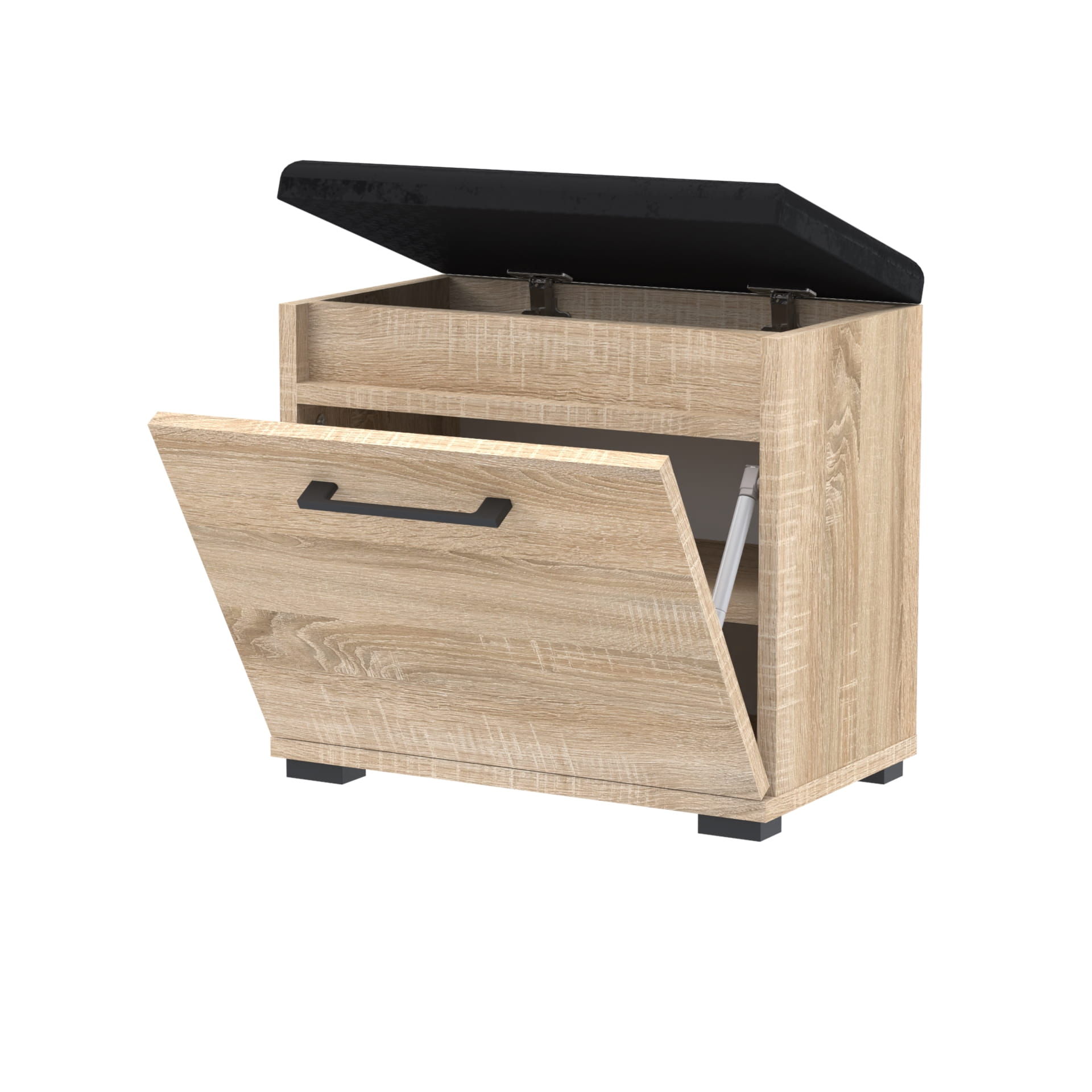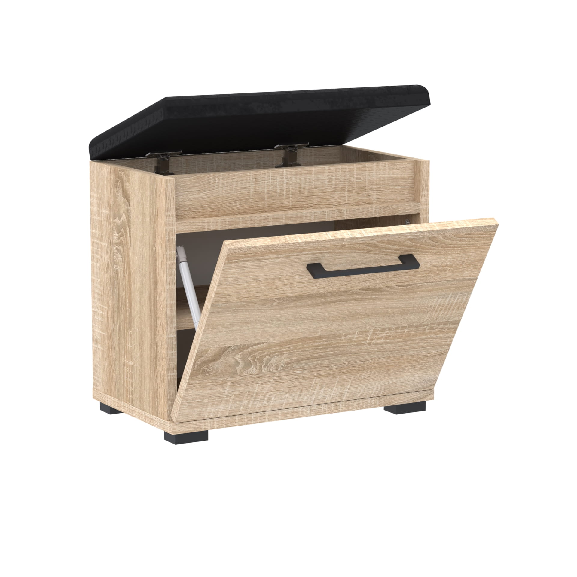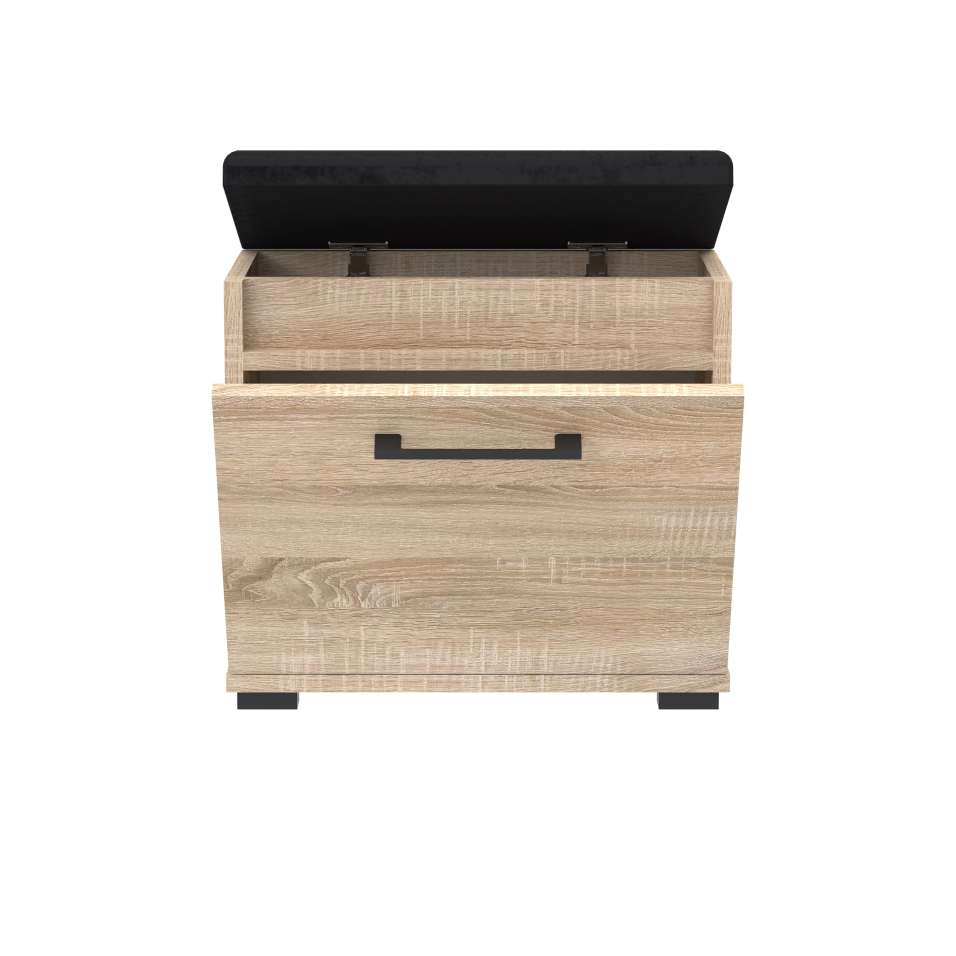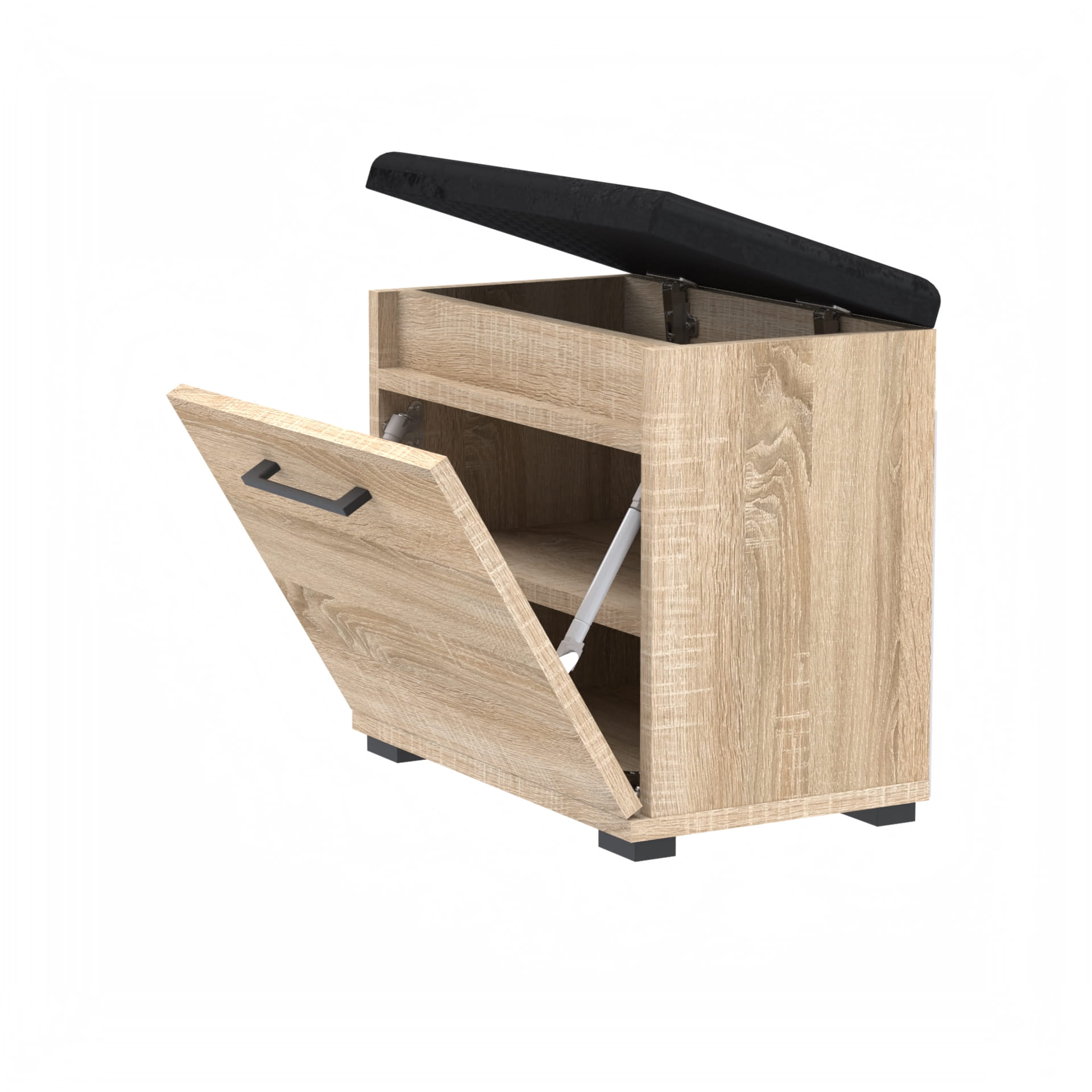 Drzwi pełne z solidnym metalowym uchwytem zapewniają łatwe otwieranie i zamykanie, jednocześnie dodając elegancji i trwałości. Wygodne siedzisko obite wysokiej jakości materiałem zapewnia komfortowe miejsce do zakładania i zdejmowania obuwia.