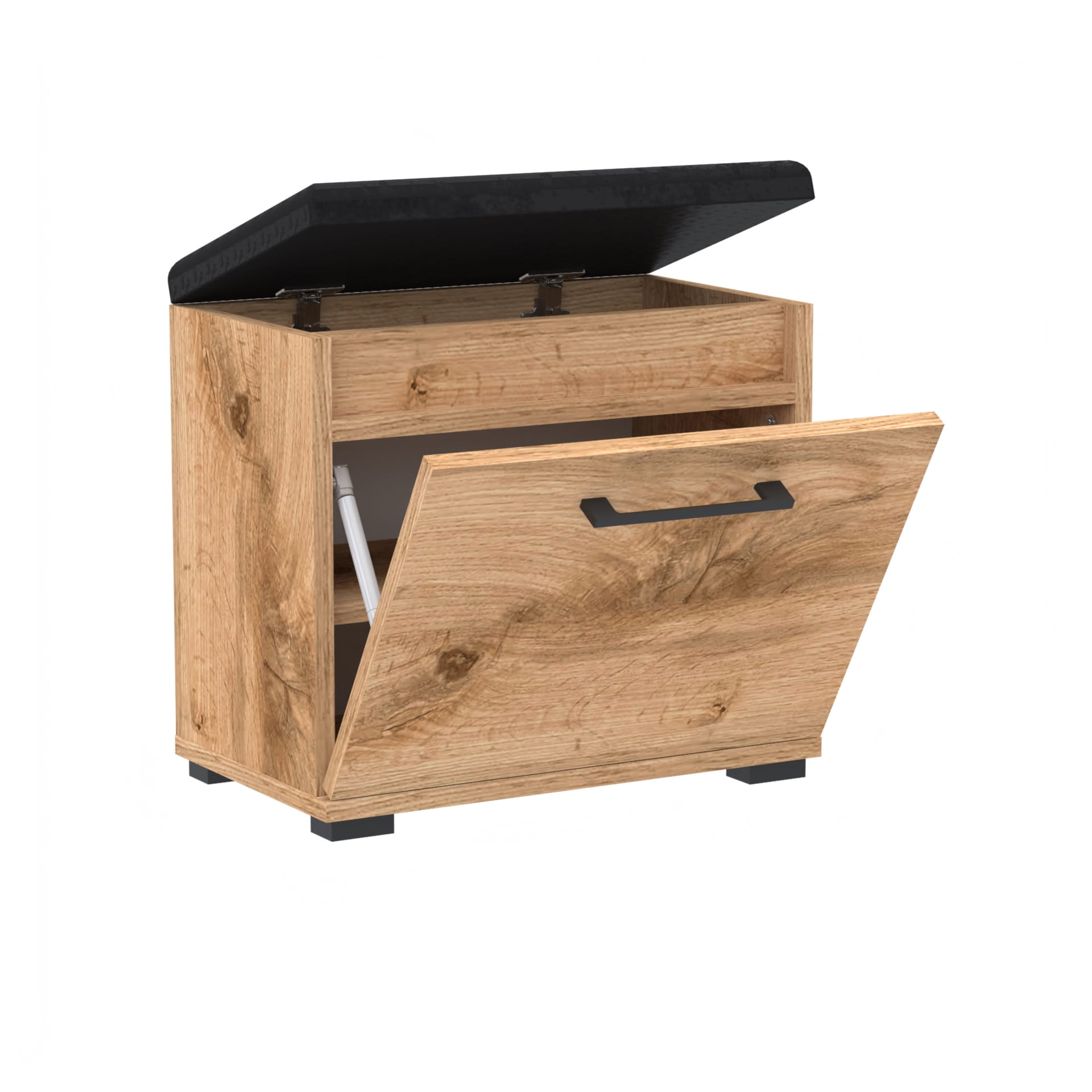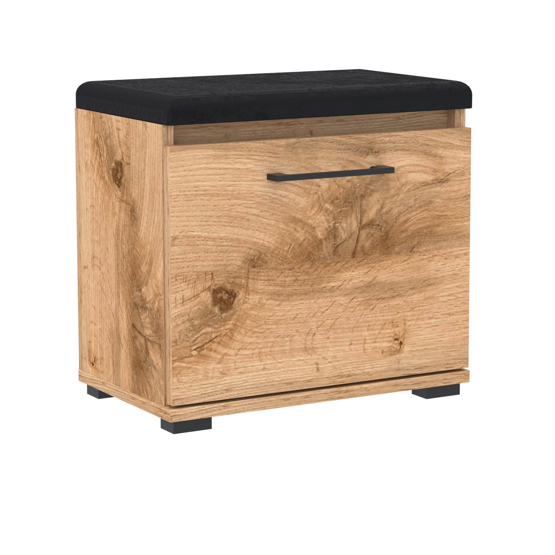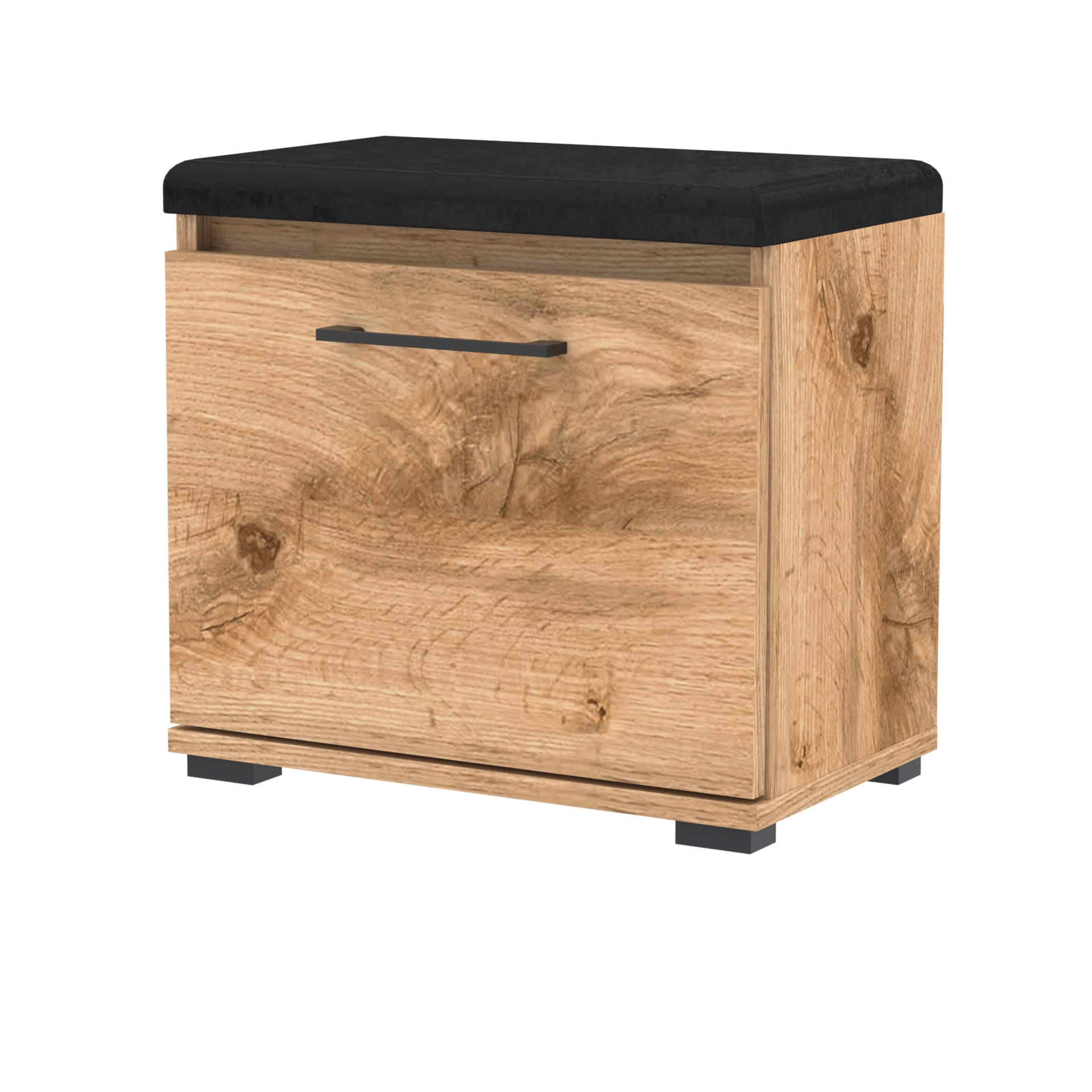 Szafka na buty, drzwi pełne z uchwytem metalowym, siedziskiem i schowkiem na przybory,