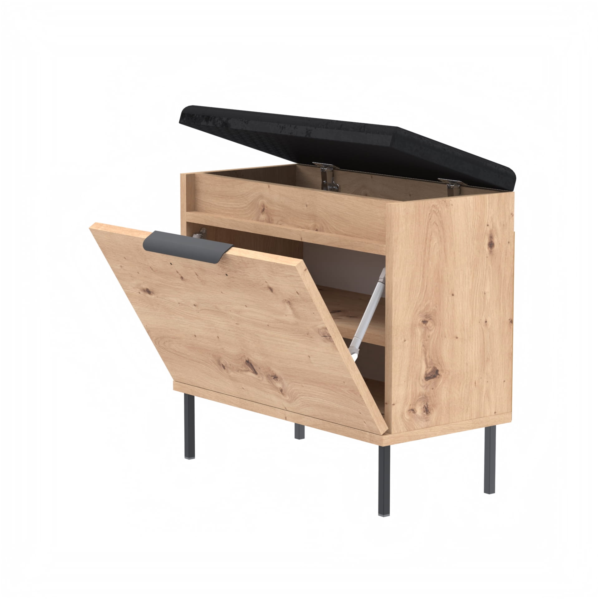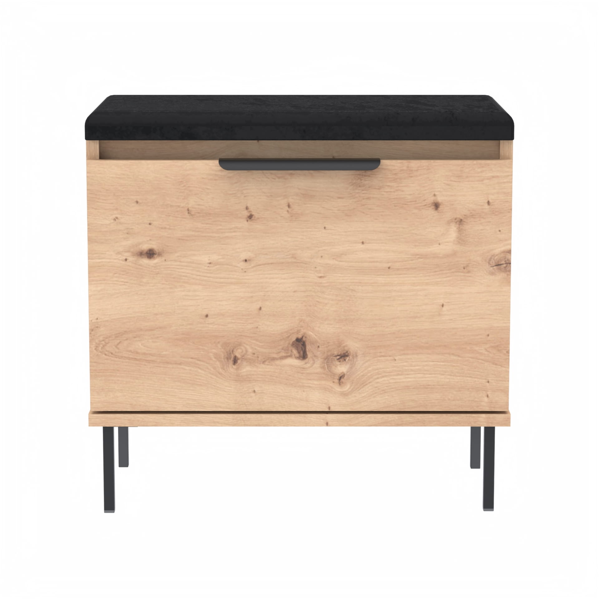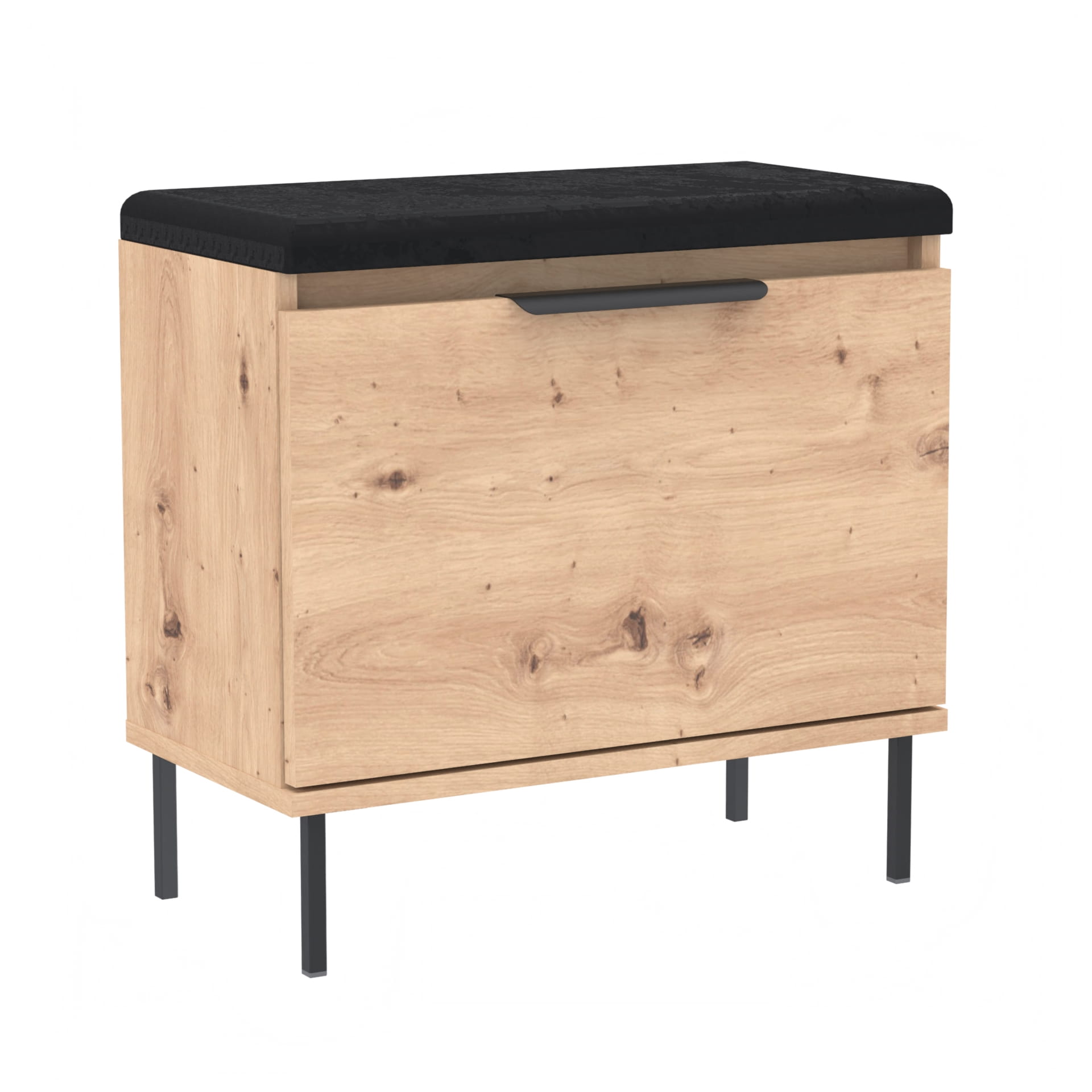 Nowoczesna i funkcjonalna szafka na buty z pełnymi drzwiami, eleganckim metalowym uchwytem, wygodnym siedziskiem oraz praktycznym schowkiem na akcesoria. Doskonała do przedpokoju – łączy komfort użytkowania z efektownym wyglądem.