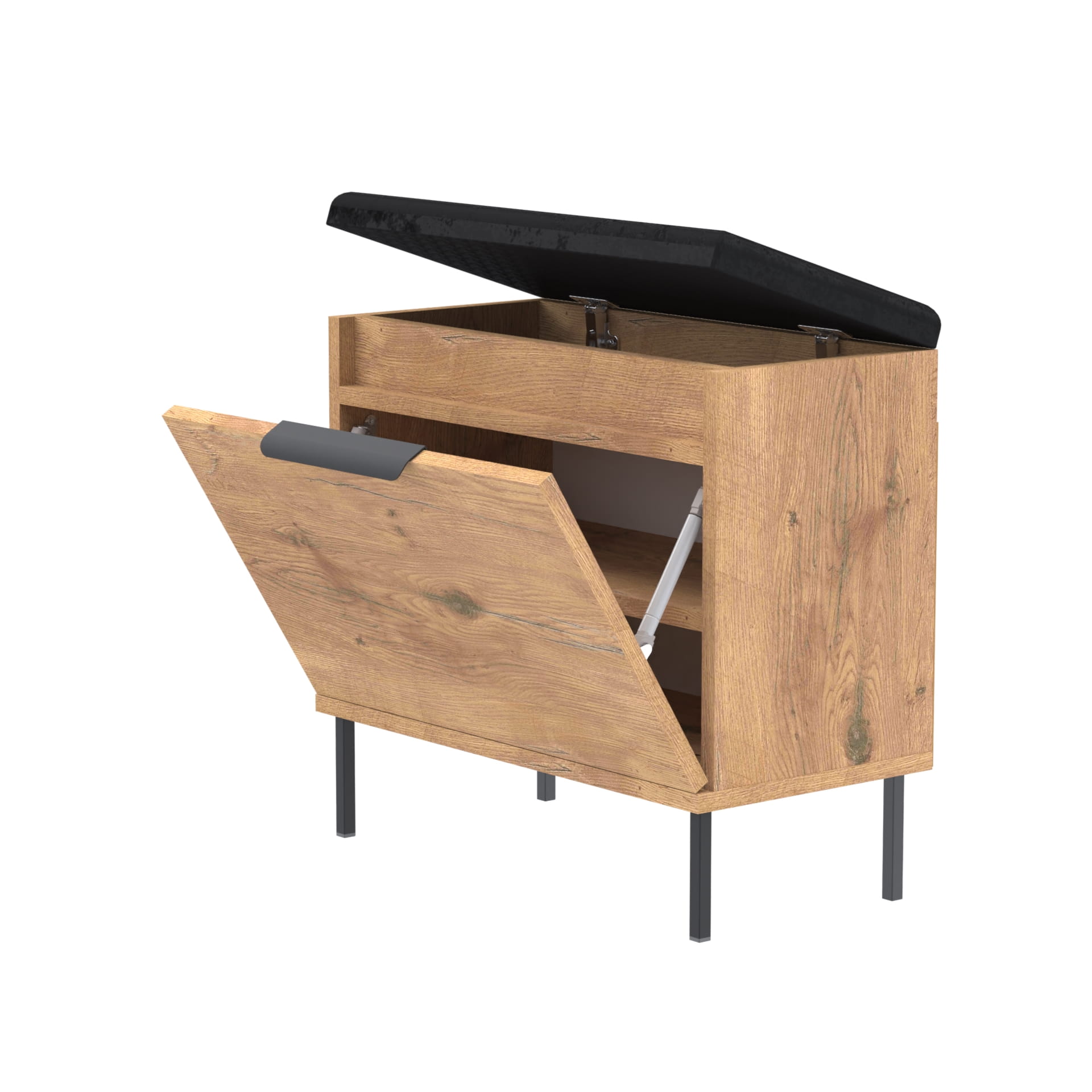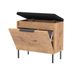 Stylowa i funkcjonalna szafka na buty z pełnymi drzwiami, wyposażona w metalowy uchwyt, miękkie siedzisko oraz praktyczny schowek na akcesoria. Idealnie sprawdzi się w przedpokoju, łącząc wygodę użytkowania z estetycznym wyglądem.