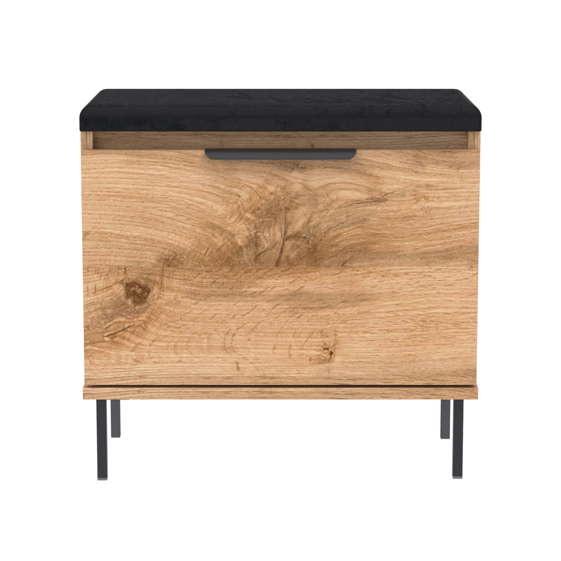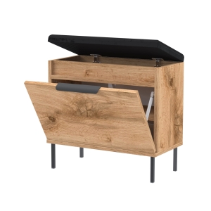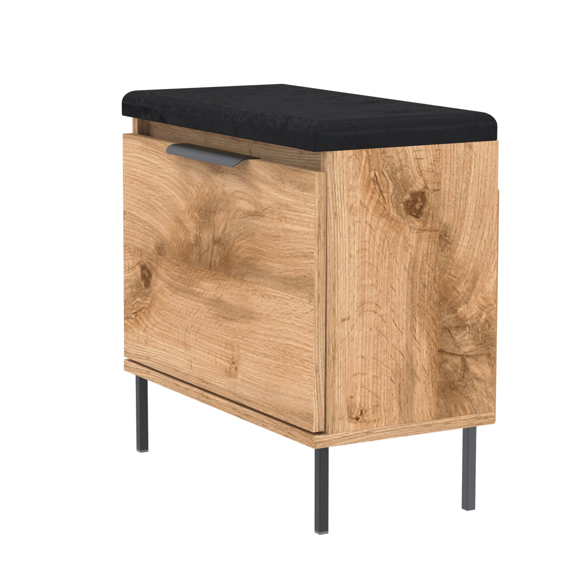Praktyczna i stylowa szafka na buty z pełnymi drzwiami, solidnym metalowym uchwytem, miękkim siedziskiem oraz dodatkowym schowkiem na akcesoria. Idealnie sprawdzi się w przedpokoju, oferując wygodę i estetyczny wygląd w jednym.