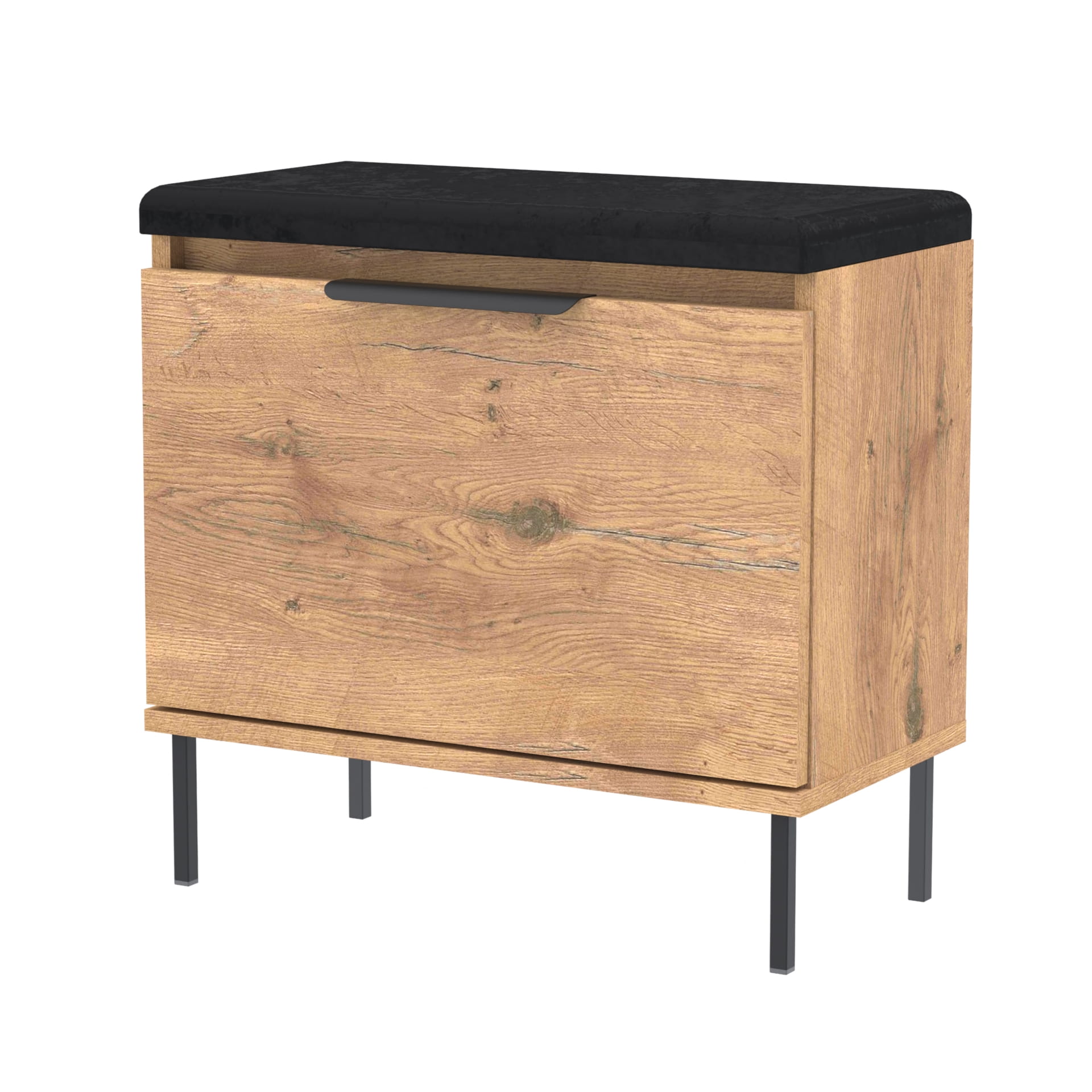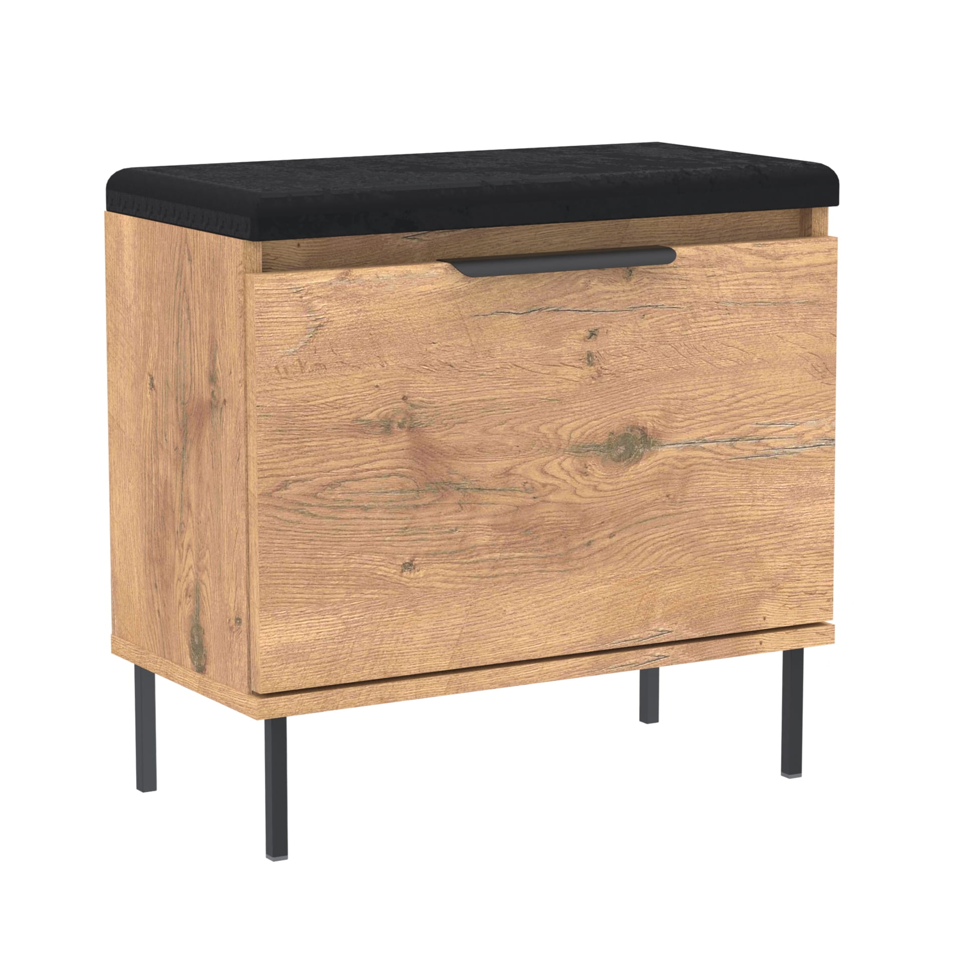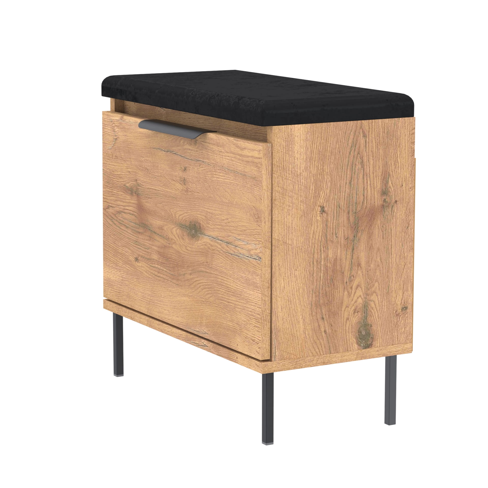 Stylowa i funkcjonalna szafka na buty z pełnymi drzwiami, wyposażona w metalowy uchwyt, miękkie siedzisko oraz praktyczny schowek na akcesoria. Idealnie sprawdzi się w przedpokoju, łącząc wygodę użytkowania z estetycznym wyglądem.