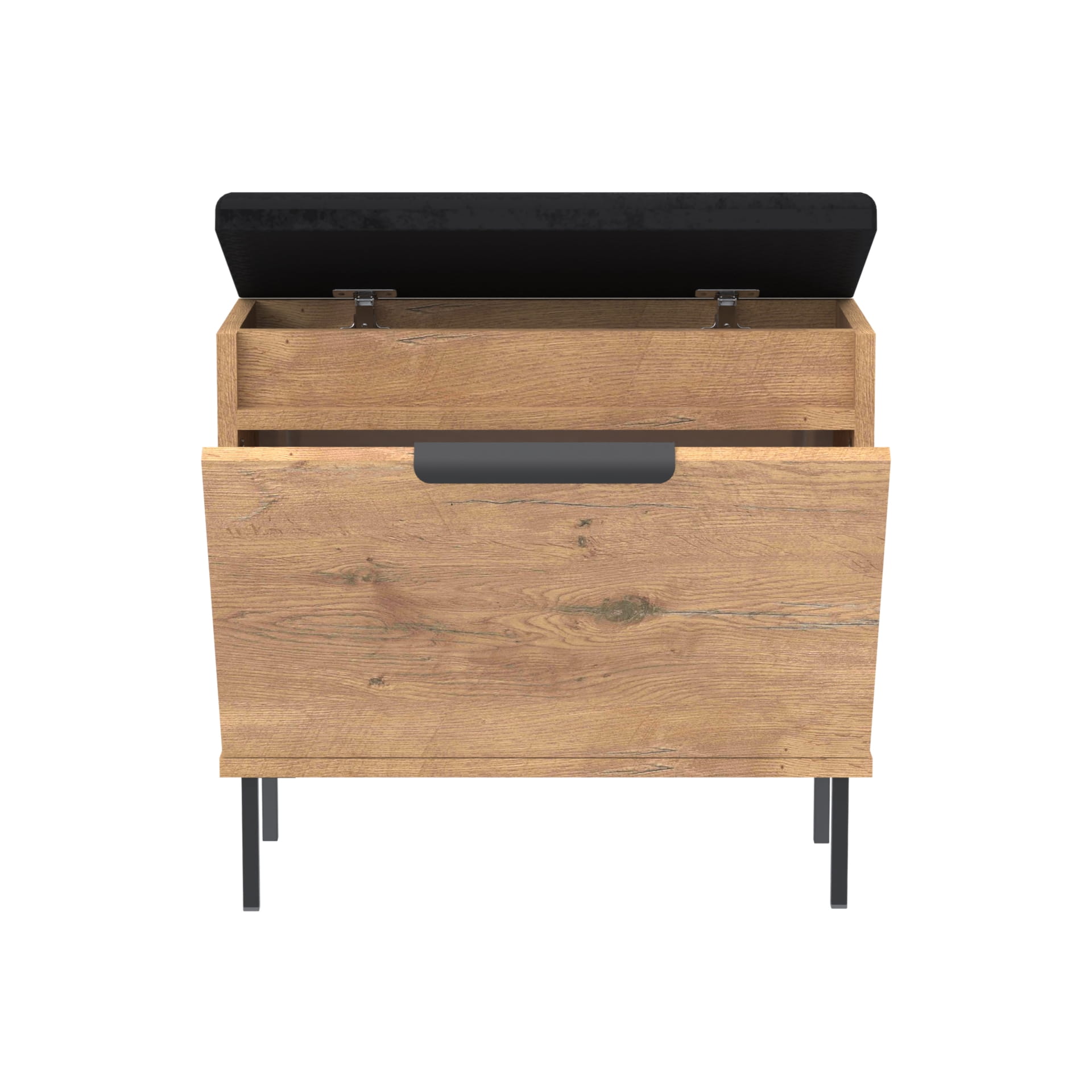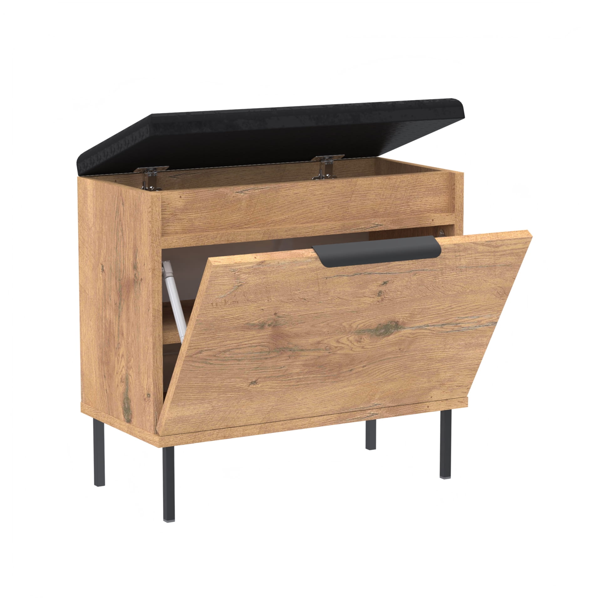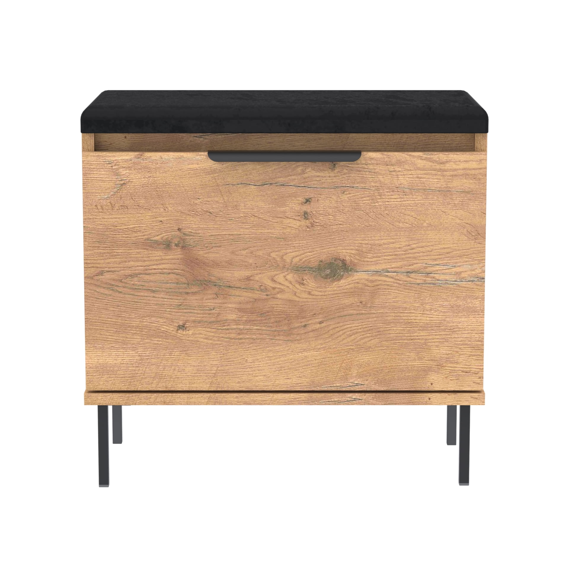 Stylowa i funkcjonalna szafka na buty z pełnymi drzwiami, wyposażona w metalowy uchwyt, miękkie siedzisko oraz praktyczny schowek na akcesoria. Idealnie sprawdzi się w przedpokoju, łącząc wygodę użytkowania z estetycznym wyglądem.