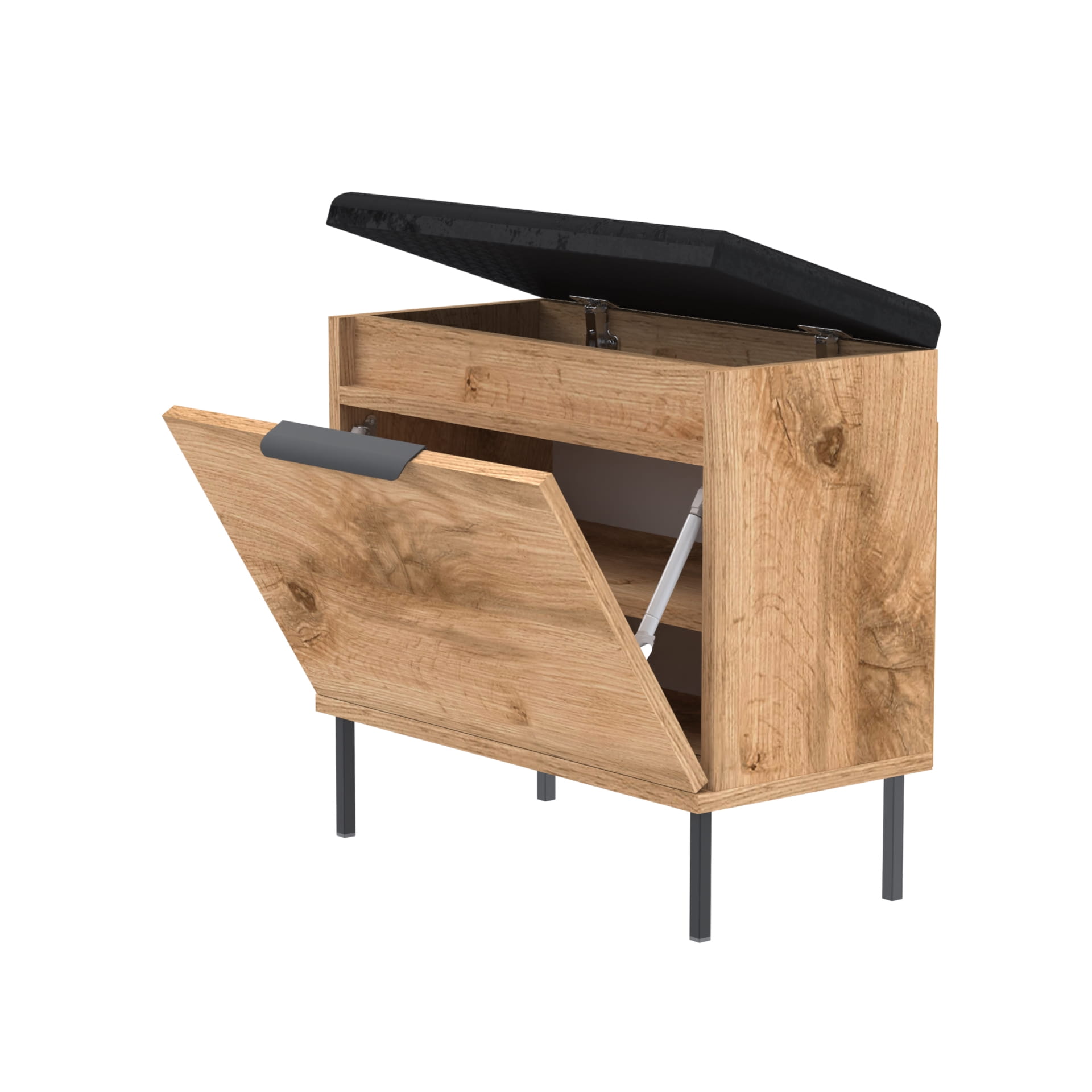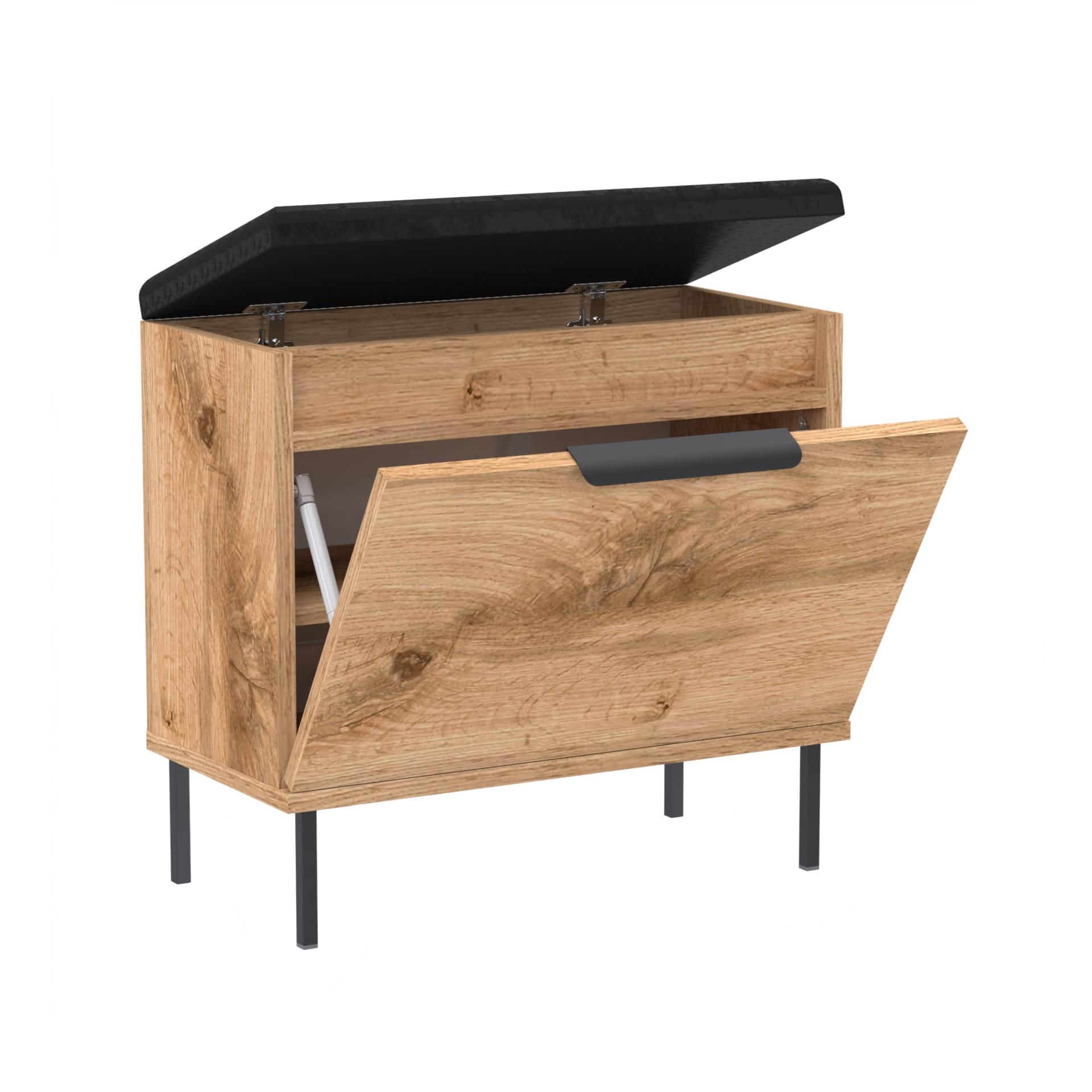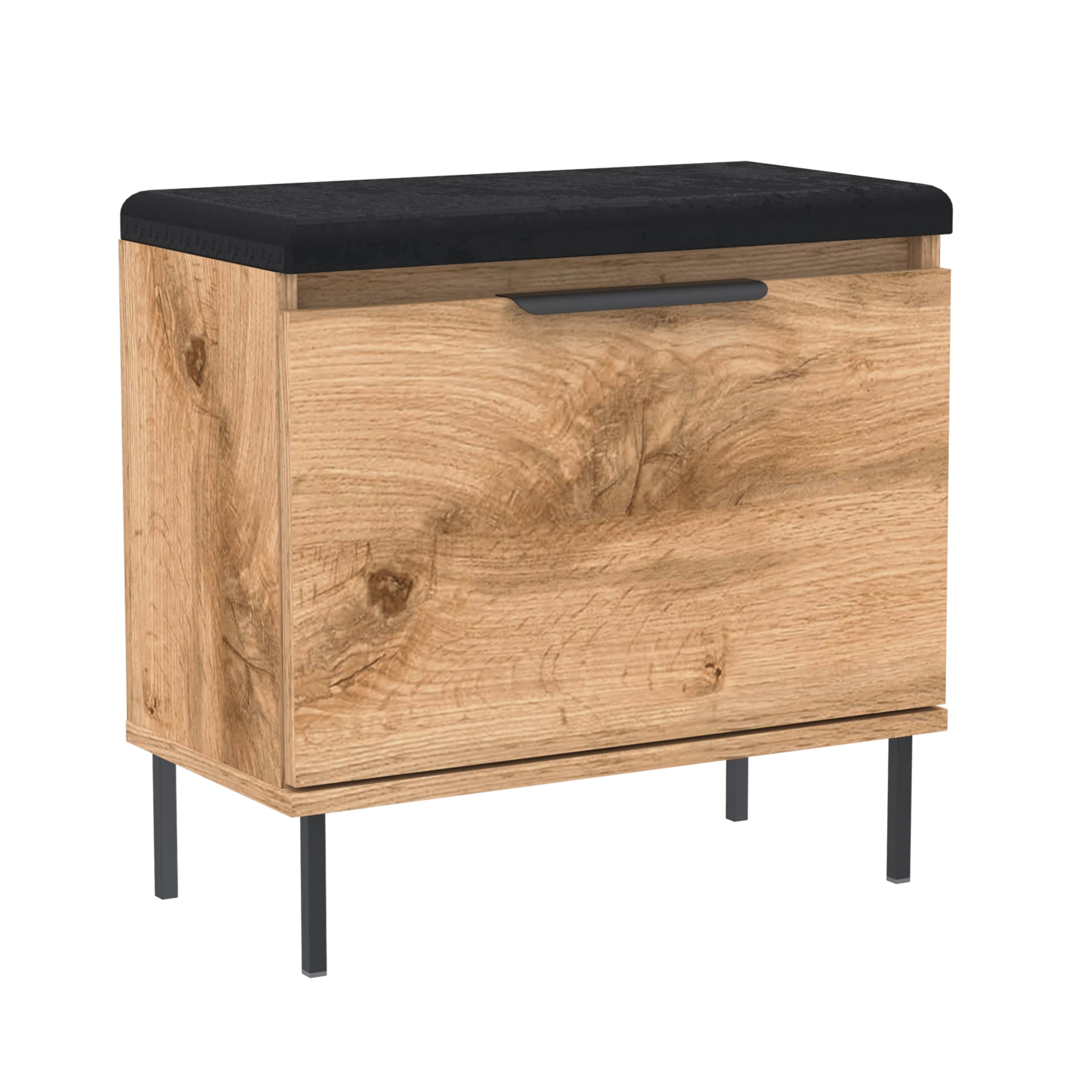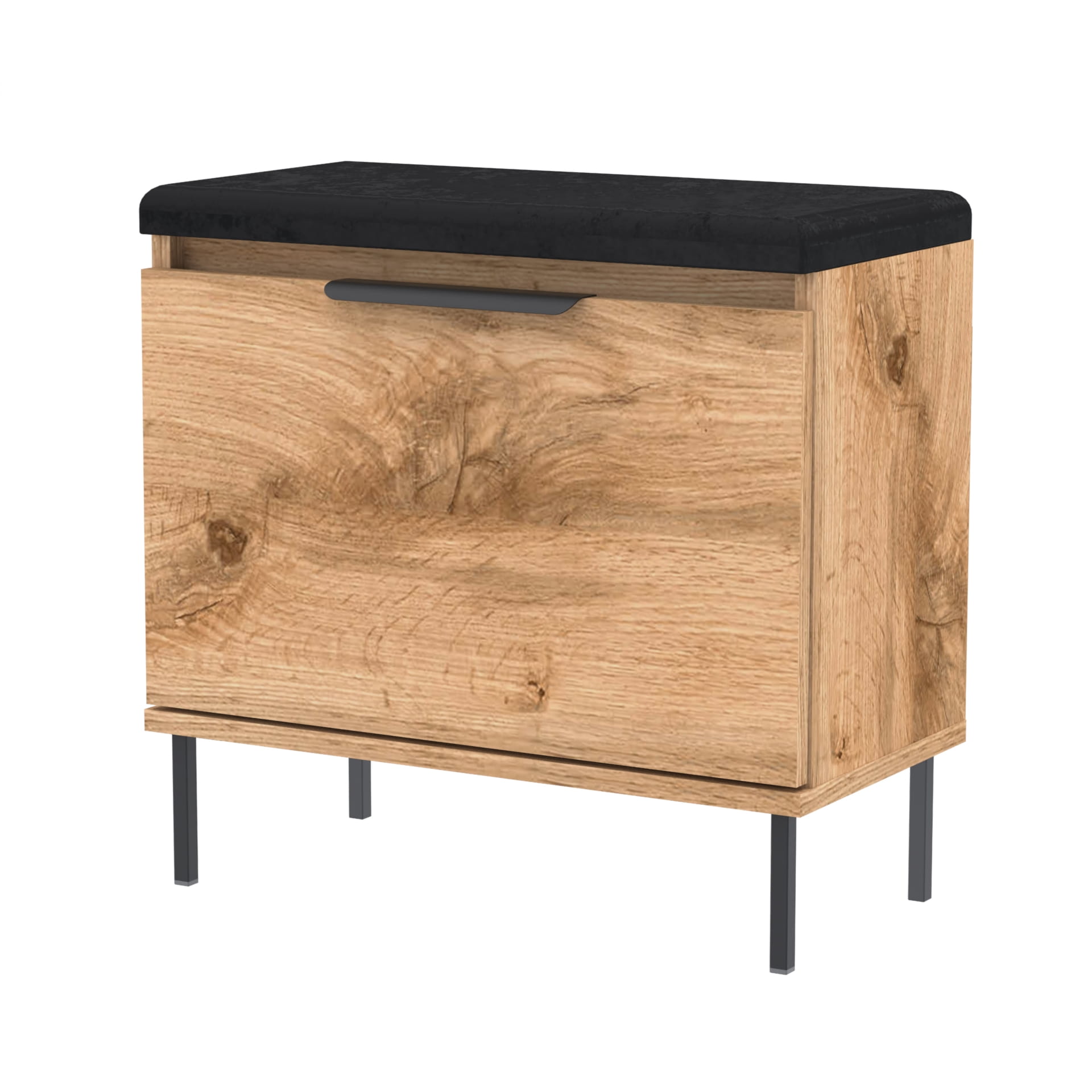 Praktyczna i stylowa szafka na buty z pełnymi drzwiami, solidnym metalowym uchwytem, miękkim siedziskiem oraz dodatkowym schowkiem na akcesoria. Idealnie sprawdzi się w przedpokoju, oferując wygodę i estetyczny wygląd w jednym.