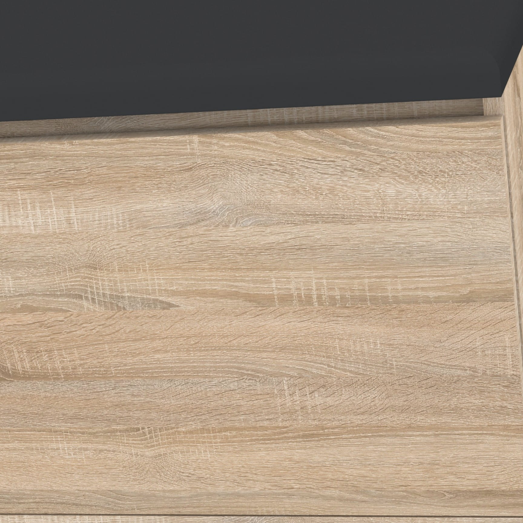 Wykonana jest z grubej, 18 mm płyty meblowej laminowanej, co gwarantuje jej trwałość i odporność na uszkodzenia. Brzegi szafki pokryte są twardym obrzeżem ABS o grubości 0,5 mm, które jest odporne na uszkodzenia.