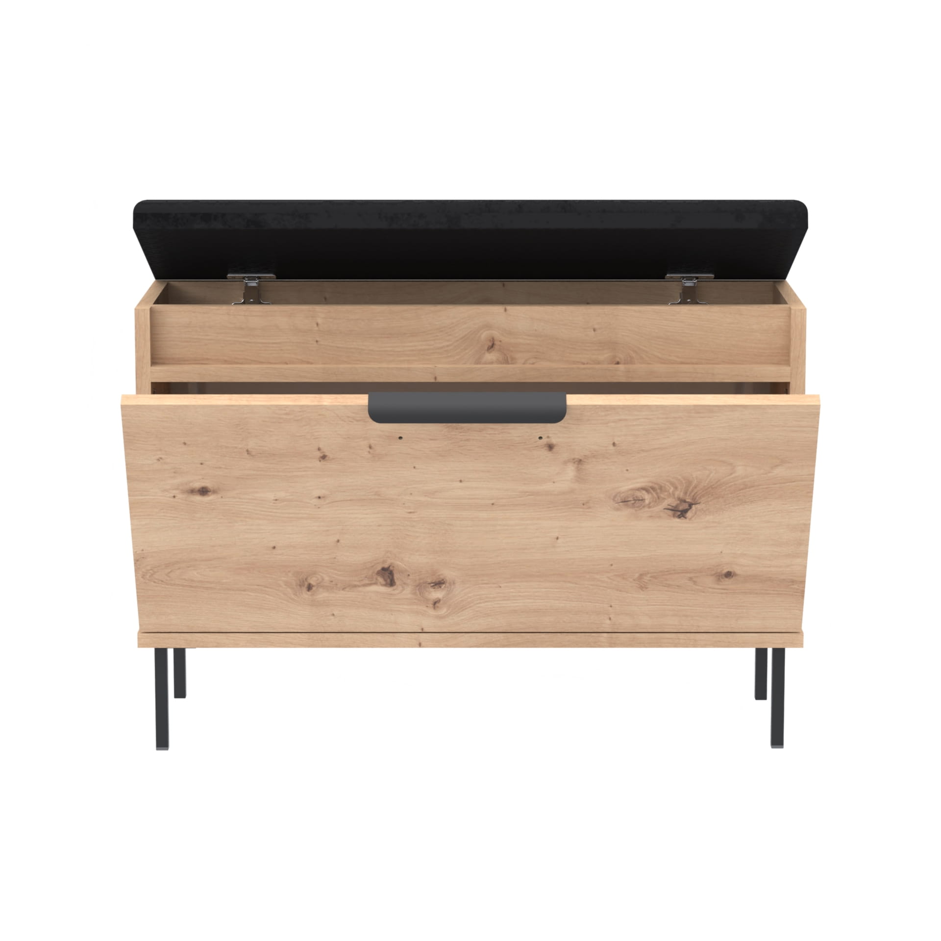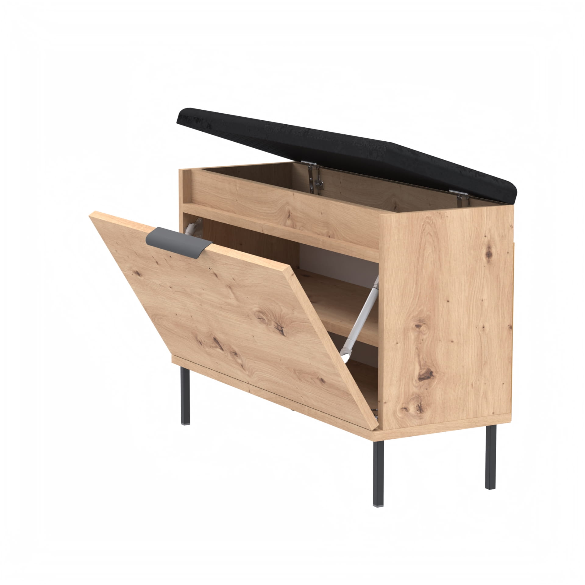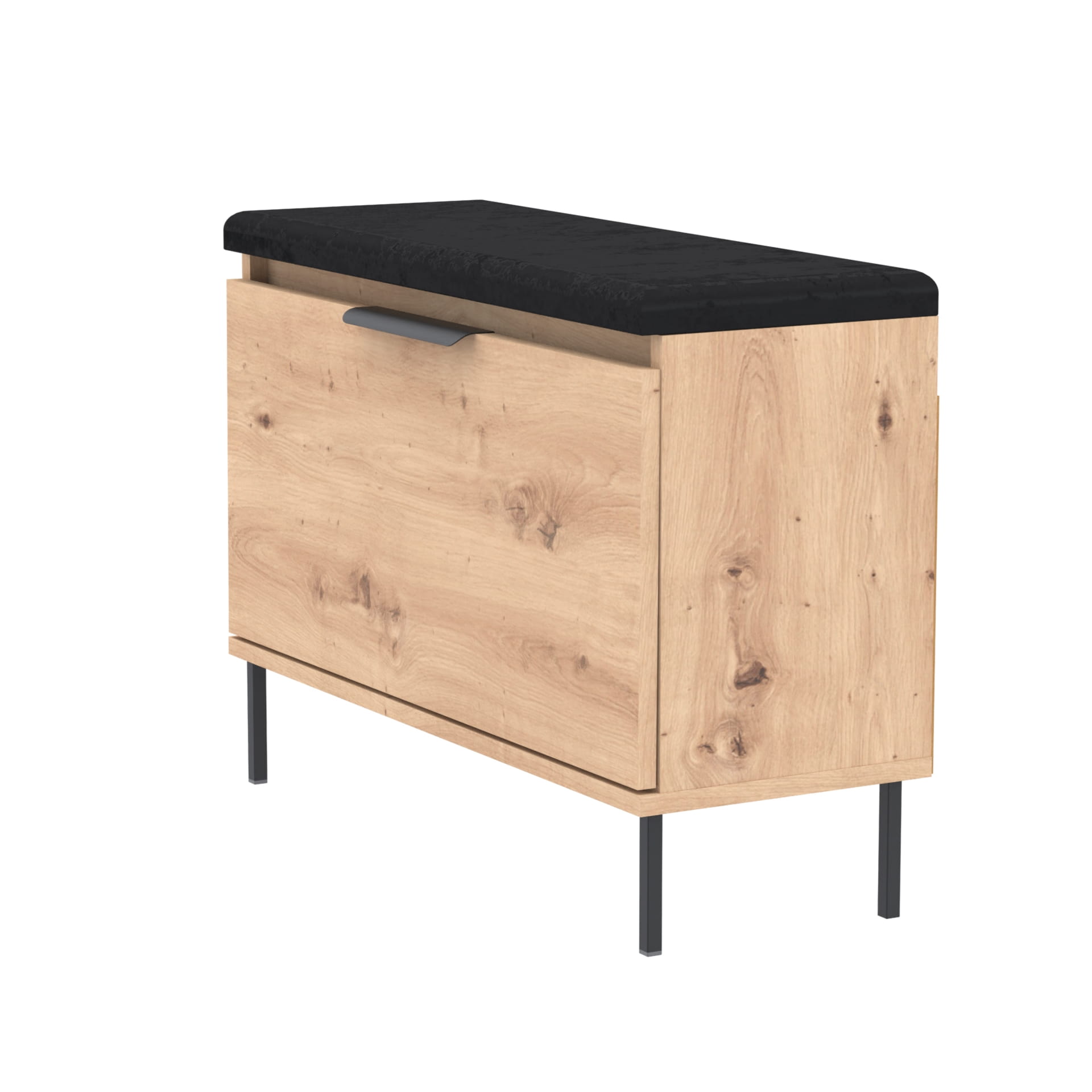 Nowoczesna i funkcjonalna szafka na buty z pełnymi drzwiami, eleganckim metalowym uchwytem, wygodnym siedziskiem oraz praktycznym schowkiem na akcesoria. Doskonała do przedpokoju – łączy komfort użytkowania z efektownym wyglądem.