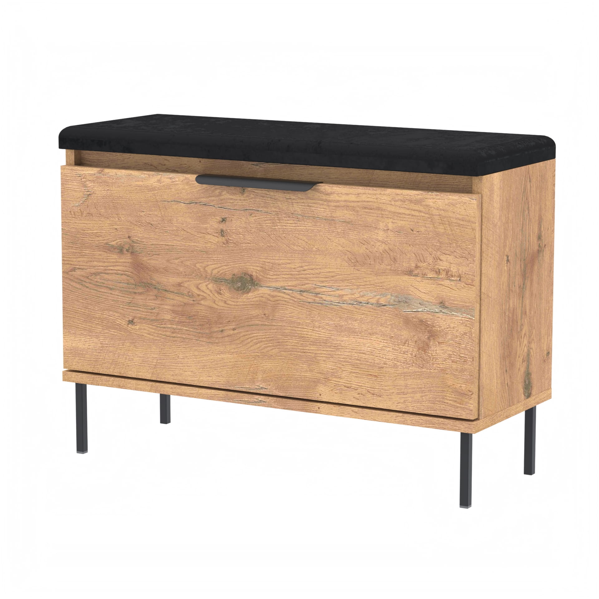 Stylowa i funkcjonalna szafka na buty z pełnymi drzwiami, wyposażona w metalowy uchwyt, miękkie siedzisko oraz praktyczny schowek na akcesoria. Idealnie sprawdzi się w przedpokoju, łącząc wygodę użytkowania z estetycznym wyglądem.