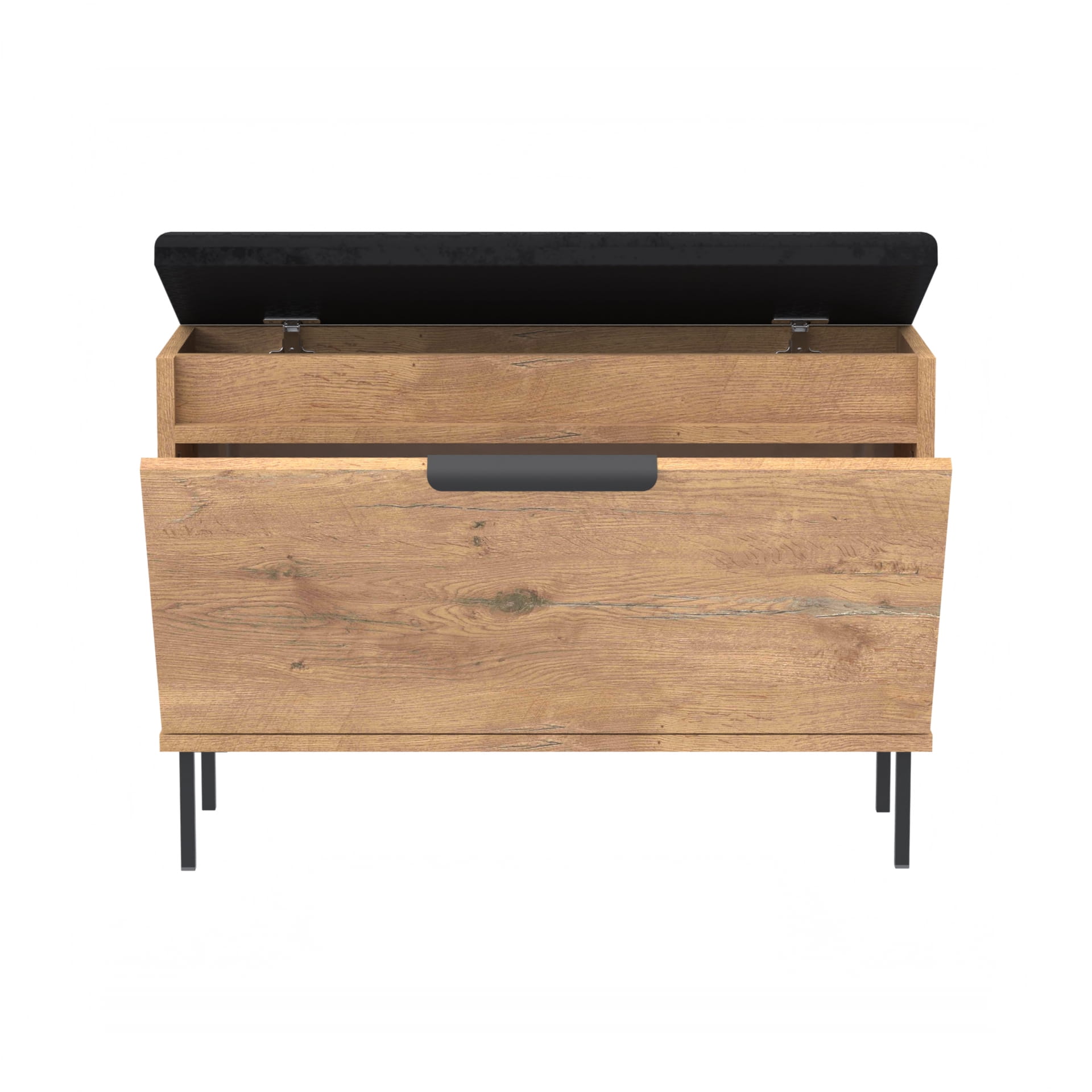 Stylowa i funkcjonalna szafka na buty z pełnymi drzwiami, wyposażona w metalowy uchwyt, miękkie siedzisko oraz praktyczny schowek na akcesoria. Idealnie sprawdzi się w przedpokoju, łącząc wygodę użytkowania z estetycznym wyglądem.