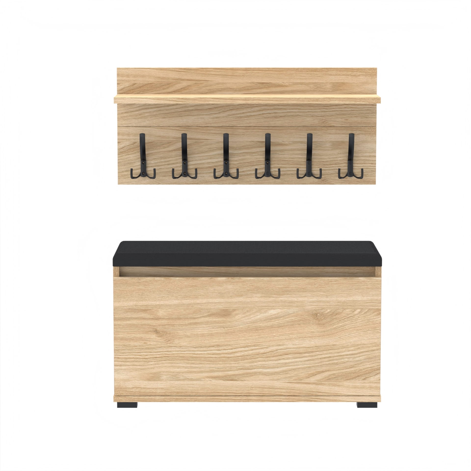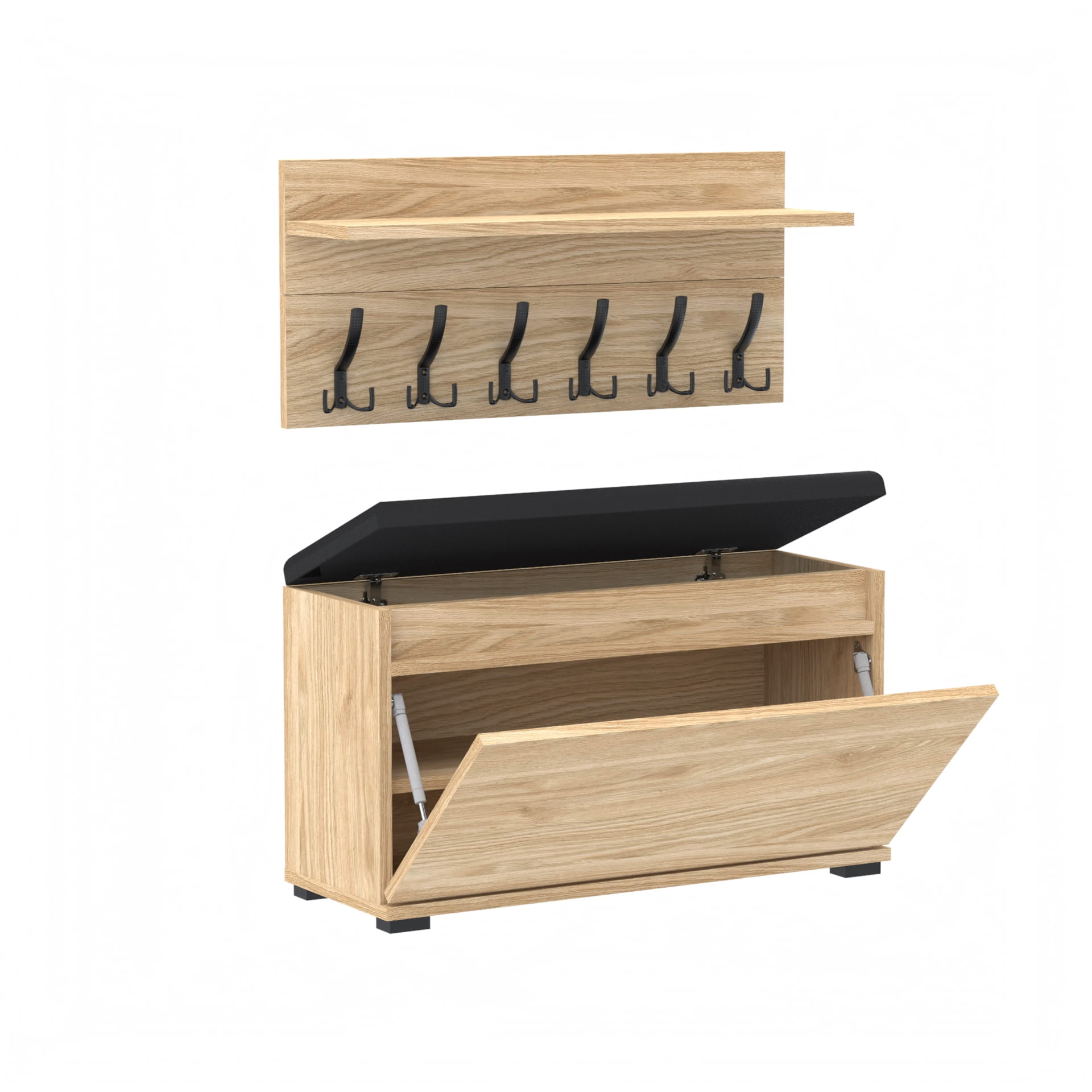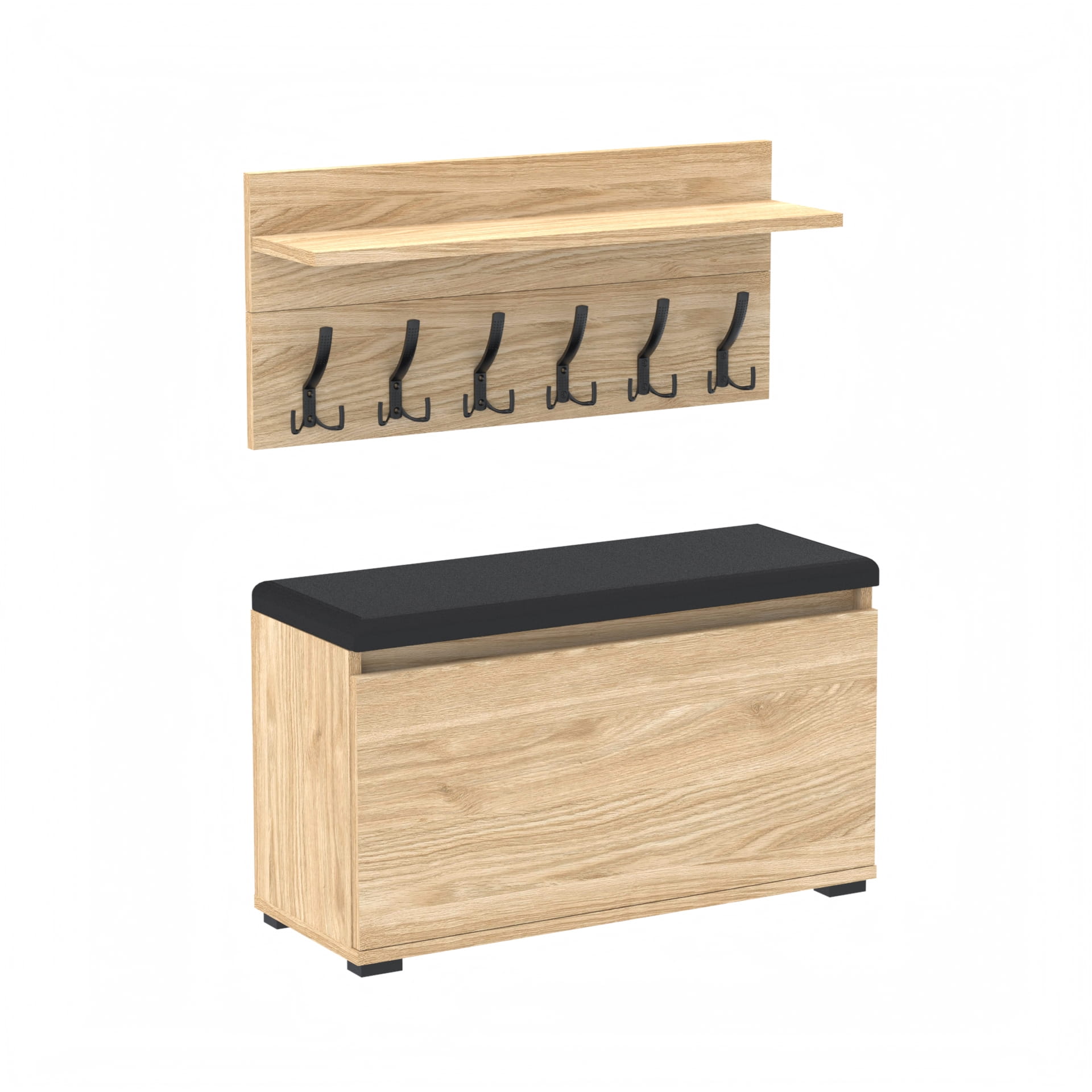 Szafka na buty z siedziskiem tapicerowanym, schowkiem plus wieszak ścienny