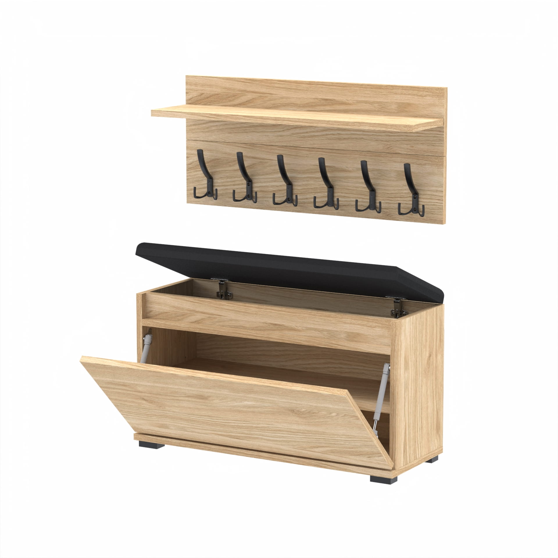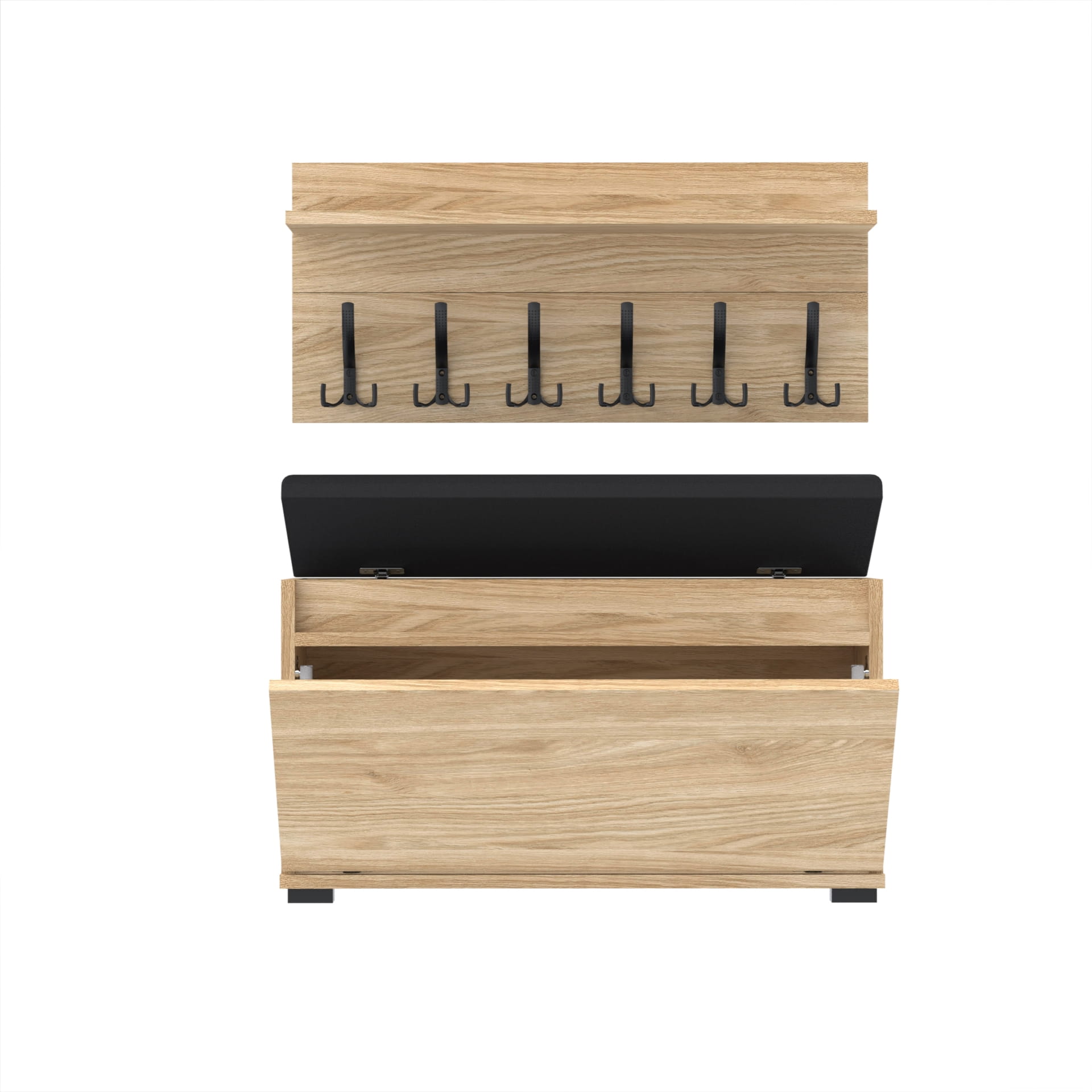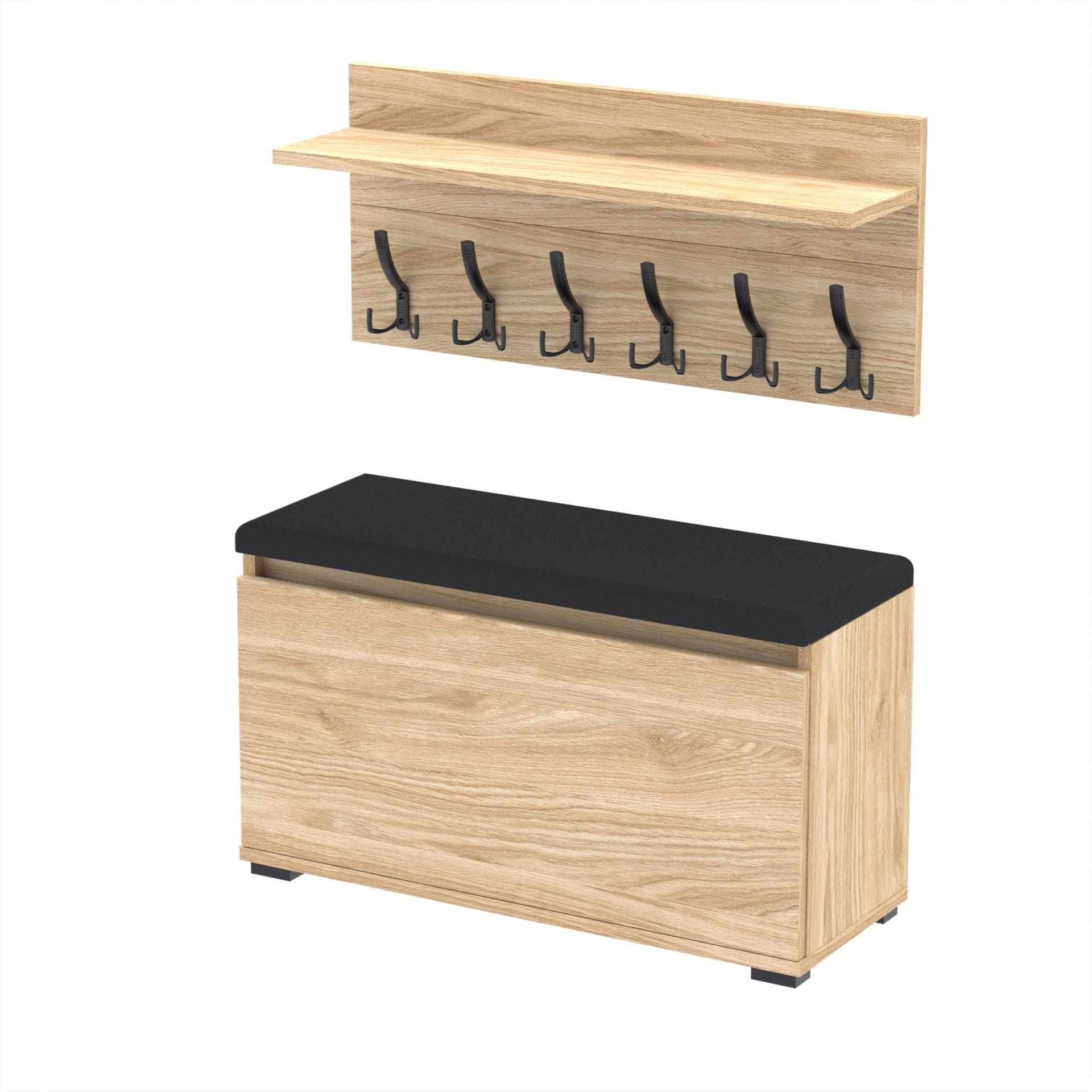 Szafka na buty z siedziskiem tapicerowanym, schowkiem plus wieszak ścienny