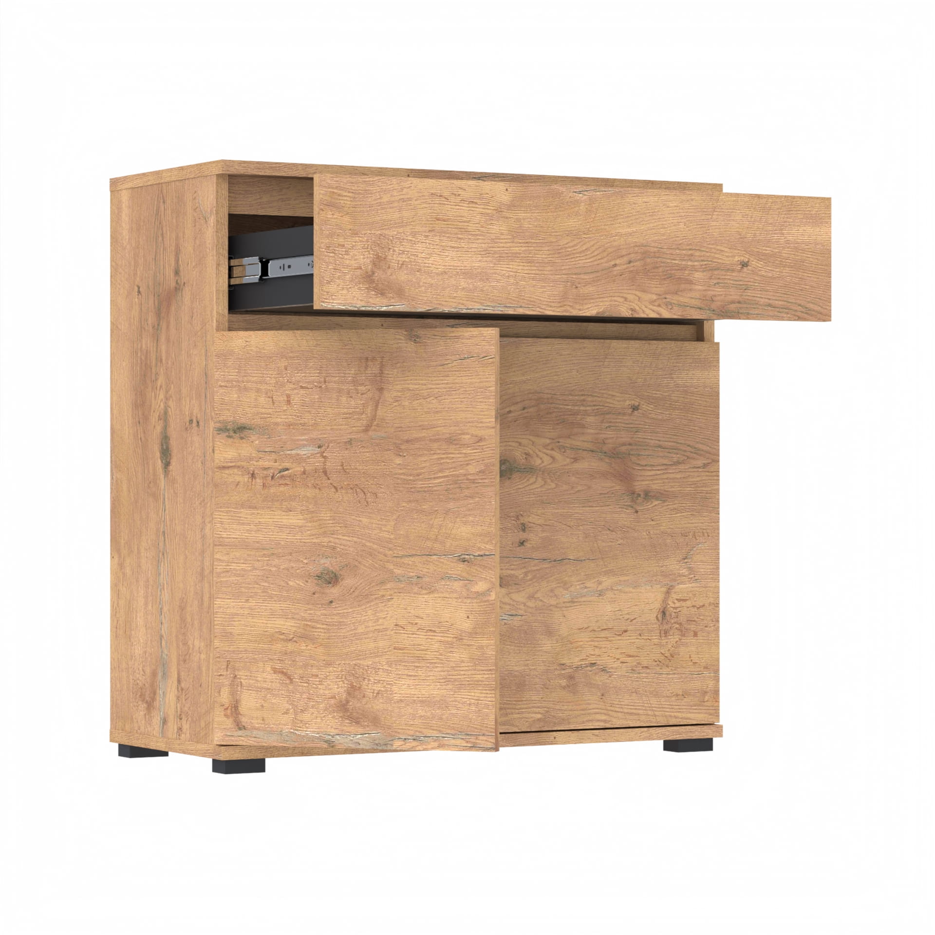 Szafka zawiera szufladę z twardym dnem który nie ugina się pod ciężarem przedmiotów.