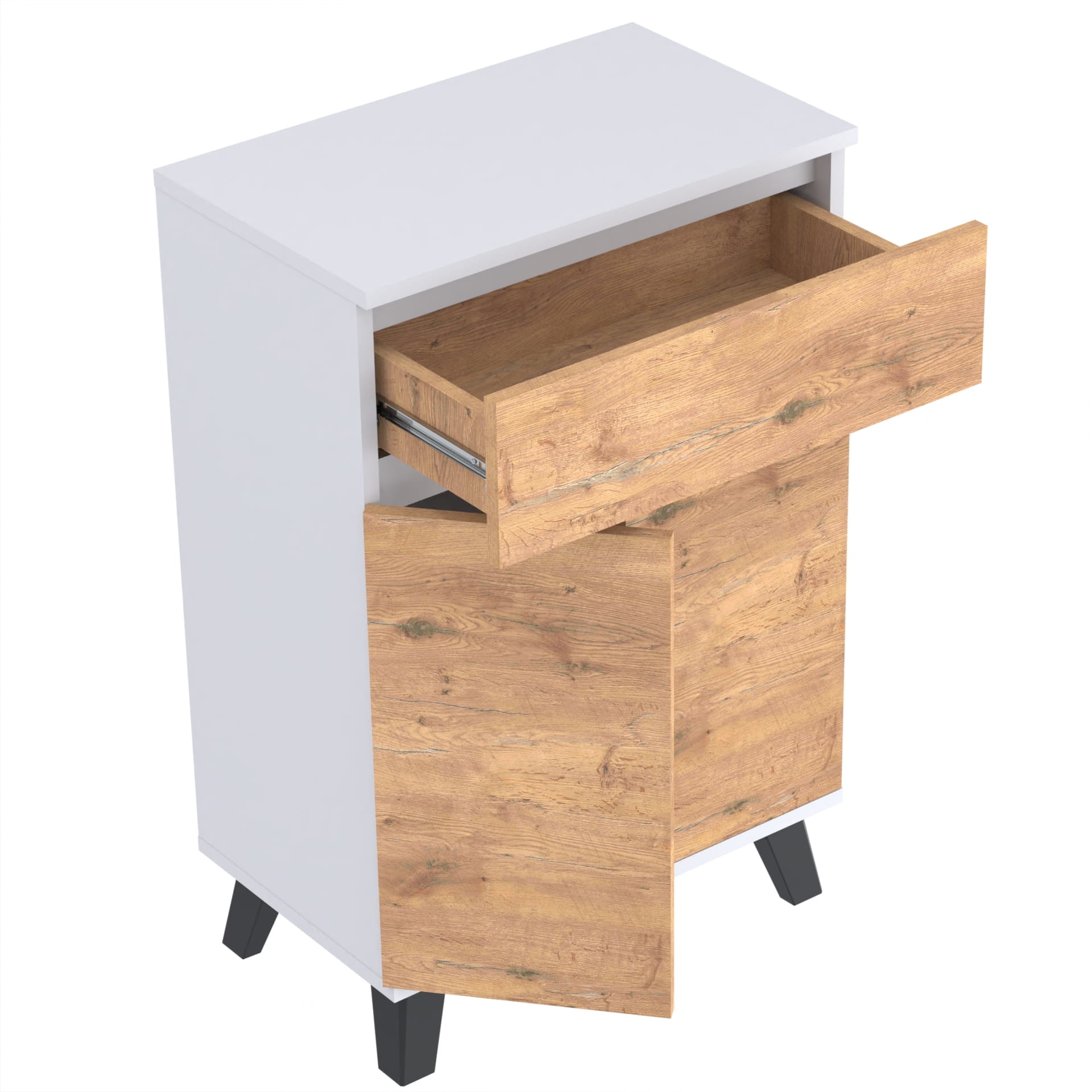 Dodatkowo, metalowe zawiasy z hamulcem i okucia zapewniają trwałość i stabilność. Szuflada wyposażona jest w wygodne, kulkowe prowadnice, zapewniające płynne i ciche otwieranie.