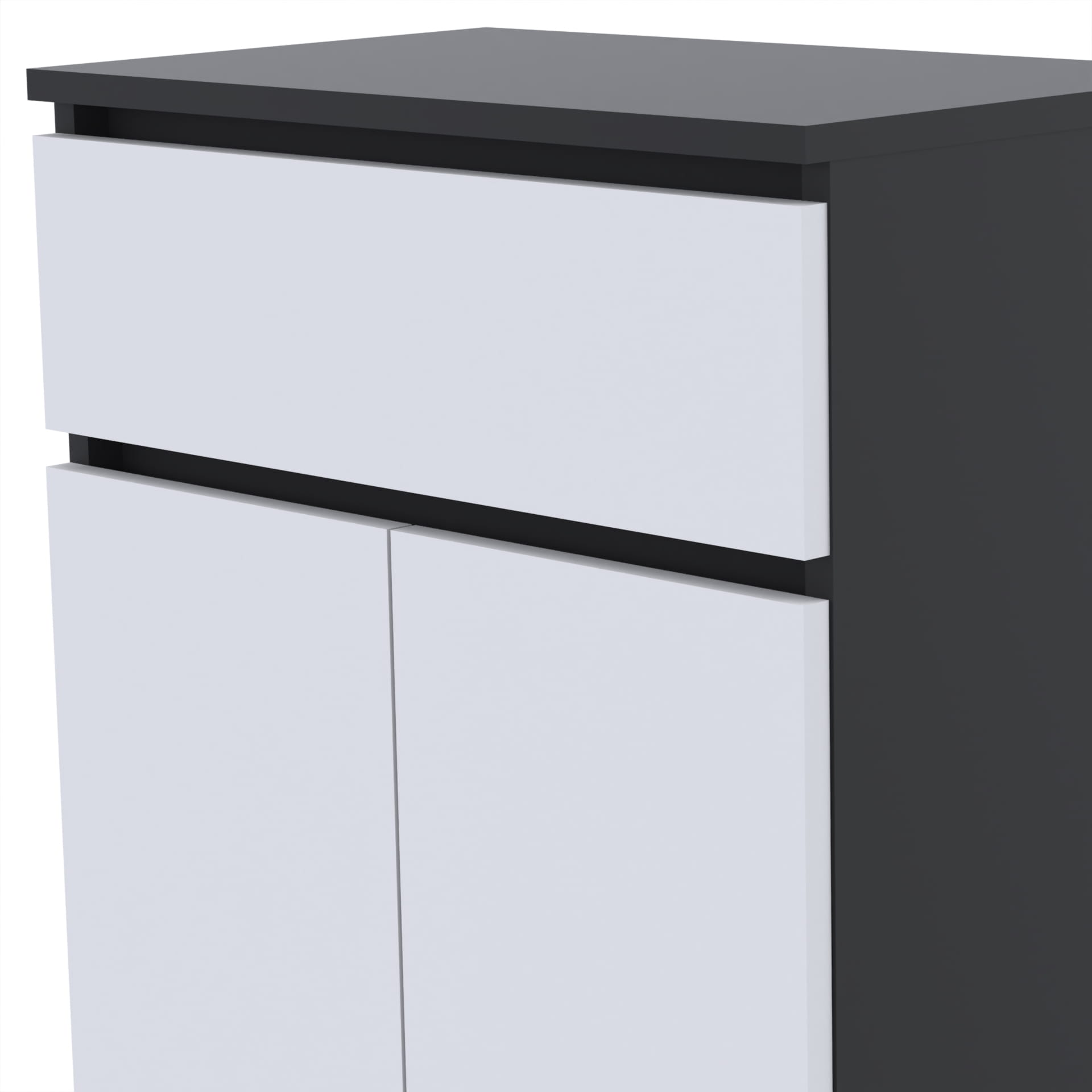 Nasze meble wykonane są z wysokiej jakości 18mm płyt meblowych od polskich producentów, które posiadają niezbędne certyfikaty i atesty higieniczne. Szafka wyposażona jest w szufladę z twardym dnem, które nie ugina się pod ciężarem, oraz w twarde, odporne na uderzenia obrzeże ABS. Tył szafki wykonany jest z płyty HDF o grubości 3mm.