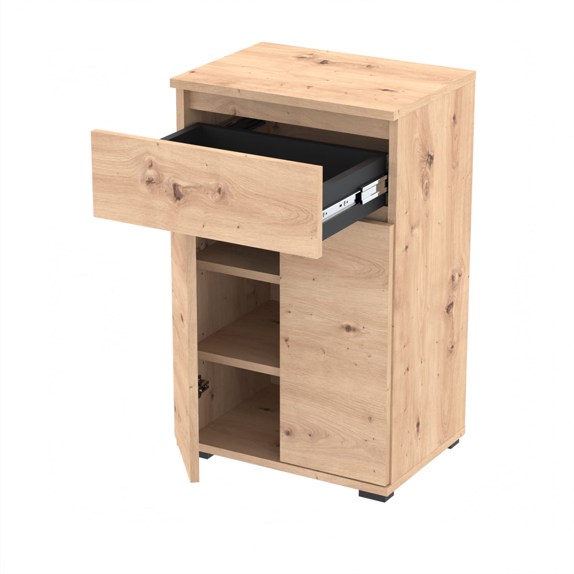 Dodatkowo, metalowe zawiasy z hamulcem i okucia zapewniają trwałość i stabilność. Szuflada wyposażona jest w wygodne, kulkowe prowadnice, zapewniające płynne i ciche otwieranie.