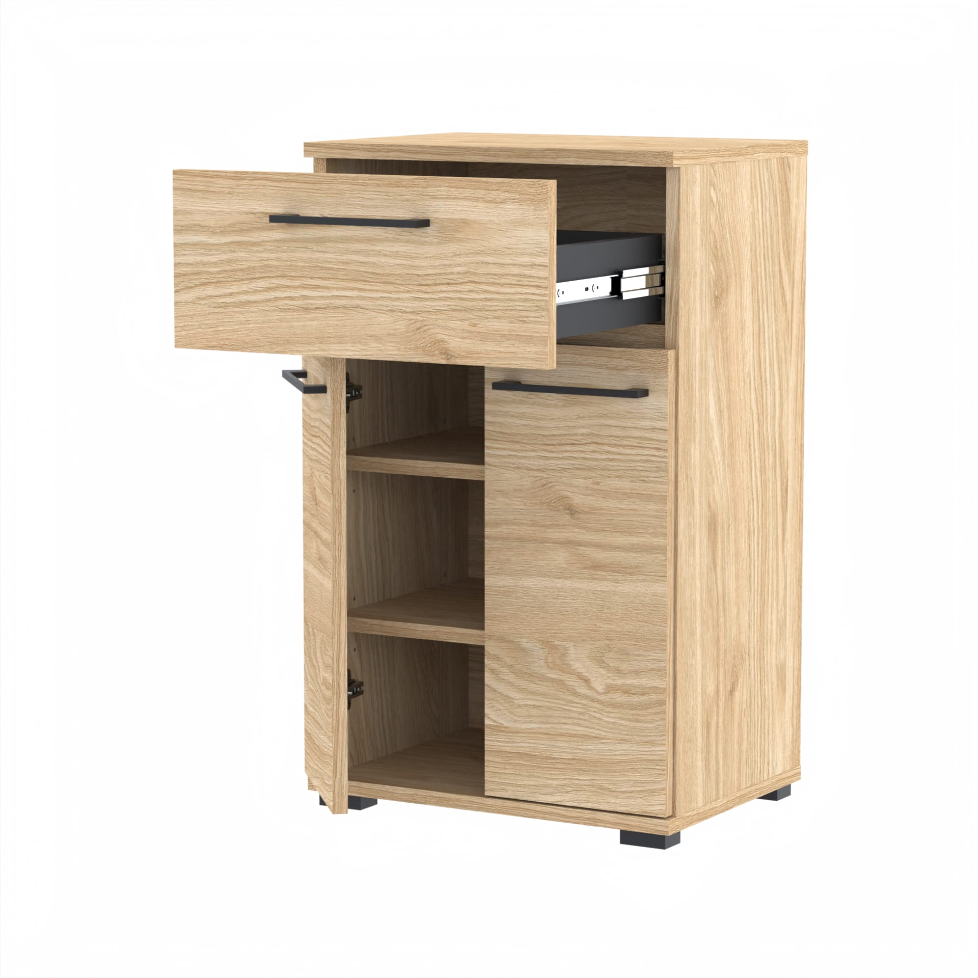 Dodatkowo, metalowe zawiasy z hamulcem i okucia zapewniają trwałość i stabilność. Szuflada wyposażona jest w wygodne, kulkowe prowadnice, zapewniające płynne i ciche otwieranie.