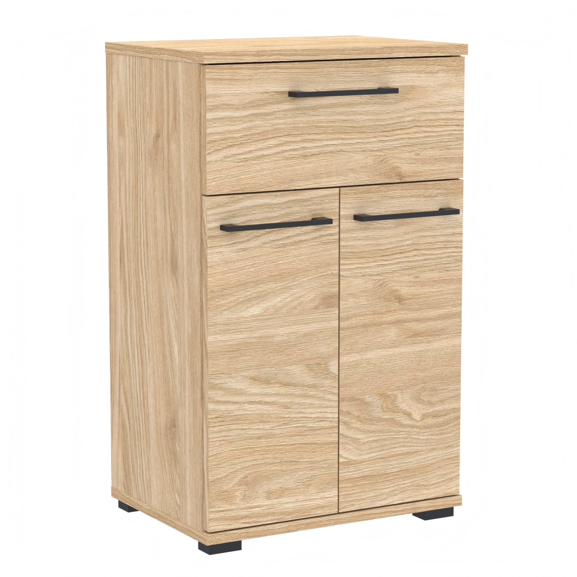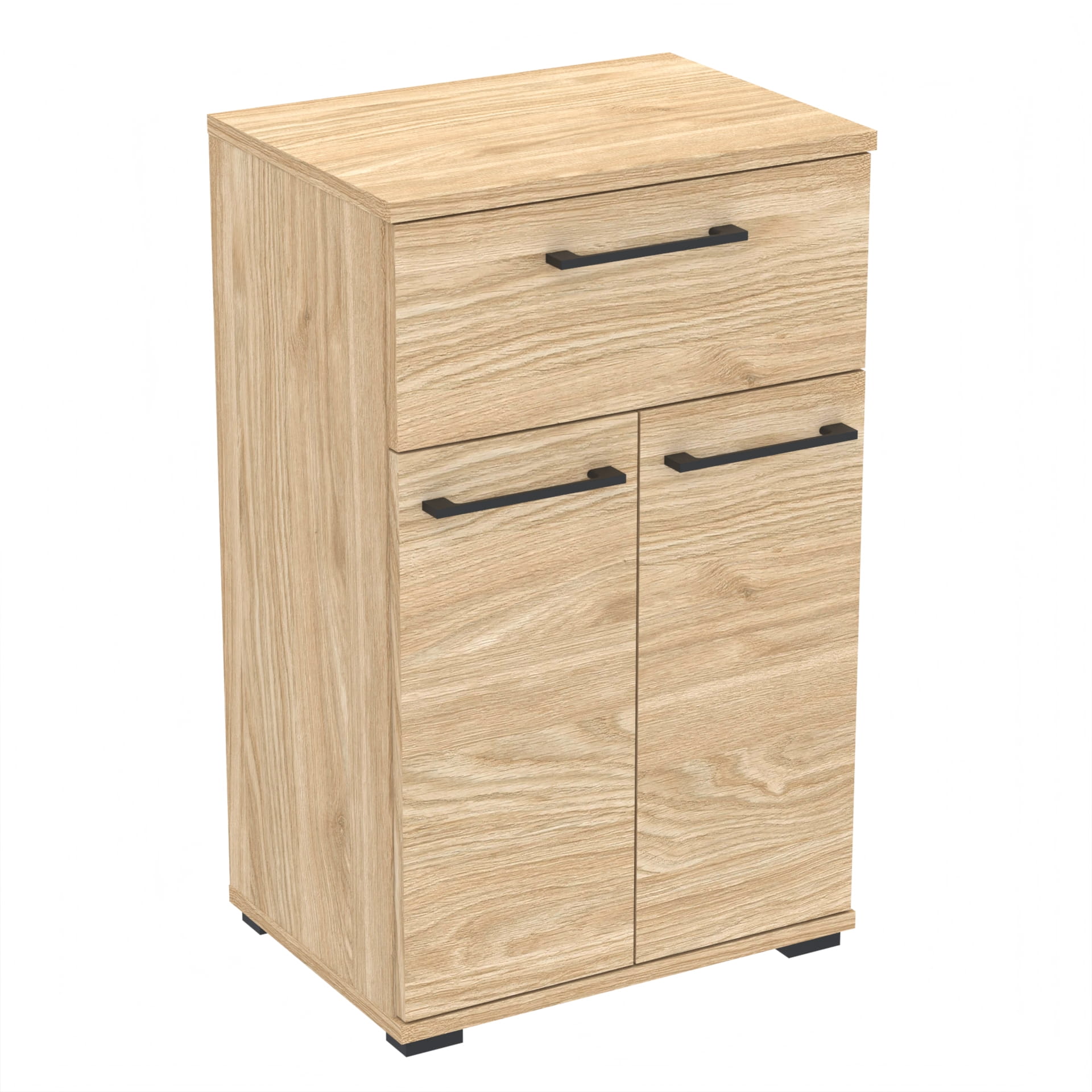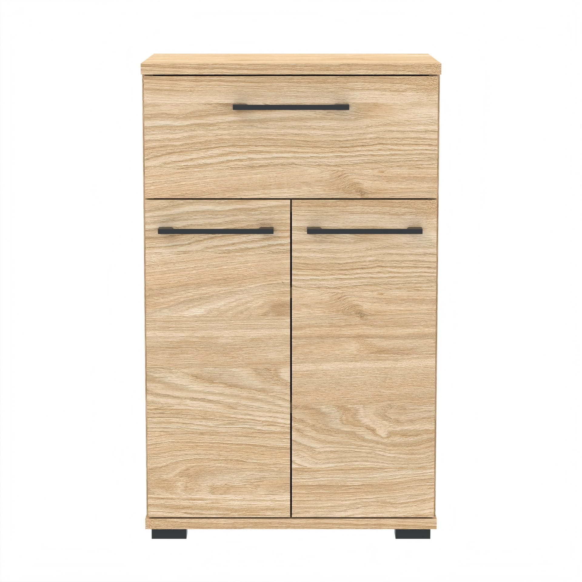 Nasze meble wykonane są z wysokiej jakości 18mm płyt meblowych od polskich producentów, które posiadają niezbędne certyfikaty i atesty higieniczne. Szafka wyposażona jest w szufladę z twardym dnem, które nie ugina się pod ciężarem, oraz w twarde, odporne na uderzenia obrzeże ABS. Tył szafki wykonany jest z płyty HDF o grubości 3mm.