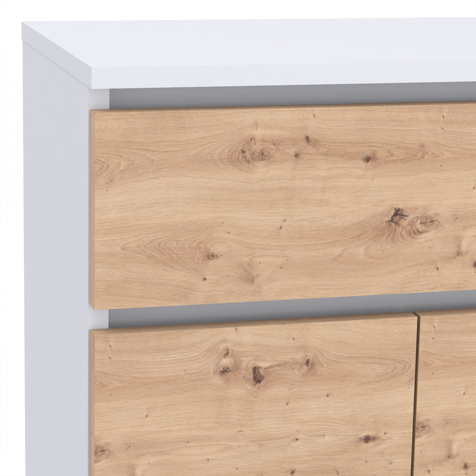 Wykonana z 18mm płyty meblowej, szafka posiada twarde, odporne na uderzenia obrzeże ABS, co zapewnia jej długą żywotność i odporność na codzienne użytkowanie. Szuflada jest wyposażona w twardy dół, który nie ugina się pod ciężarem przechowywanych przedmiotów, zapewniając bezpieczne przechowywanie.
