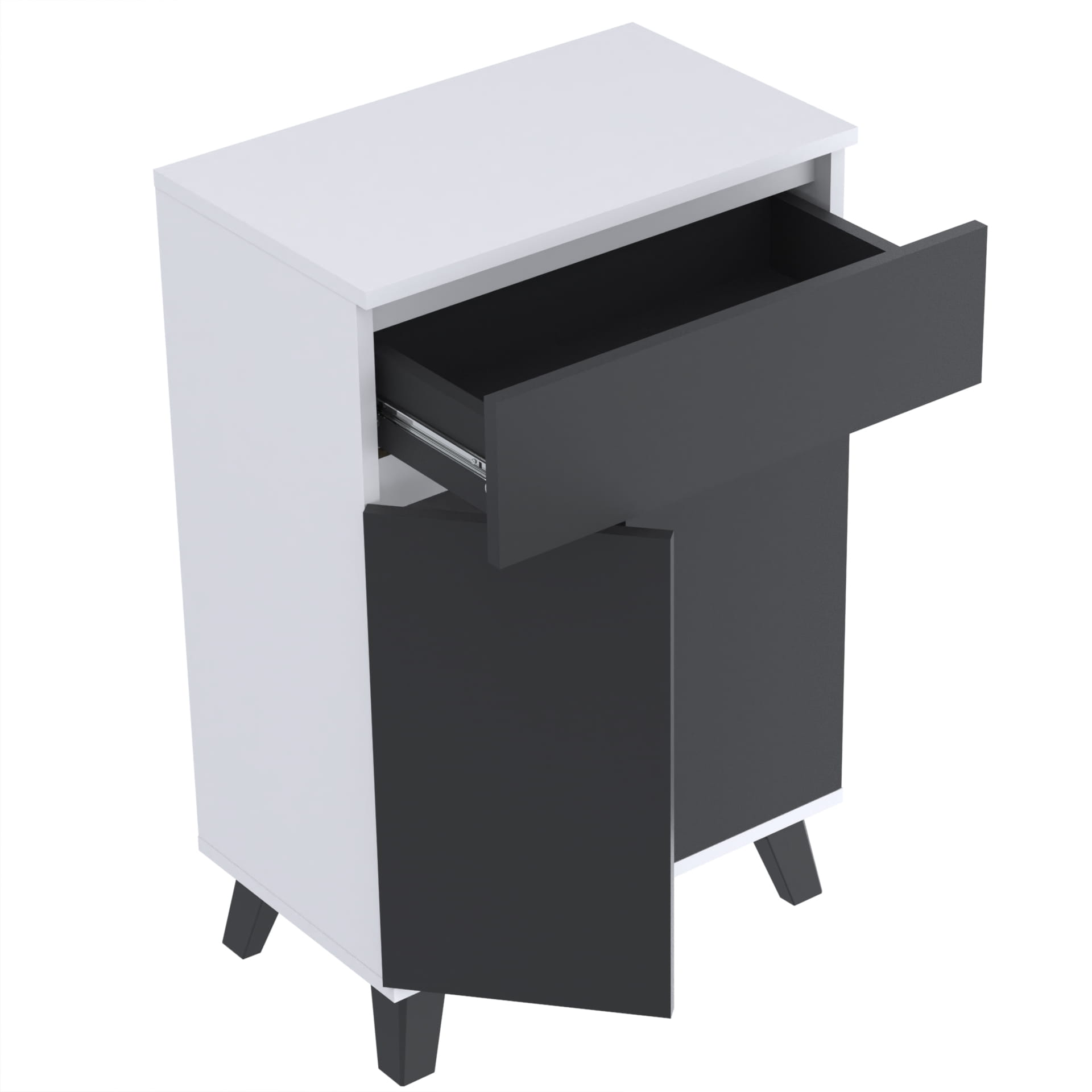 Szafka "TRES" oferuje trzy poziomy przechowywania wewnątrz, co umożliwia łatwe i uporządkowane przechowywanie. Kulkowe prowadnice szuflad umożliwiają łatwe i płynne otwieranie i zamykanie szuflady, a metalowe zawiasy i okucia gwarantują jej trwałość i bezawaryjność.