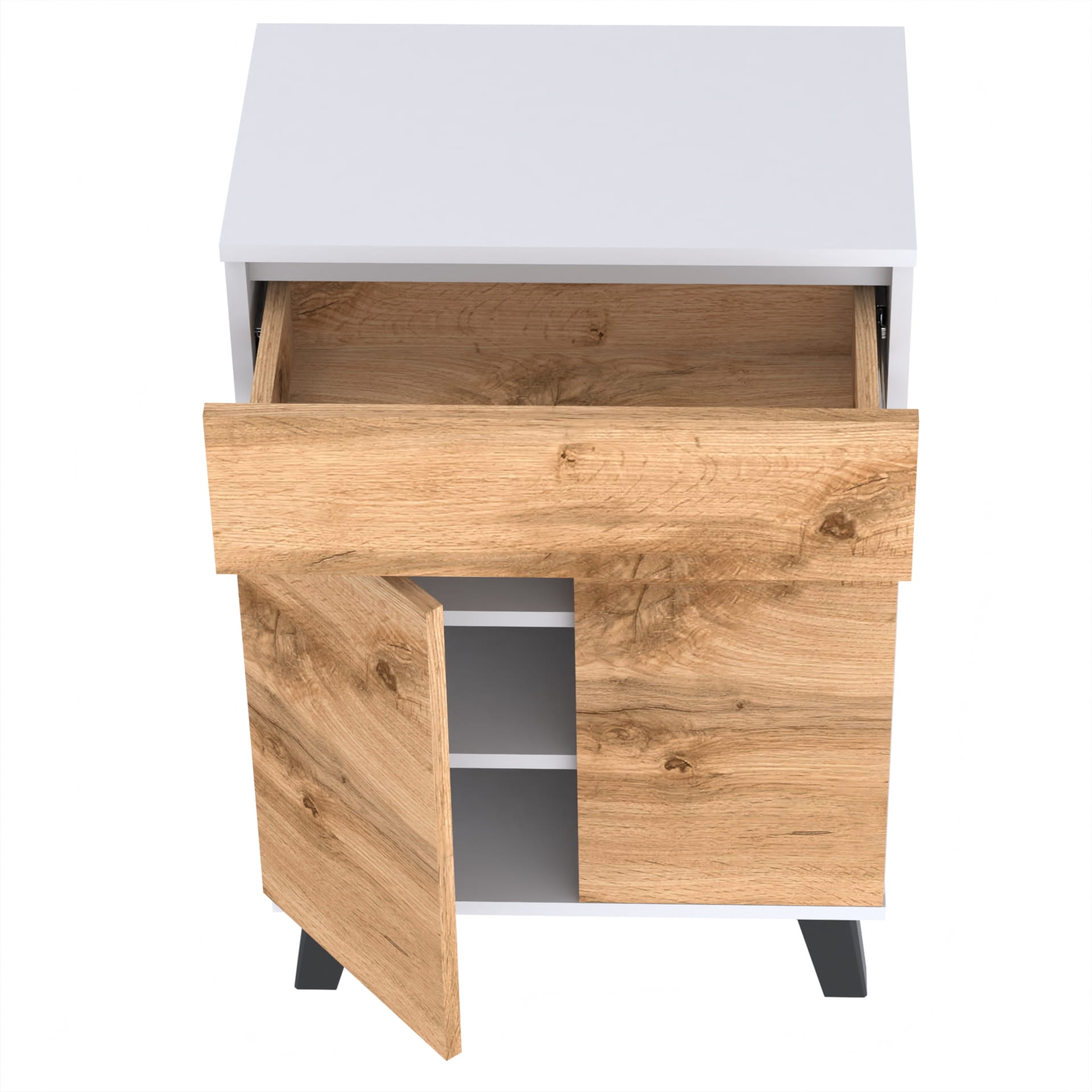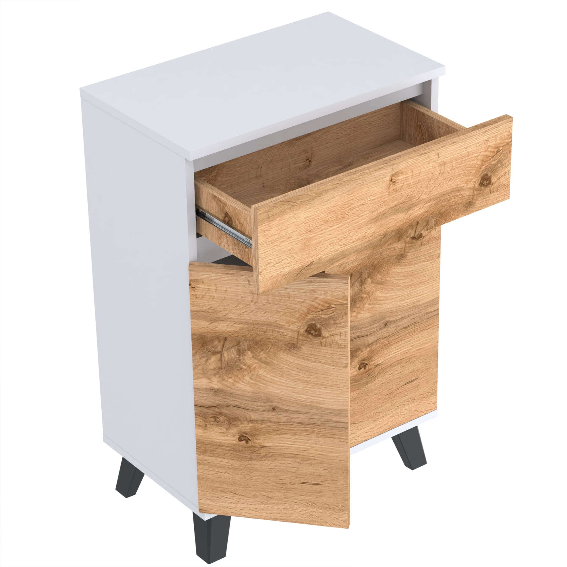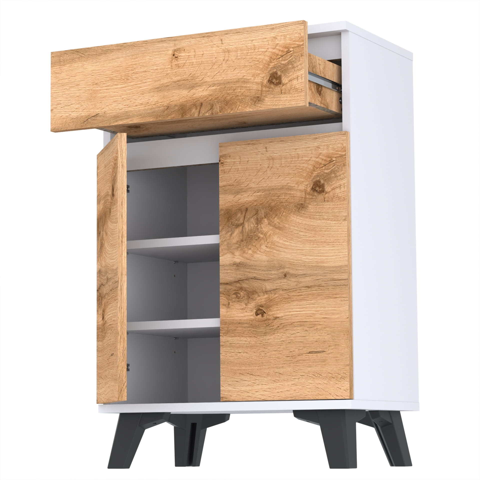 Szafka "TRES" oferuje trzy poziomy przechowywania wewnątrz, co umożliwia łatwe i uporządkowane przechowywanie. Kulkowe prowadnice szuflad umożliwiają łatwe i płynne otwieranie i zamykanie szuflady, a metalowe zawiasy i okucia gwarantują jej trwałość i bezawaryjność.