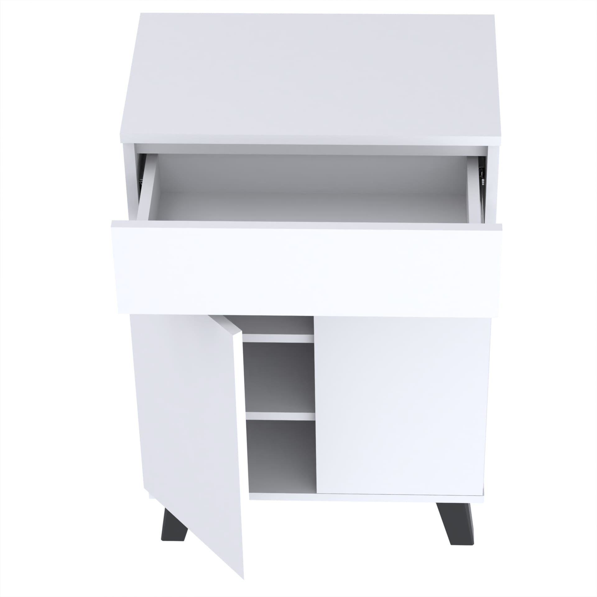 Szafka "TRES" oferuje trzy poziomy przechowywania wewnątrz, co umożliwia łatwe i uporządkowane przechowywanie. Kulkowe prowadnice szuflad umożliwiają łatwe i płynne otwieranie i zamykanie szuflady, a metalowe zawiasy i okucia gwarantują jej trwałość i bezawaryjność.