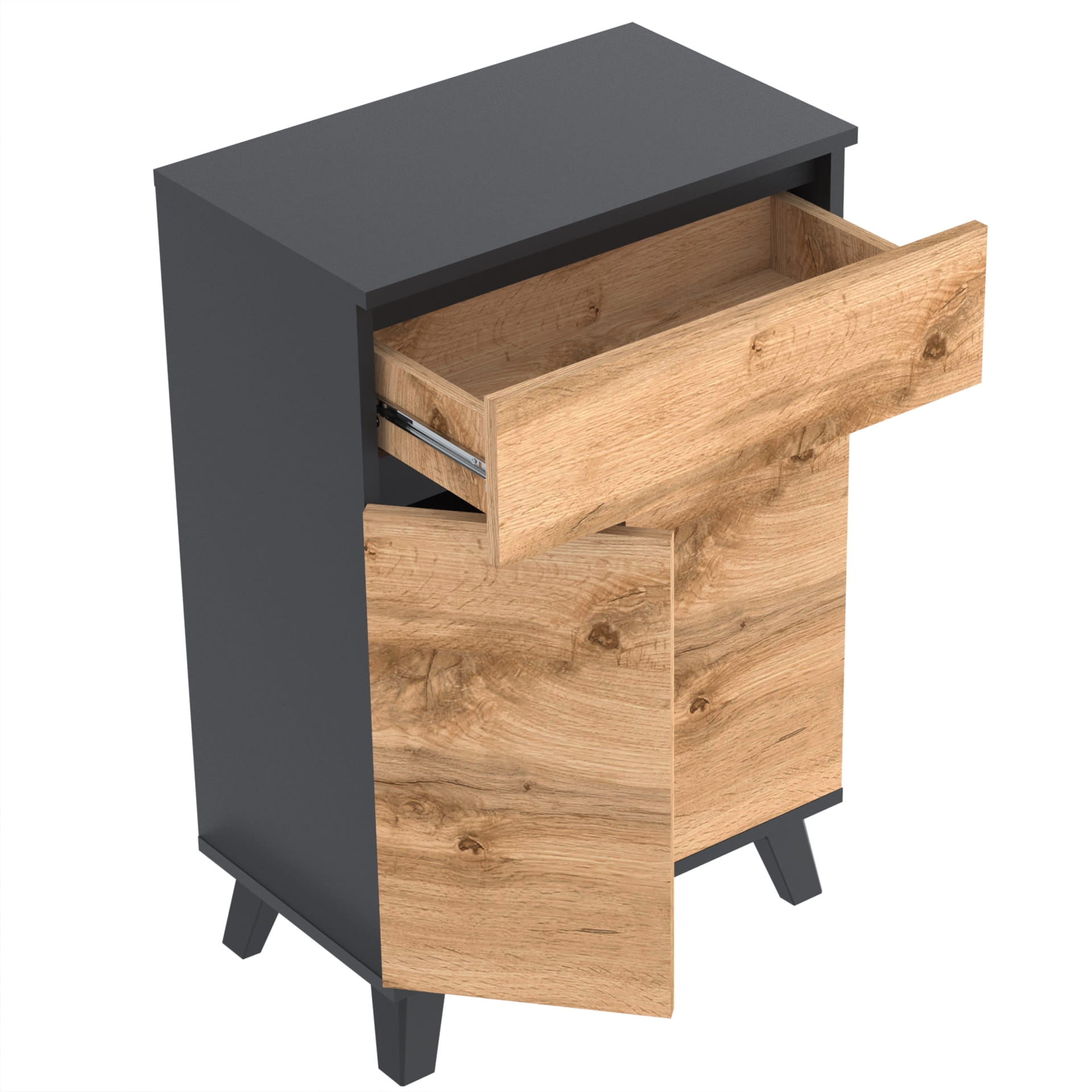 Szafka "TRES" oferuje trzy poziomy przechowywania wewnątrz, co umożliwia łatwe i uporządkowane przechowywanie. Kulkowe prowadnice szuflad umożliwiają łatwe i płynne otwieranie i zamykanie szuflady, a metalowe zawiasy i okucia gwarantują jej trwałość i bezawaryjność.