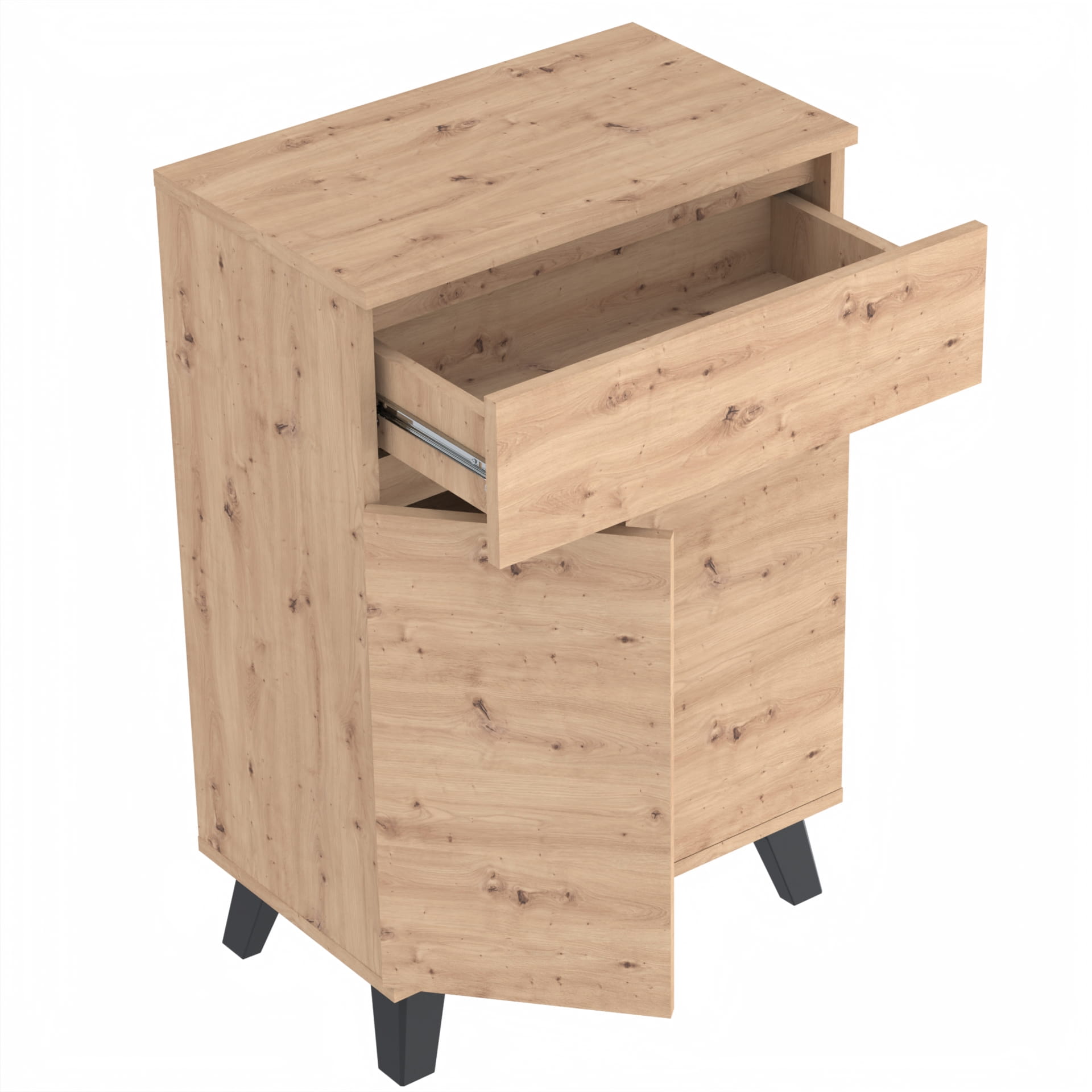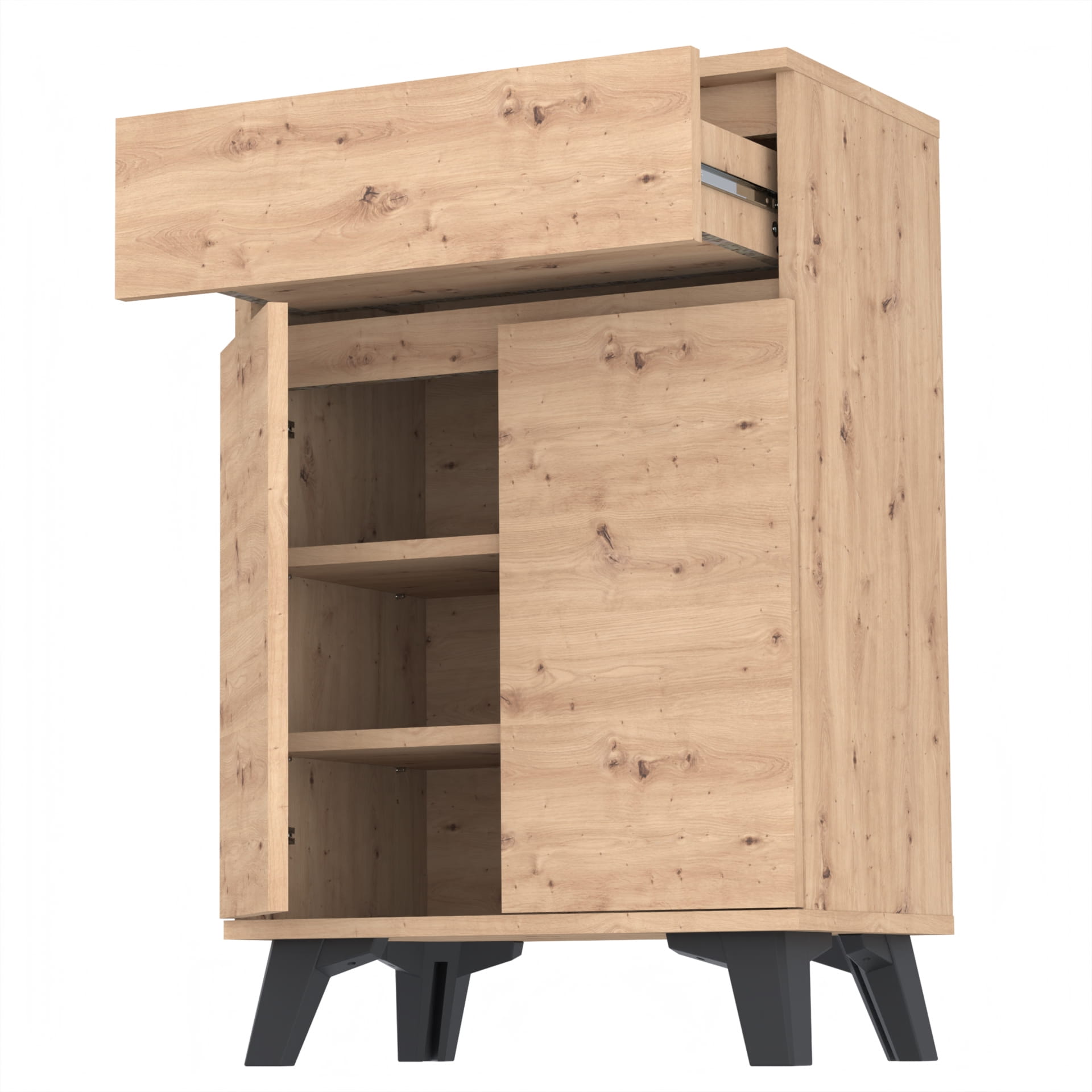 Szafka "TRES" oferuje trzy poziomy przechowywania wewnątrz, co umożliwia łatwe i uporządkowane przechowywanie. Kulkowe prowadnice szuflad umożliwiają łatwe i płynne otwieranie i zamykanie szuflady, a metalowe zawiasy i okucia gwarantują jej trwałość i bezawaryjność.