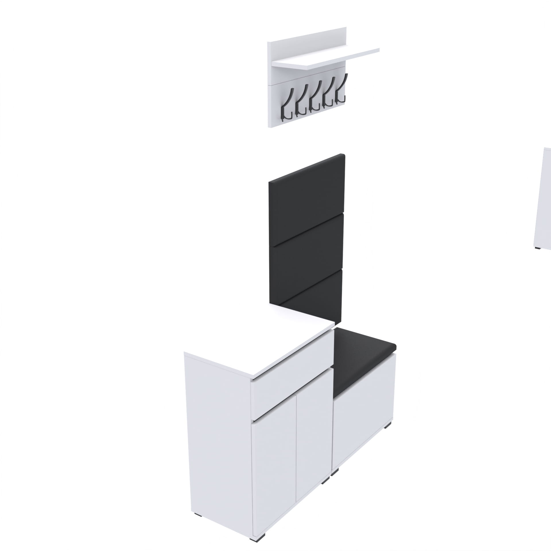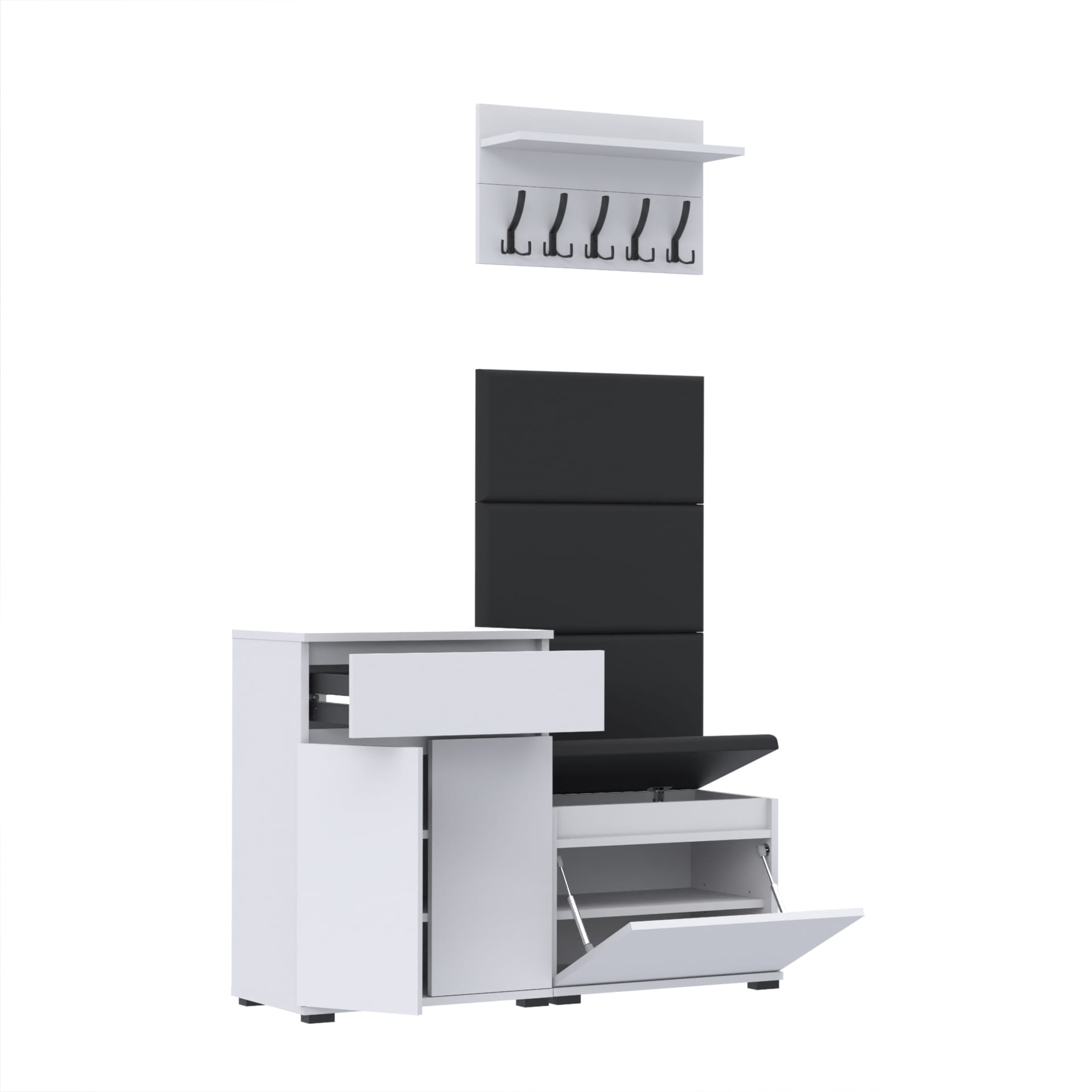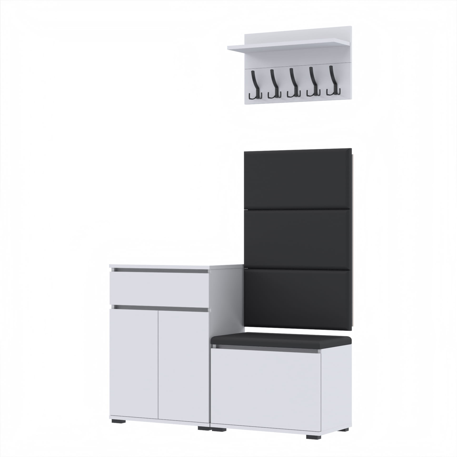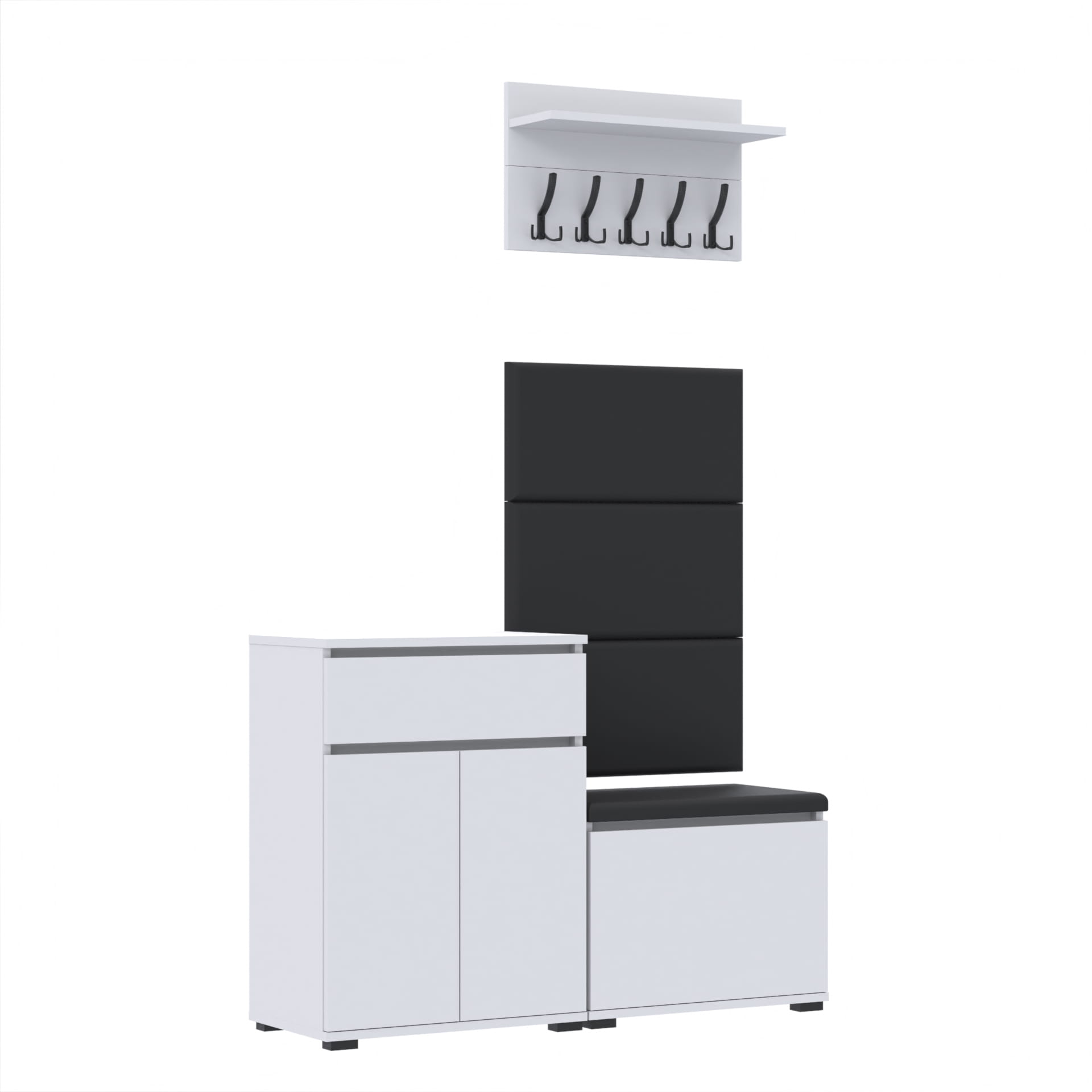 Zestaw - szafka na buty ze schowkiem, wieszak ścienny, półka, 3 panele tapicerowane.
