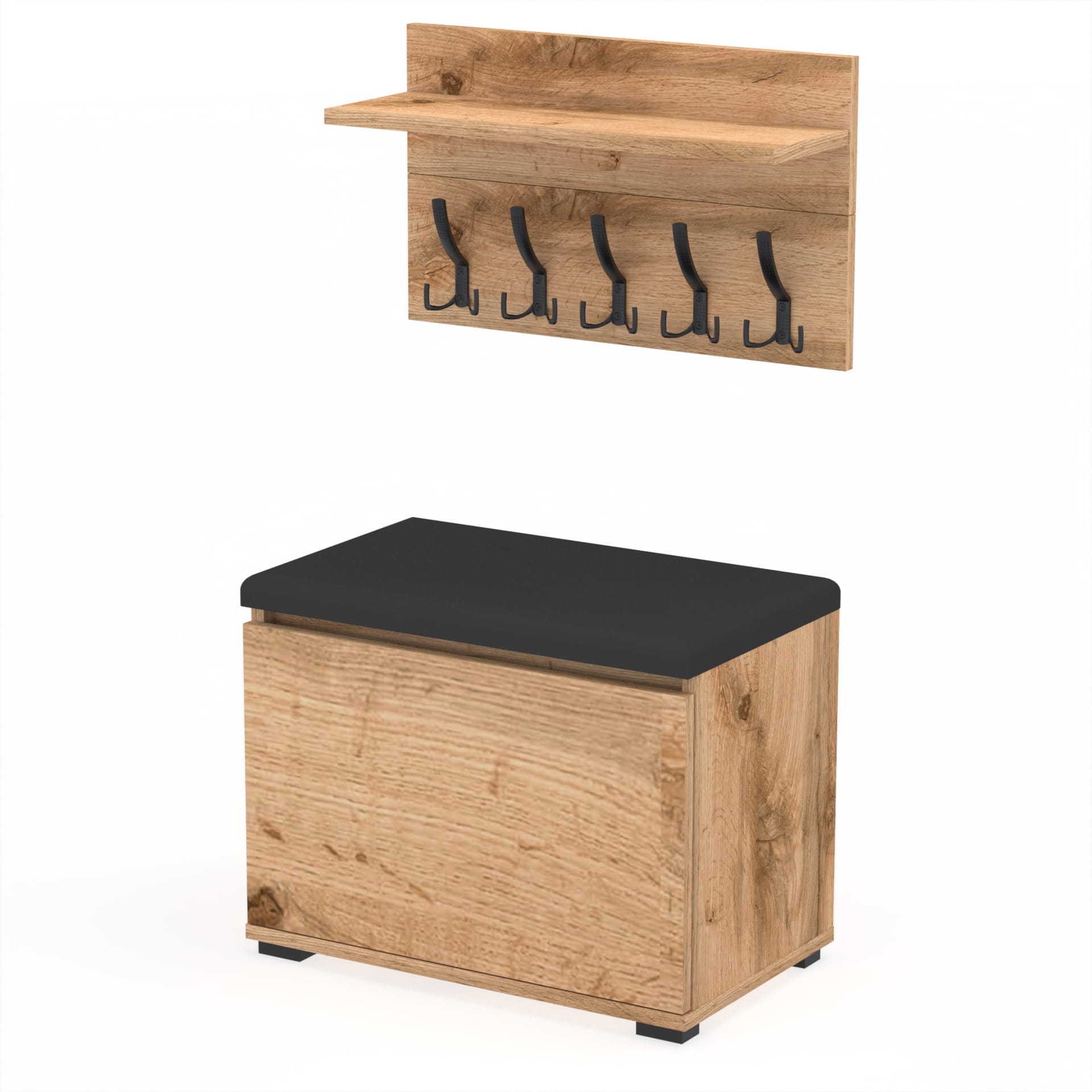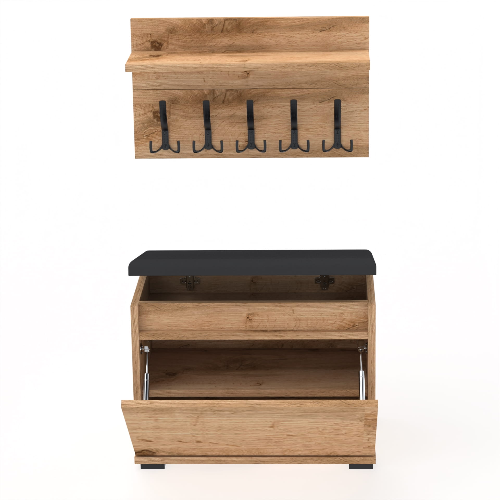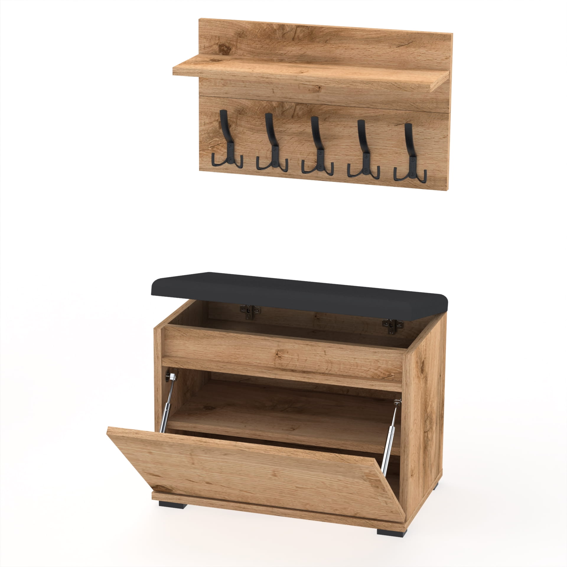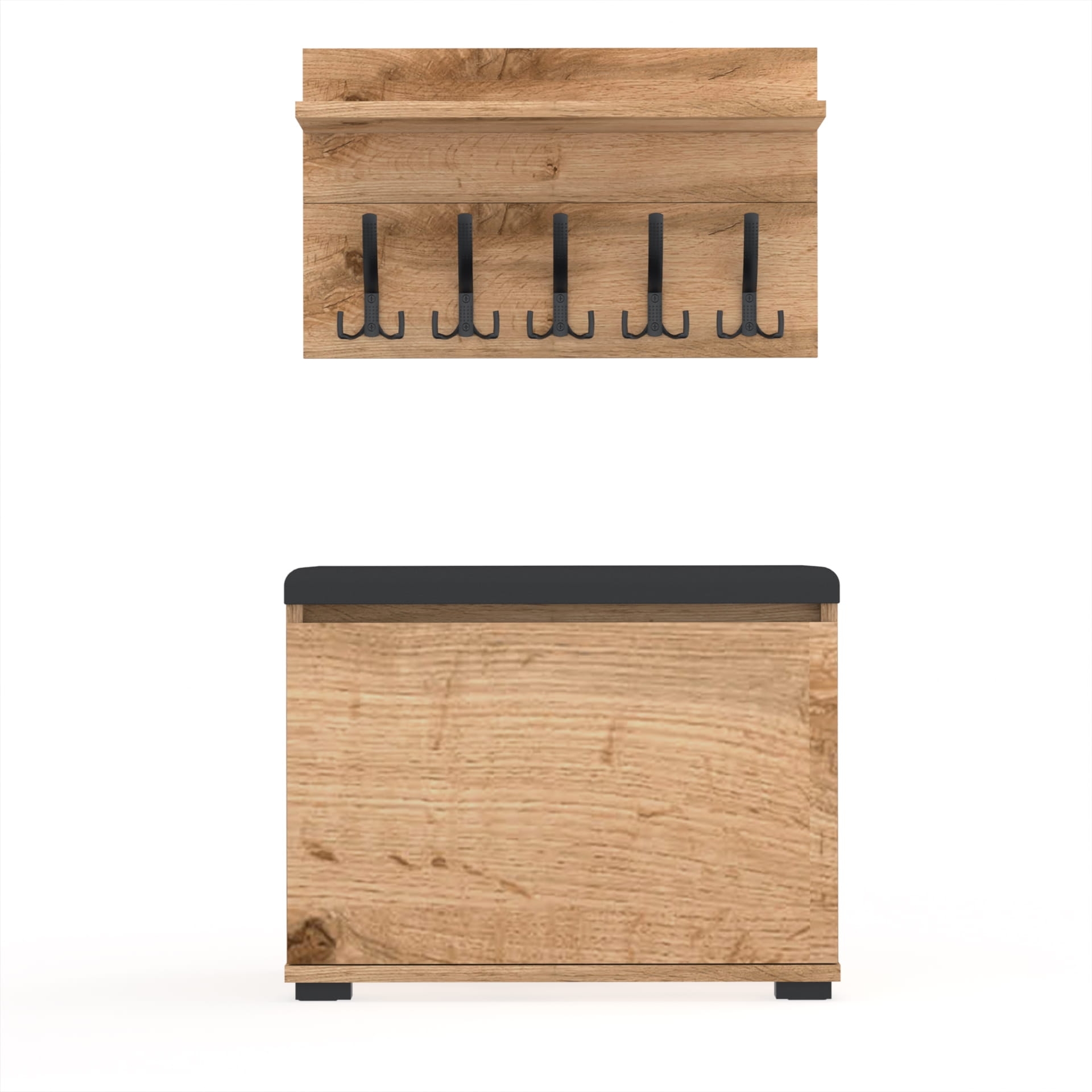 Szafka na buty z siedziskiem tapicerowanym, schowkiem plus wieszak ścienny