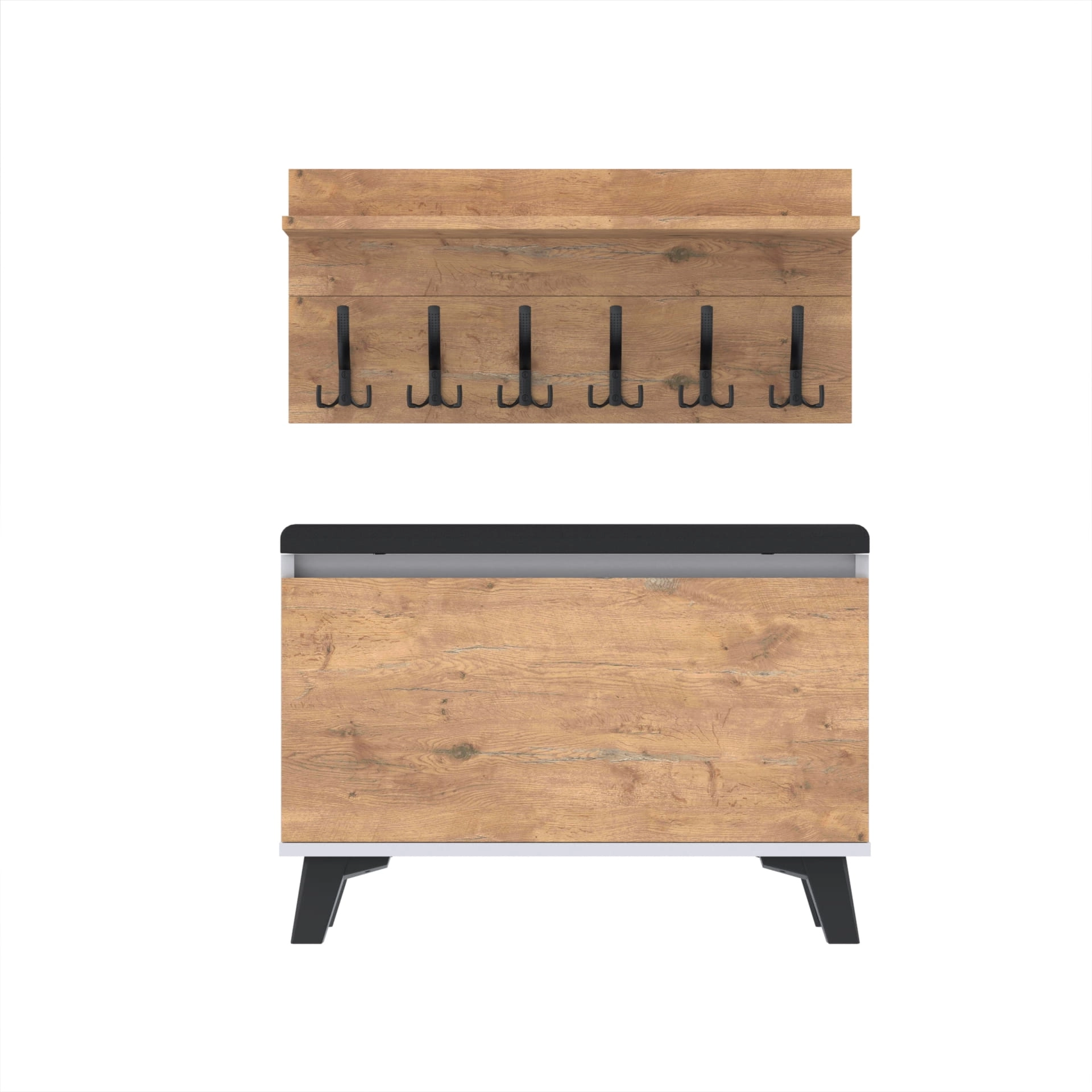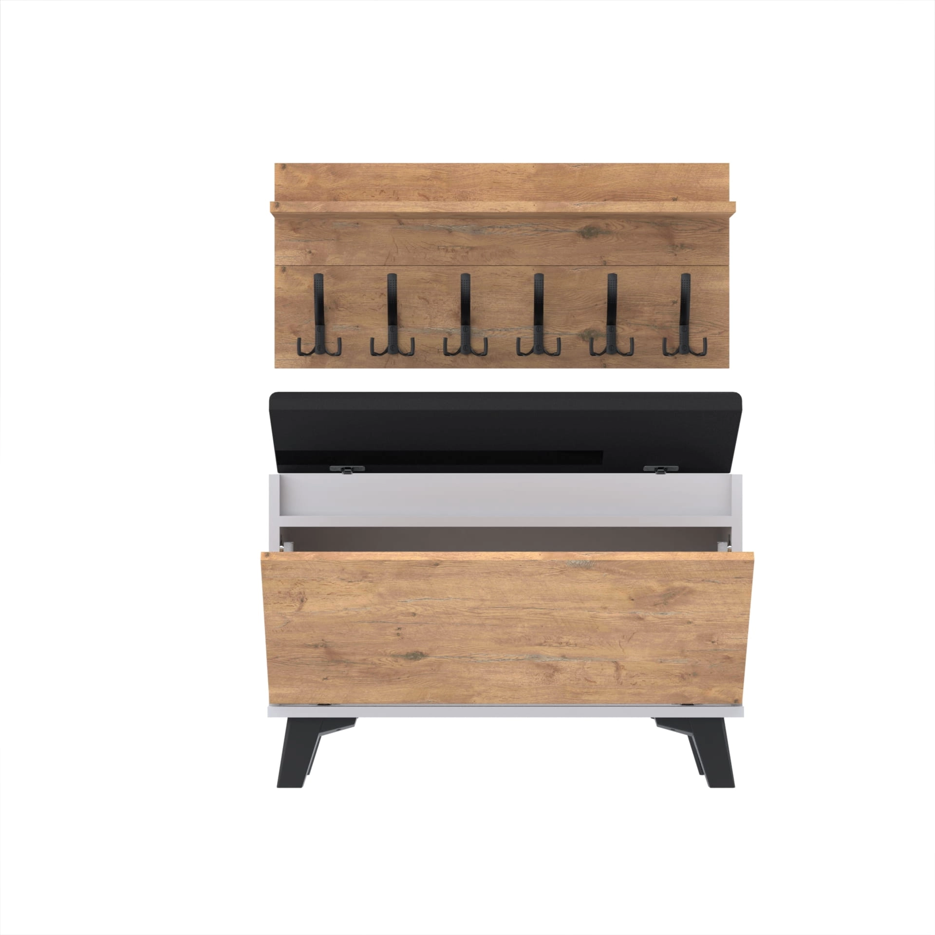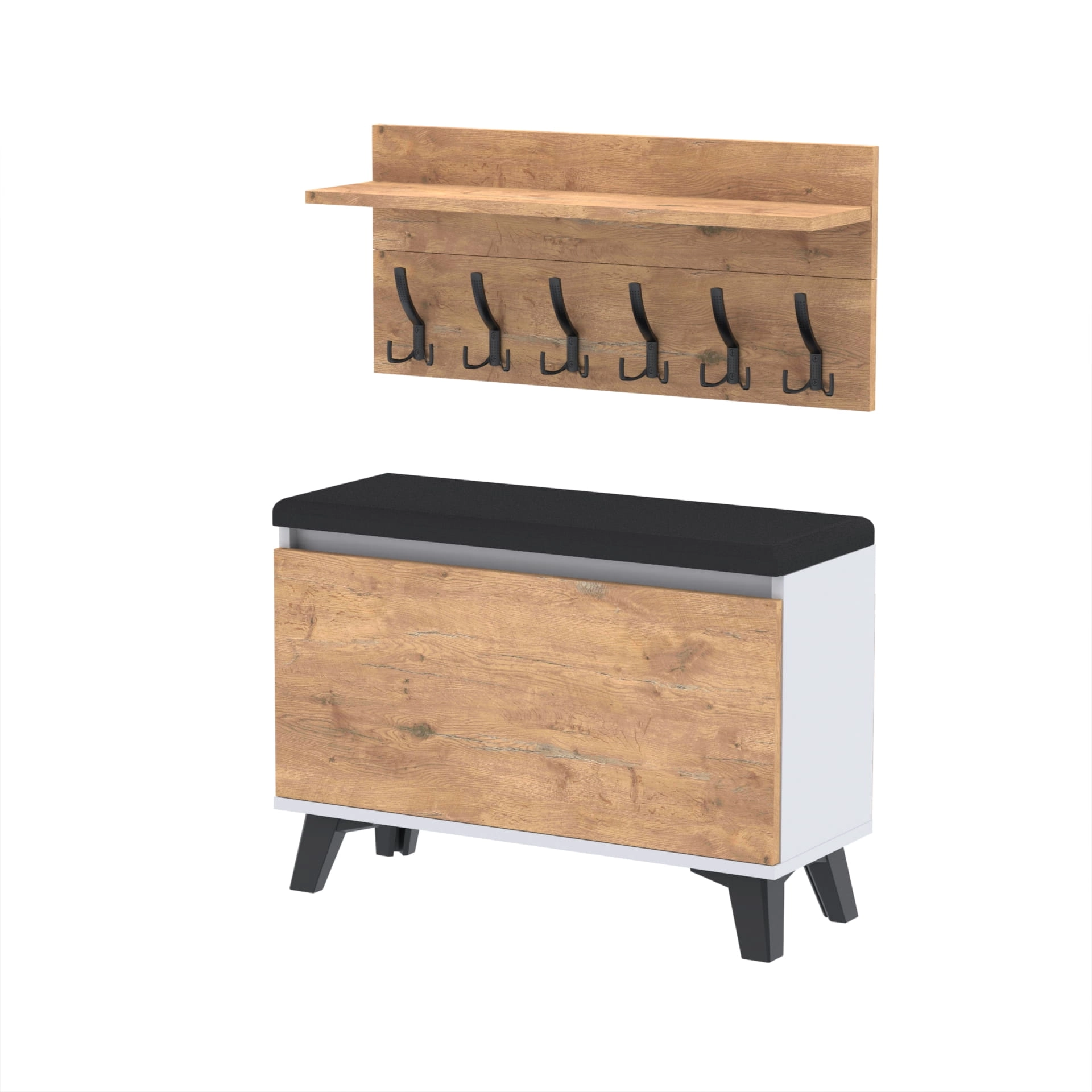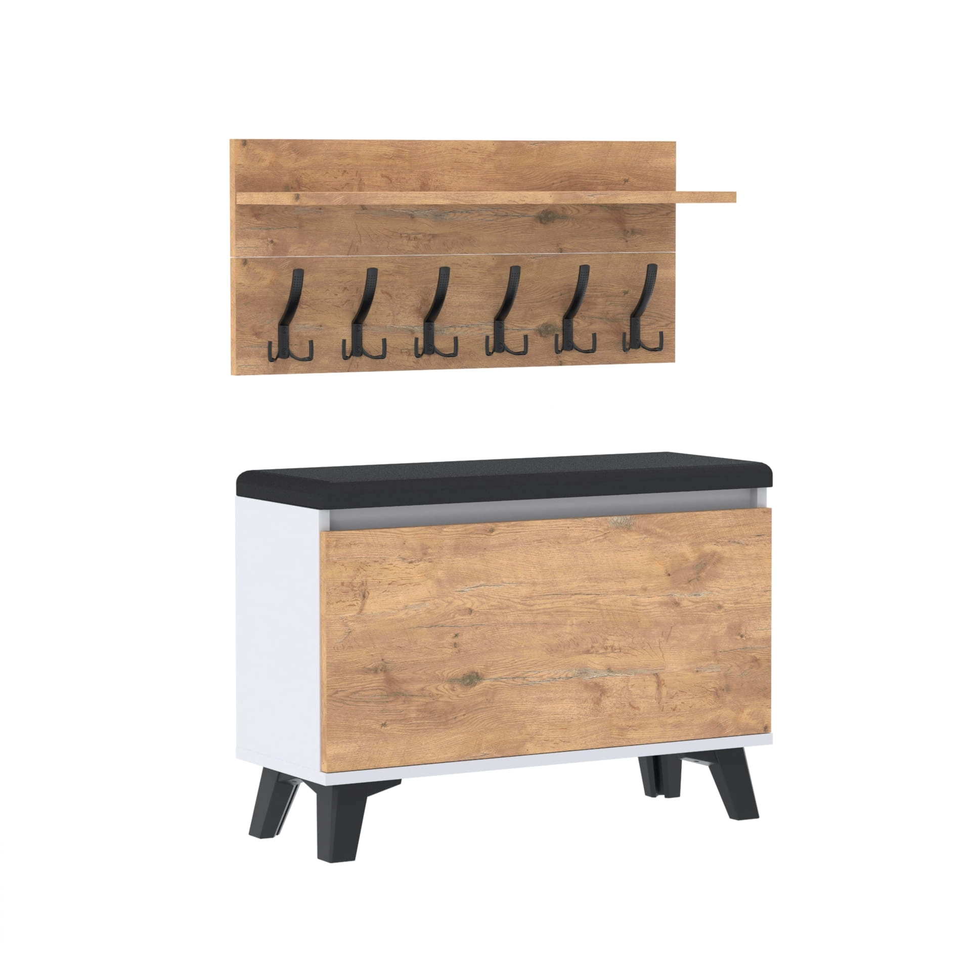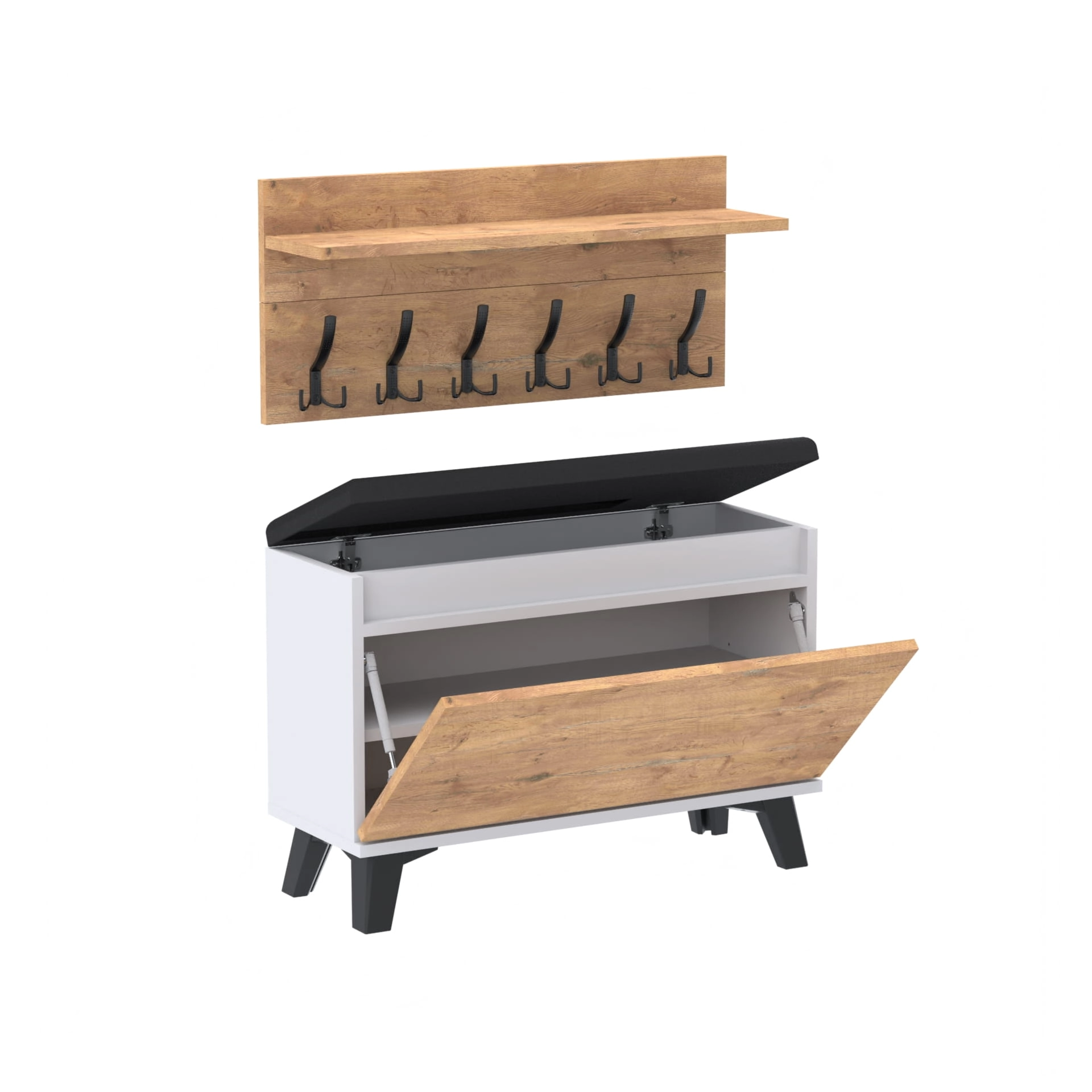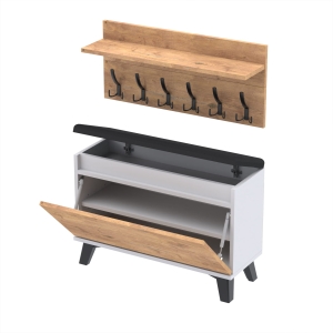 Szafka na buty z siedziskiem tapicerowanym, schowkiem plus wieszak ścienny