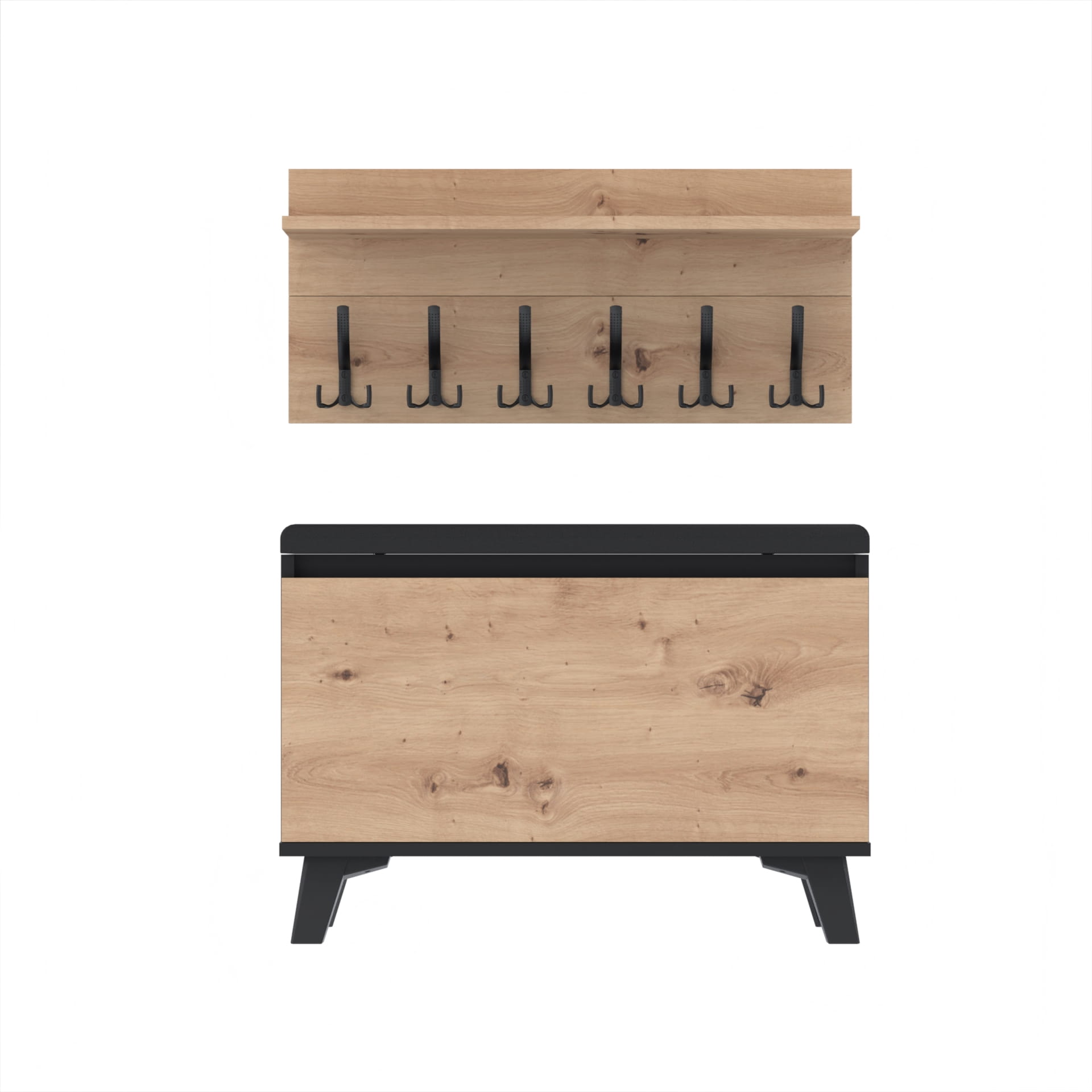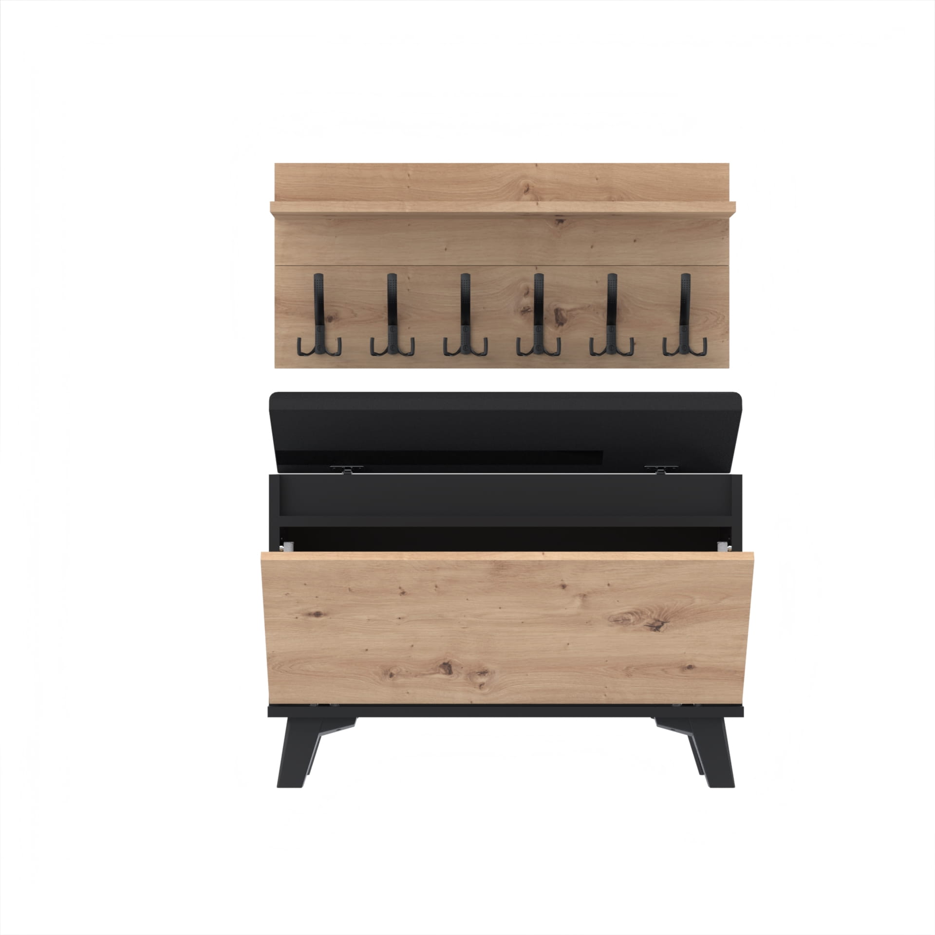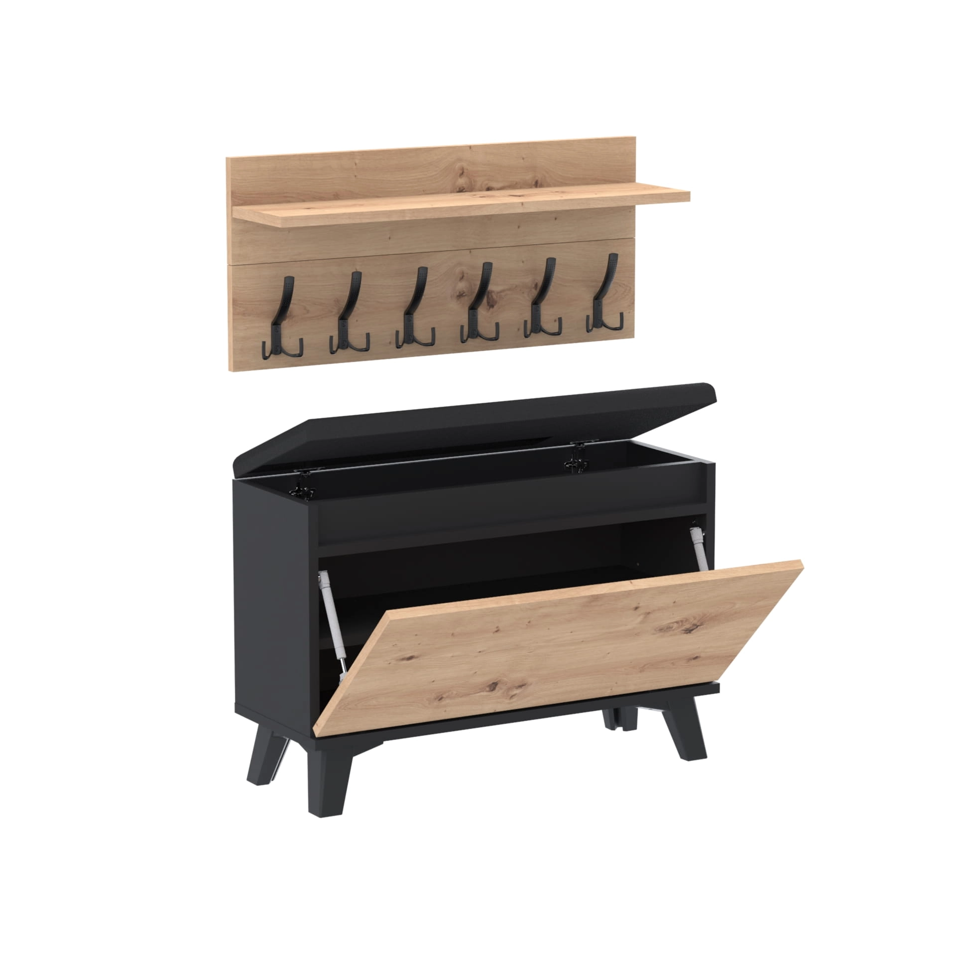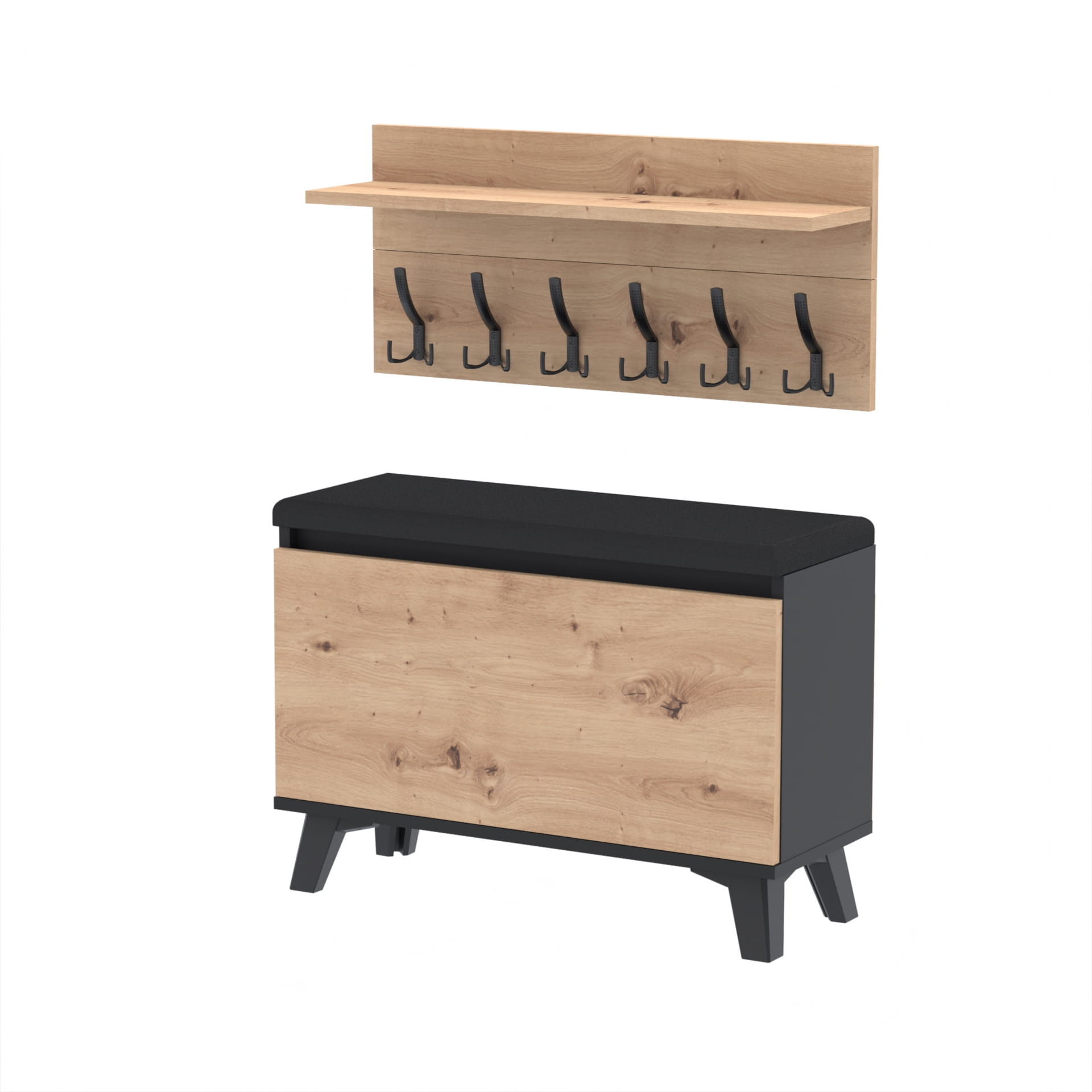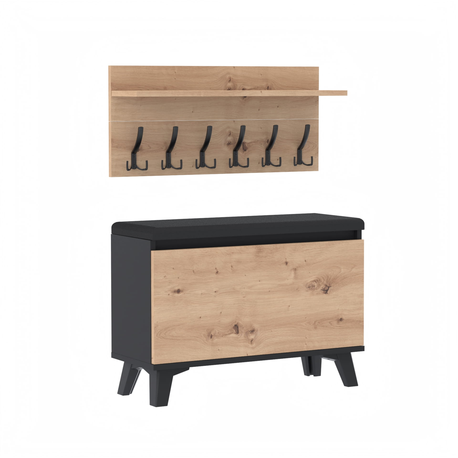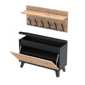 Szafka na buty z siedziskiem tapicerowanym, schowkiem plus wieszak ścienny