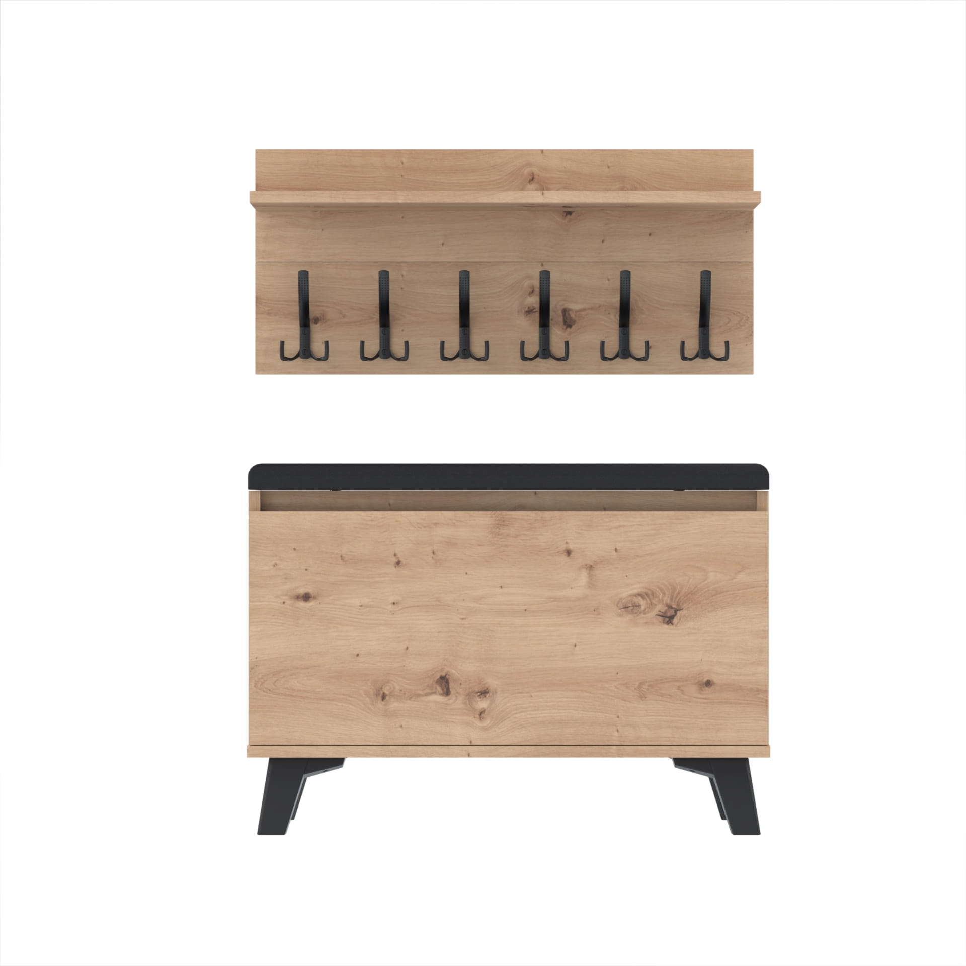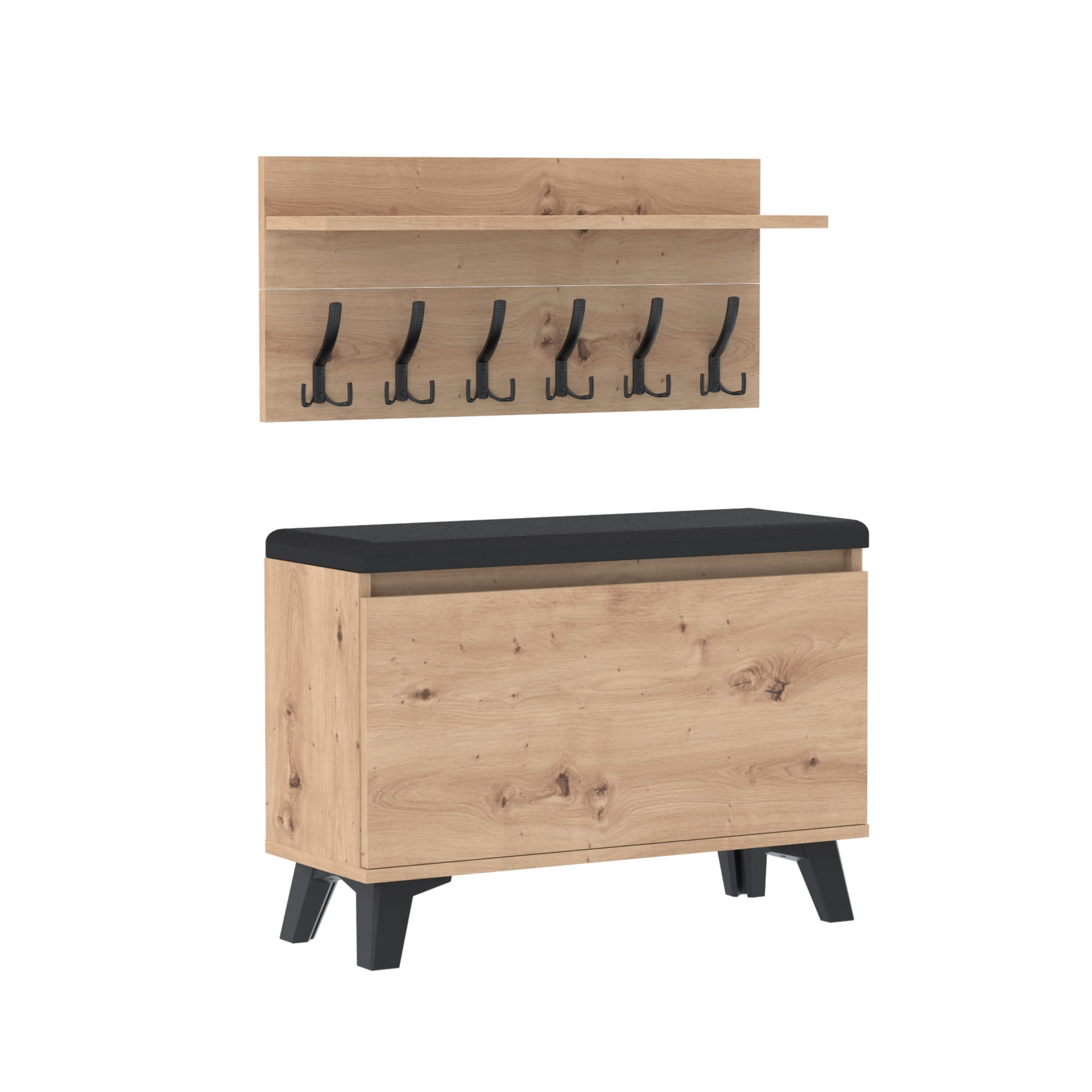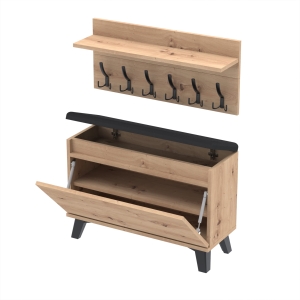 Szafka na buty z siedziskiem tapicerowanym, schowkiem plus wieszak ścienny