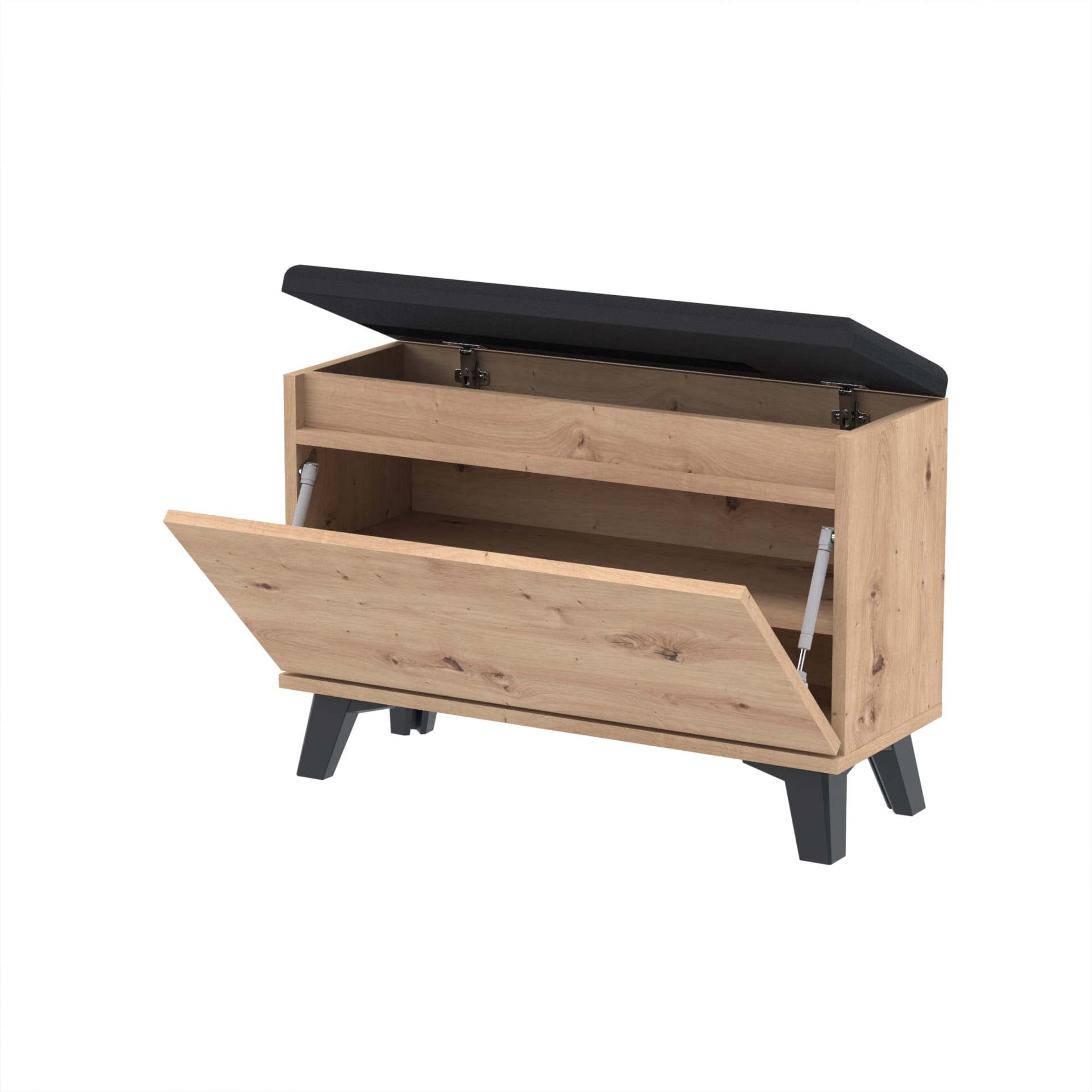 Materiał: Płyta meblowa 18mm, obrzeże ABS, okucia metalowe, nóżki 12cm z plastiku, haki wieszaka metalowe, siłowniki gazowe.